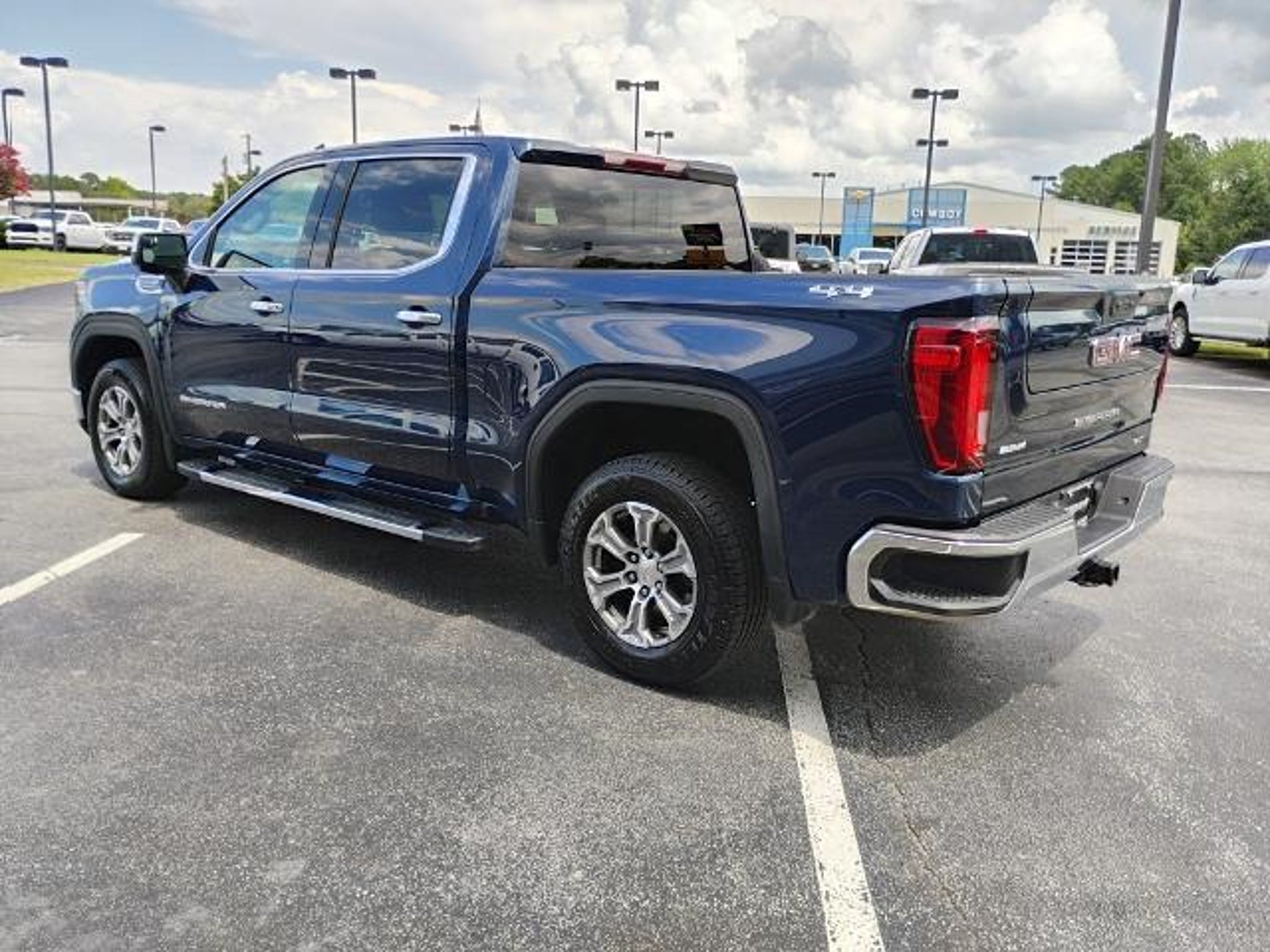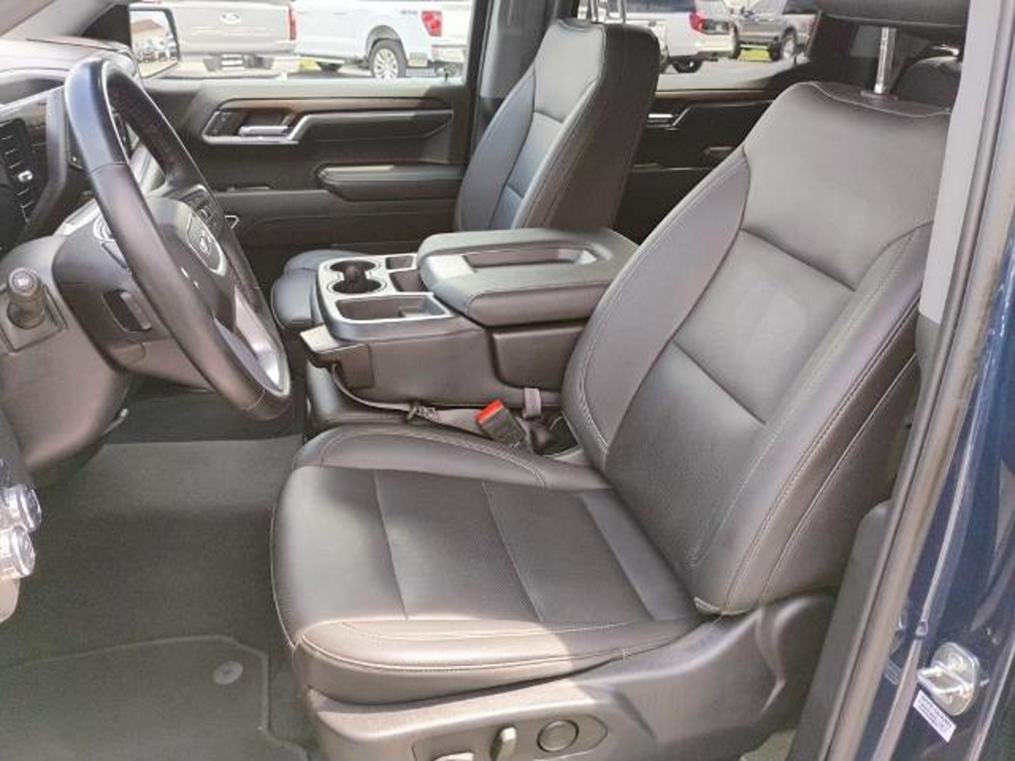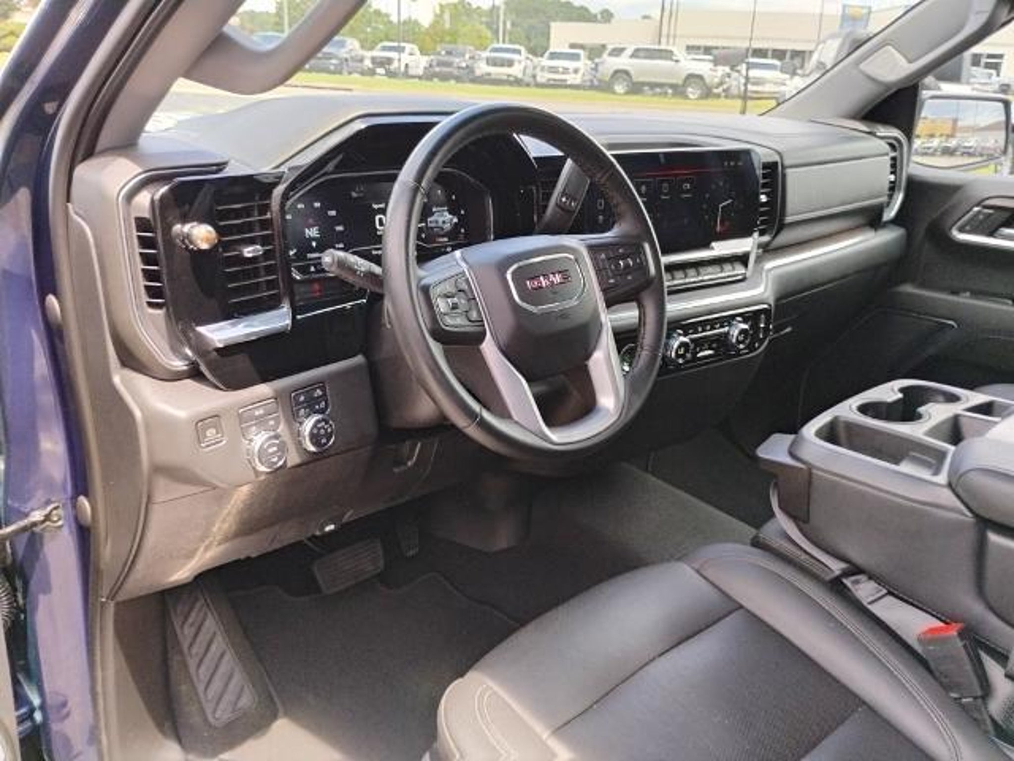 This 2023 GMC Sierra 1500 SLT in Pacific Blue Metallic comes with the following features: EcoTec3 5.3L V8 10-Speed Automatic 4WD Preferred Equipment Group 4SA (120-Volt Bed Mounted Power Outlet, 120-Volt Instrument Panel Power Outlet, 170 Amp Alternator, 2 Charge/Data USB Ports, 2 Type-C Charge-Only Rear USB Ports, 6-Speaker Audio System Feature, Auto-Locking Rear Differential, Auxiliary External Transmission Oil Cooler, Chrome Header & Chrome Grille Insert Bars, Color-Keyed Carpeting Floor Covering, Compass, Deep-Tinted Glass, Electric Rear-Window Defogger, Electrical Steering Column Lock, Front Frame-Mounted Black Recovery Hooks, Front Rainsensing Wipers, GMC Connected Access Capable, HD Rear Vision Camera, Keyless Open & Start, LED Cargo Area Lighting, Manual Tilt-Wheel & Telescoping Steering Column, OnStar & GMC Connected Services Capable, Perimeter Lighting, Power Door Locks, Power Front Passenger Windows w/Express Up/Down, Power Front Windows w/Driver Express Up/Down, Power Rear Windows w/Express Down, Push Button Start, Rear Wheelhouse Liners, Remote Vehicle Starter System, SiriusXM w/360L, Steering Wheel Audio Controls, Theft Deterrent System (Unauthorized Entry), Wi-Fi Hotspot Capable, and Wireless Phone Projection), Standard Suspension Package, Trailering Package (Hitch Guidance), 10-Speed Automatic, 4WD, Black Leather, 10-Way Power Driver Seat Adjuster w/Lumbar, 10-Way Power Passenger Seat Adjuster w/Lumbar, 3.23 Rear Axle Ratio, 4-Wheel Disc Brakes, 6 Speakers, ABS brakes, Air Conditioning, Alloy wheels, AM/FM radio, Apple CarPlay/Android Auto, Auto High-beam Headlights, Auto-dimming door mirrors, Auto-dimming Rear-View mirror, Automatic Emergency Braking, Automatic temperature control, Brake assist, Buckle to Drive, Bumpers: chrome, Delay-off headlights, Driver door bin, Driver Memory, Driver vanity mirror, Dual front impact airbags, Dual front side impact airbags, Electronic Stability Control, Emergency communication system: OnStar and GMC connected services capable, Following Distance Indicator, Forward Collision Alert, Front 40/20/40 Split-Bench Seat, Front anti-roll bar, Front Center Armrest w/Storage, Front dual zone A/C, Front fog lights, Front Pedestrian Braking, Front reading lights, Front wheel independent suspension, Fully automatic headlights, Heated door mirrors, Heated Driver & Front Outboard Passenger Seating, Heated front seats, Heated steering wheel, Illuminated entry, IntelliBeam Automatic High Beam On/Off, Lane Keep Assist w/Lane Departure Warning, Low tire pressure warning