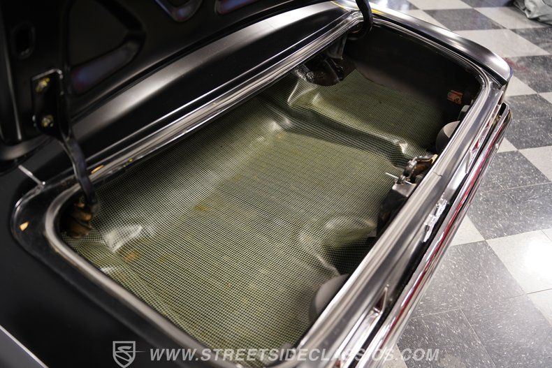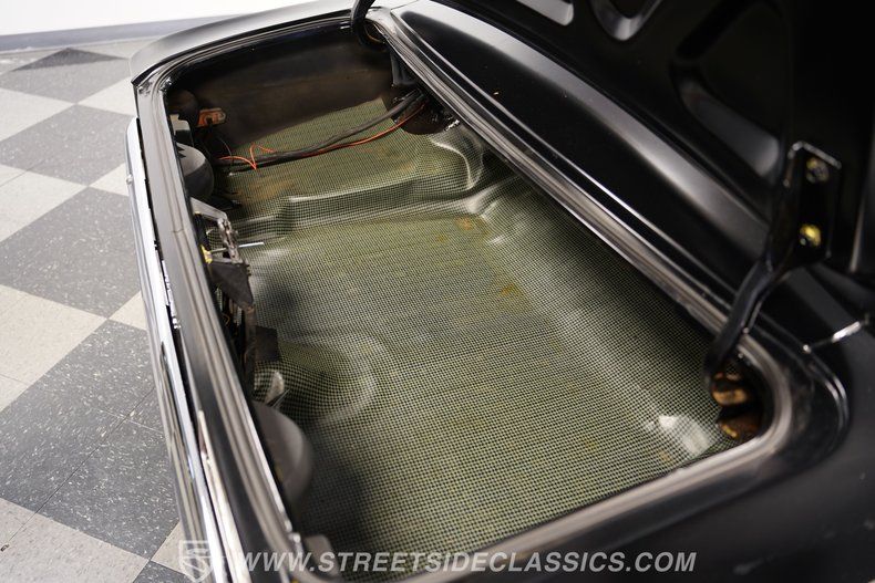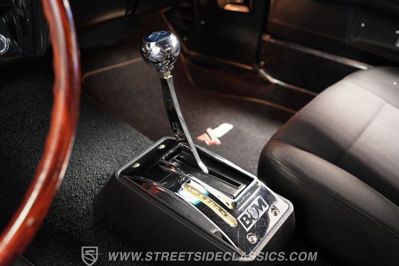 Inside, we find a nicely redone black cloth interior. A pair of late-model bucket seats equipped with headrests provides far more comfort and support than the ones they replace. A beautiful power-assisted, three-spoke woodgrain steering wheel sits ahead of a six-pod AutoMeter Carbon Fiber Ultra-Lite gauge set featuring a 160 mph speedometer, mounted in a custom carbon-fiber housing. A retro-style AM/FM/AUX head unit and Vintage Air HVAC controls look original enough not to disrupt the throwback vibe, while providing more soundtrack options and air conditioning (respectively). A B&M shifter completes the racy vibe.