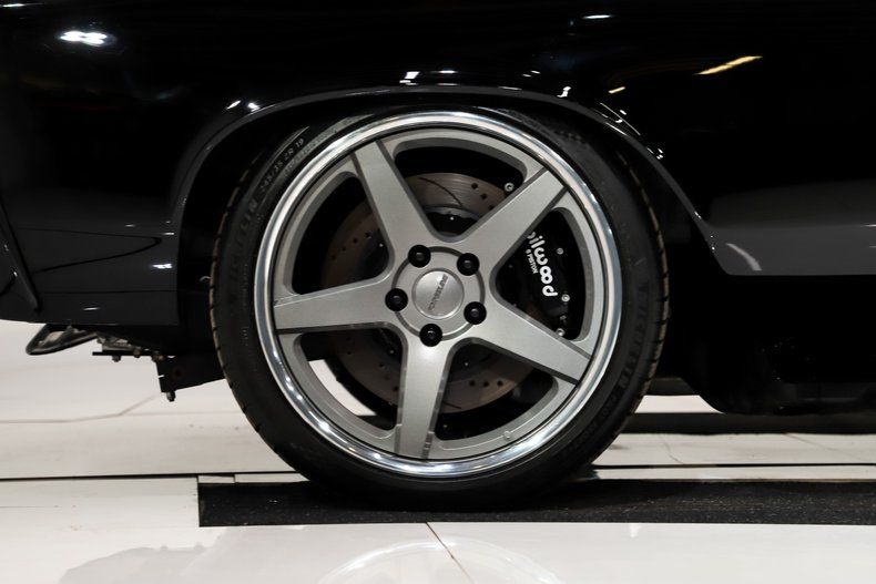 EXTERIOR: This Chevelle is a true mirror on wheels. The body has been completely smoothed and slicked out-every emblem, trunk lock, handle, antenna, and even the rain gutters have been shaved for a seamless look. Every inch of the body is straight with no bubbling, cracking, or signs of poor workmanship. Panel alignment is precise. The doors and trunk operate via remote, while the bumpers and moldings are blackout for a stealthy, aggressive appearance. The bumpers are even smoothed out and a custom front spoiler was fabricated. All the glass has been replaced, it's smoked, not stick-on tint. The car rolls on Pilot Sport tires with Forgeline wheels: 19x8s up front and 20x12s out back.