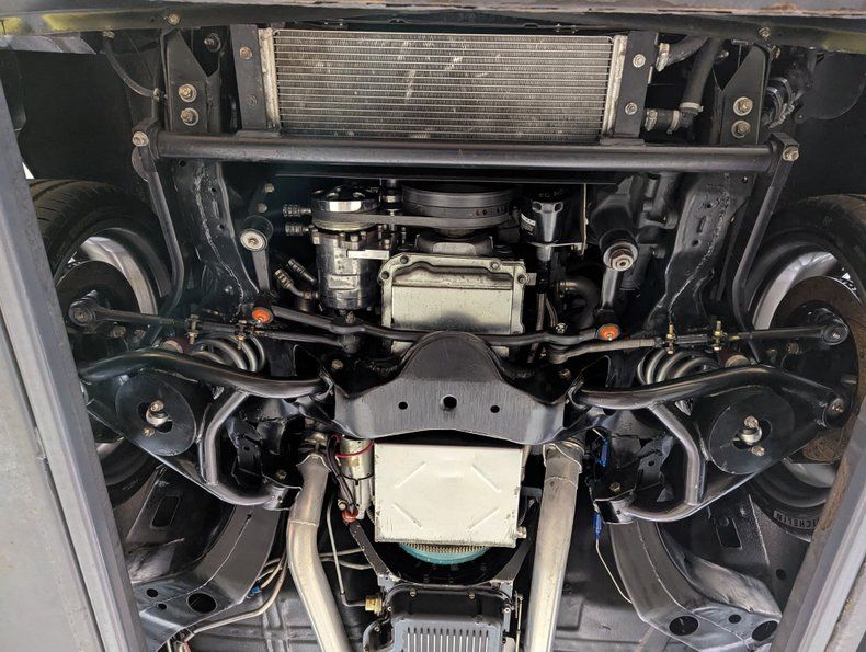 UNDERSIDE: The body was off of the frame and every item was upgraded. The front end has Heidts 2 inch drop spindles, tubular control arms, coilover adjustable gas shocks, and a splined swaybar. In back the frame was narrowed 5 inches per side, gusseted and reinforced to accommodate the wide tires. Upgraded with a 3 link system with adjustable panhard bar, adjustable control arms, coilover adjustable gas shocks, and a splined swaybar. Wilwood 4 wheel disc brakes with big drilled and slotted rotors, 6 piston calipers in front, 4 piston in back. The exhaust is custom made, ceramic coated 2.5" pipes with crossover and Flowmaster mufflers. A custom fuel tank and an Aeromotive A1000 fuel pump feeds the beast under the hood. Looking up at the motor it has an extra capacity oil pan and a high torque starter. The Turbo 400 automatic was pro built and has a 2800 stall and aluminum finned oil pan. In back is a Harrison Racing Fab 9 rear end with Detroit Locker 3.50 gears. The fabricated floors were coated in durable chip guard paint.