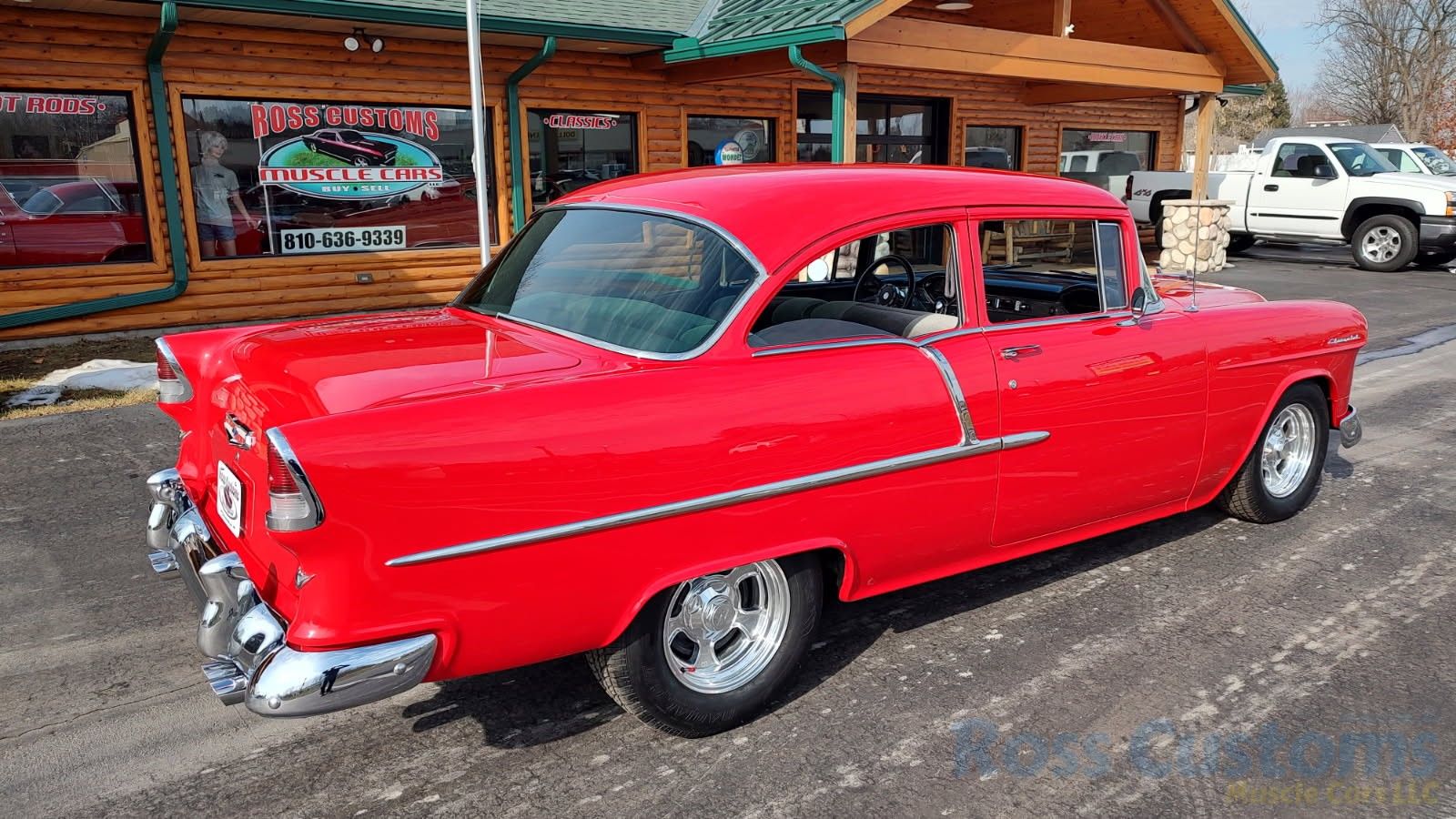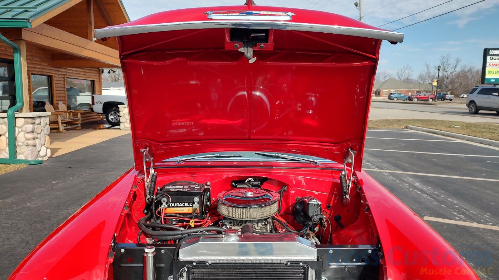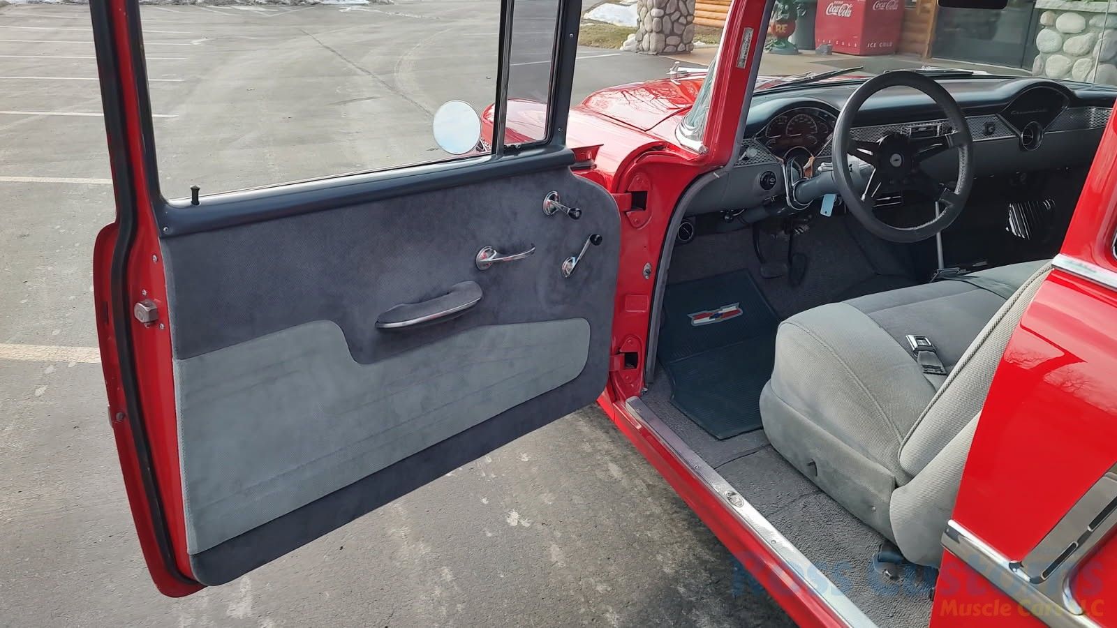 This is a slick 55 210 that has undergone a very nice custom build, done in Apple Red, basecoat clearcoat, sanded and wheeled smooth, slick as glass, at time of build had all new smoke tinted glass; as well as tinted windshield, new window rubbers, window felts and weather stripping, window stainless moldings are original and have been re-polished to a show finish; as well as upper door stainless moldings, new side view mirrors, antenna, door handles, hood jet and hood emblem, hood bar and grill side moldings look like new, stainless grill in excellent condition, lower grill molding appear to be original in very good condition, new parking lights and housings, re-chromed front bumper and bumperettes, original body side moldings have been re-polished to a show finish, new taillight and taillight bezels, new deck lid emblem, re-chromed rear bumper and bumper guards.