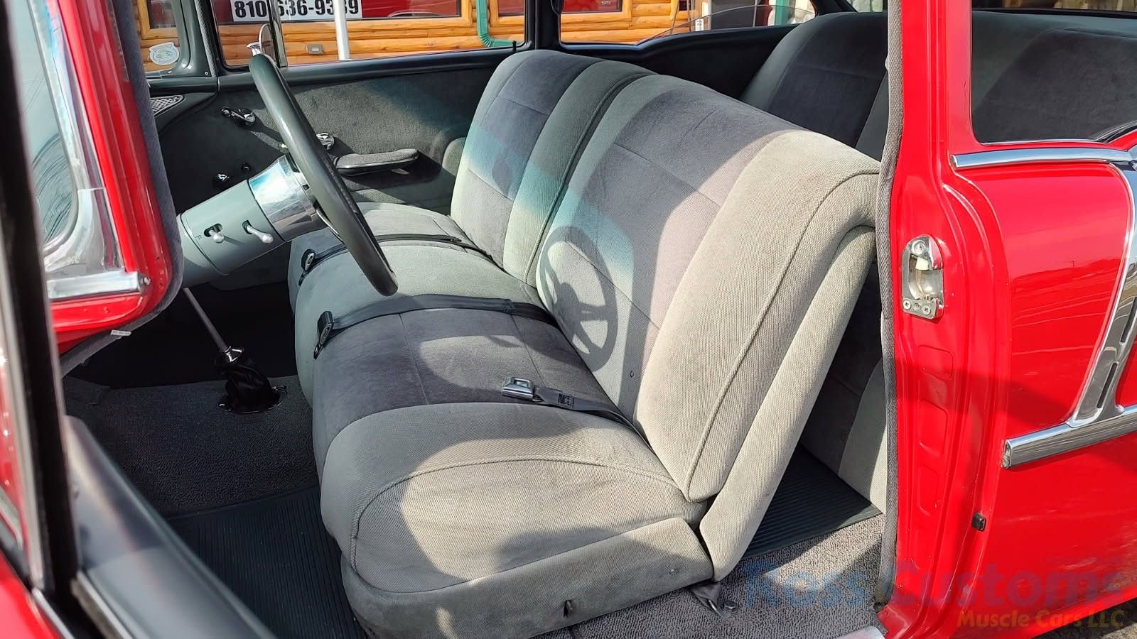Custom 2 tone gray interior, dash and garnish moldings have been re-finished, has been completely rewired with up to date harness throughout, nicely updated with Dakota digital classic look instrumentation, direct fit AM/FM stereo with IPOD capability, front and rear speakers, nicely outfitted with Vintage AC Gen 5 system, also updated with Newport multi-speed wipers, Flaming River tilt steering column, Lokar steering wheel, at time of build had new headliner and visors, package shelf, custom front and rear door panels; as well as kick panels, original front and rear seats have also been custom upholstered, updated with front and rear seat belts, nicely outfitted with Lokar shifter, new carpet, deluxe floor mats, new sill plates, trunk has also been upholstered to match.