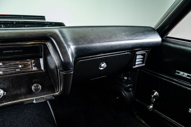 The body was restored to a high standard and refinished in its striking Cranberry Red, a color that perfectly complements the aggressive 1970 sheetmetal. Painted black stripes stretch across the cowl induction hood and decklid, emphasizing the Chevelle's squared shoulders and muscular proportions. Panel alignment is tight, chrome and trim present cleanly, and the car retains the visual authority that has made the 1970 Chevelle the definitive body style of the generation. Radial tires have been fitted for improved drivability while maintaining the car's period-correct stance.