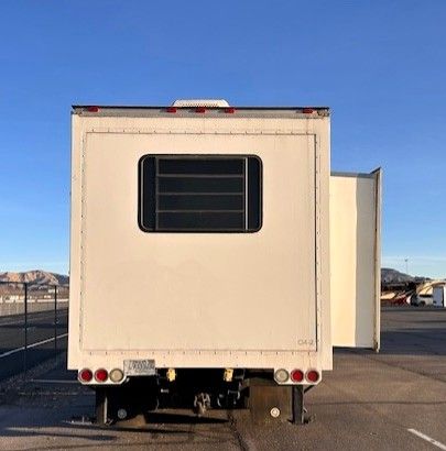 Custom made 31' Coach by Quixote, a producer of Luxury Trailers, sound stages and production vehicles. The Coach is very well made with a heavy duty structure. The front slide is 8'7" and the rear slide is 12'3". There is a half bath and three A/C units and comes with a 20kw Kohler generator with 415 hours. The truck is equipped with an L10 Cummins engine and an 8 speed transmission. 33,200 GVW with 10,000lb Tag axle. Original miles on the truck are 157,400. The overall length is 39' and this truck will pull any size of trailer and cruises at 70-75 mph. Pull your trailer and toys down the road in style.