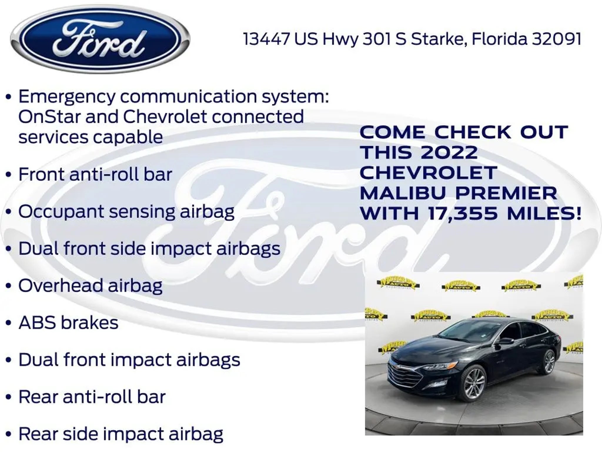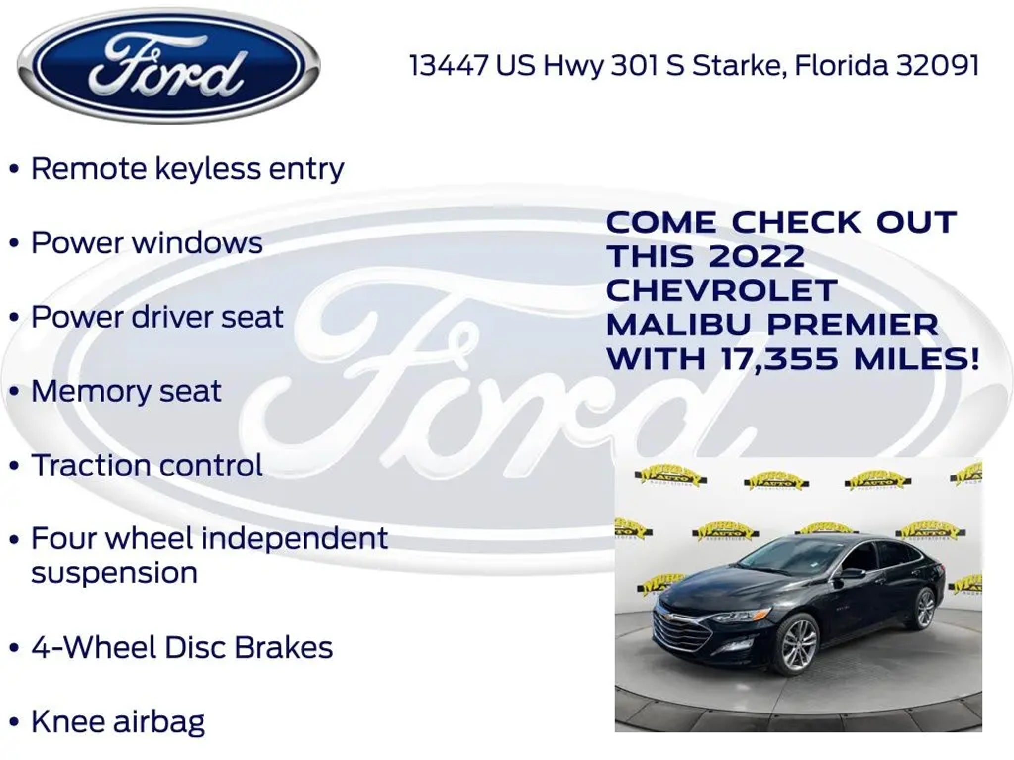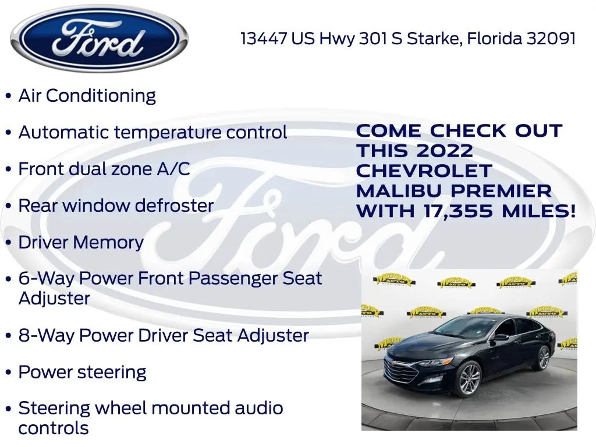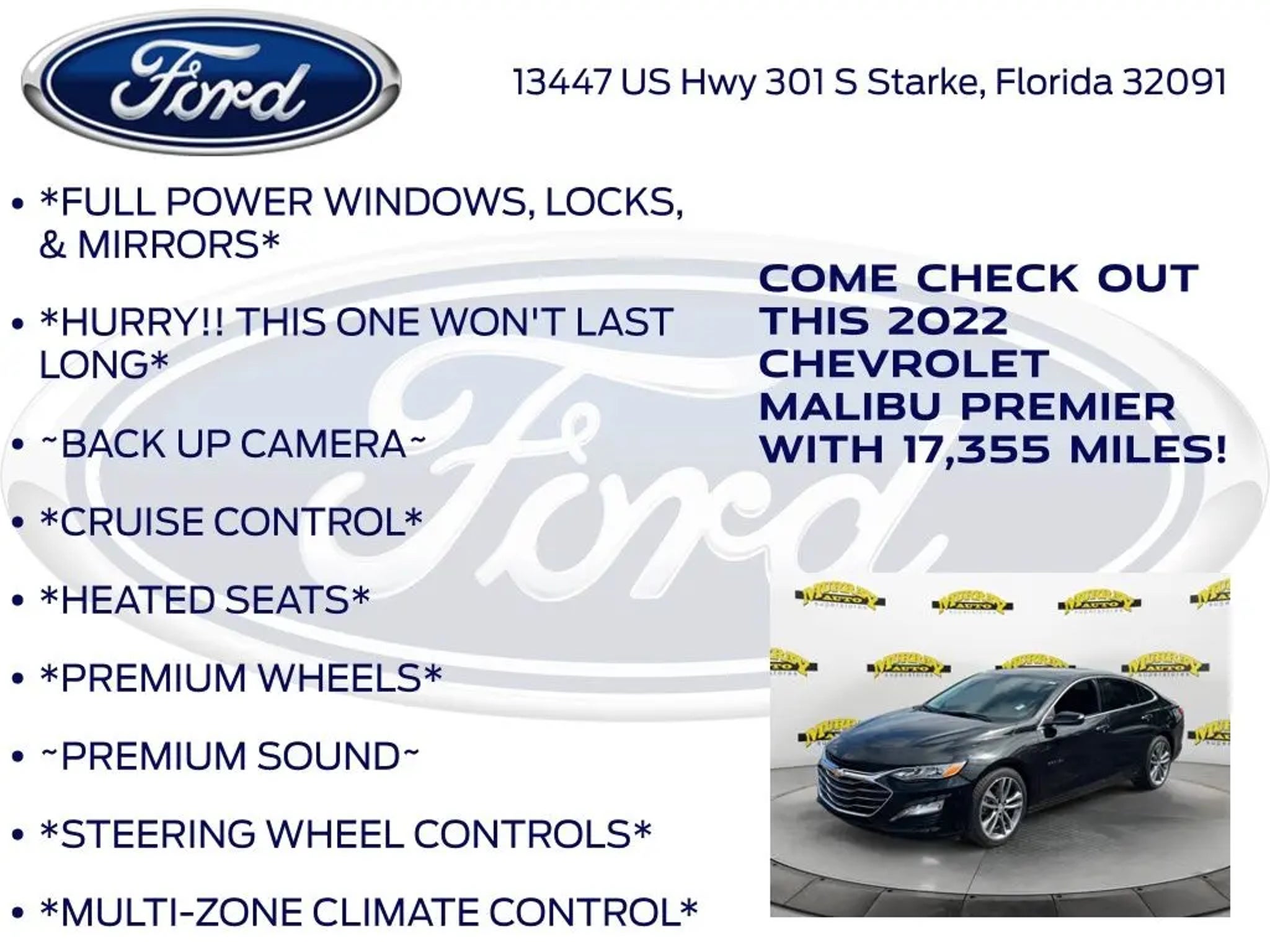 Priced below KBB Fair Purchase Price! Murray Ford Superstore of Starke is proud to offer this superb-looking 2022 Chevrolet Malibu in Mosaic Black Metallic This vehicle is readily available and comes with the following Preferred Equipment Group 2LZ, Black Leather, 19 Aluminum Wheels, 4-Wheel Disc Brakes, 6-Way Power Front Passenger Seat Adjuster, 8-Way Power Driver Seat Adjuster, 9 Speakers, ABS brakes, Air Conditioning, Alloy wheels, AM/FM radio: SiriusXM, Auto-dimming Rear-View mirror, Automatic temperature control, Bose Premium 9-Speaker System, Brake assist, Bumpers: body-color, Compass, Delay-off headlights, Driver door bin, Driver Memory, Driver vanity mirror, Dual front impact airbags, Dual front side impact airbags, Electronic Stability Control, Emergency communication system: OnStar and Chevrolet connected services capable, Exterior Parking Camera Rear, Four wheel independent suspension, Front anti-roll bar, Front Bucket Seats, Front Center Armrest, Front dual zone A/C, Front Passenger Power Lumbar Seat Adjuster, Front reading lights, Fully automatic headlights, Heated door mirrors, Heated front seats, Heated rear seats, Heated steering wheel, Illuminated entry, Knee airbag, Leather Shift Knob, Low tire pressure warning, Memory seat, Navigation System, Occupant sensing airbag, Outside temperature display, Overhead airbag, Overhead console, Panic alarm, Passenger door bin, Passenger vanity mirror, Perforated Leather-Appointed Seat Trim, Power door mirrors, Power Driver Lumbar Control Seat Adjuster, Power driver seat, Power moonroof, Power passenger seat, Power steering, Power windows, Premium audio system: Chevrolet Infotainment 3 Plus, Radio data system, Radio: Chevrolet Infotainment 3 Plus System w/Navi, Rear anti-roll bar, Rear reading lights, Rear seat center armrest, Rear side impact airbag, Rear window defroster, Remote keyless entry, Security system, SiriusXM Radio, Speed control, Split folding rear seat, Steering wheel mounted audio controls, Tachometer, Telescoping steering wheel, Tilt steering wheel, Traction control, Trip computer, Turn signal indicator mirrors, USB Charging-Only Port, Variably intermittent wipers, Voltmeter, and Wireless Apple CarPlay/Android Auto; 15 Year 150,000 mile warranty at no cost applies to all vehicles excluding Transit Vans, DRW Trucks, any SVT Models, or similar vehicles. See sales for details! All vehicles will have a $999.00 dealer fee added to the total sale price (excludes A,Z,D, and X plan customers). Taxes, tag, title fees and a $125 Electronic filling fee will be added to all vehicles in accordance with state laws of customers registering address. *** We make every effort to provide you with the most accurate, up-to-the-minute information, however it is your responsibility to verify with the Dealer that all details listed and installed options are accurate for this specific vehicle. To ensure accuracy, please contact the dealership to verify the exact options, features and programs that are included and are available for this specific vehicle prior to purchase. Price Does not Include any dealer installed options or accessories. *Dealer Discount includes $1000 Finance Bonus Cash and $1000 Trade-In Bonus Cash*