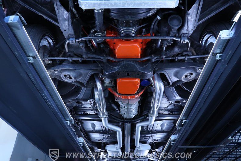 Step inside and discover a cabin that balances vintage style with comfort. The black vinyl seats are in excellent condition, inviting you to settle in for the ride. Both the door panels and headliner look fresh and crisp, while the dashboard maintains its classic appeal with only the most subtle signs of age. The center console features a chrome Hurst shifter, and a retro sound radio with modern touches ensures you enjoy every mile with your favorite tunes. An aftermarket tachometer sits neatly under the dash, ready for spirited drives.