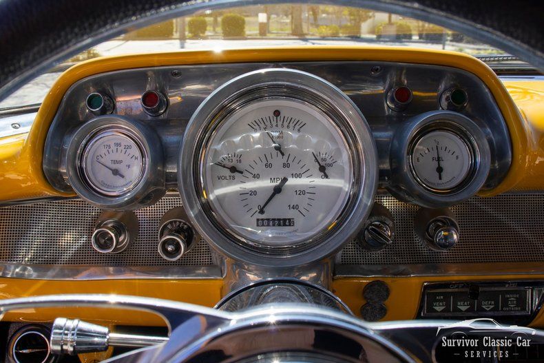 The interior is custom, but not to extreme. That Bright Yellow and Polished Chrome can be seen throughout. A Billet 1/2 Wrapped Steering Wheel attached to the Tilt Steering Column. This 1957 210 was completed 12-years ago, and has been used a just a "Weekend Show Car or Sunday driver" ... The. 4K Miles proves how clean & "new" the the interior still is. The Seating has been swapped out with a 1963 Impala Front Buckets & Rear Bench. And the Audio is sharp with a Clean Alpine Install.