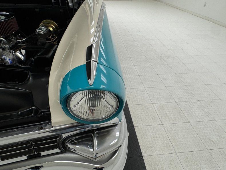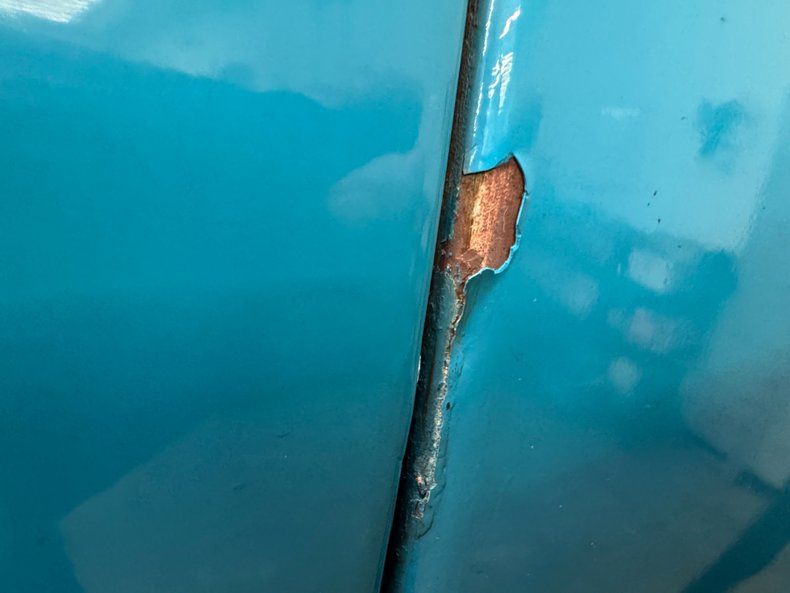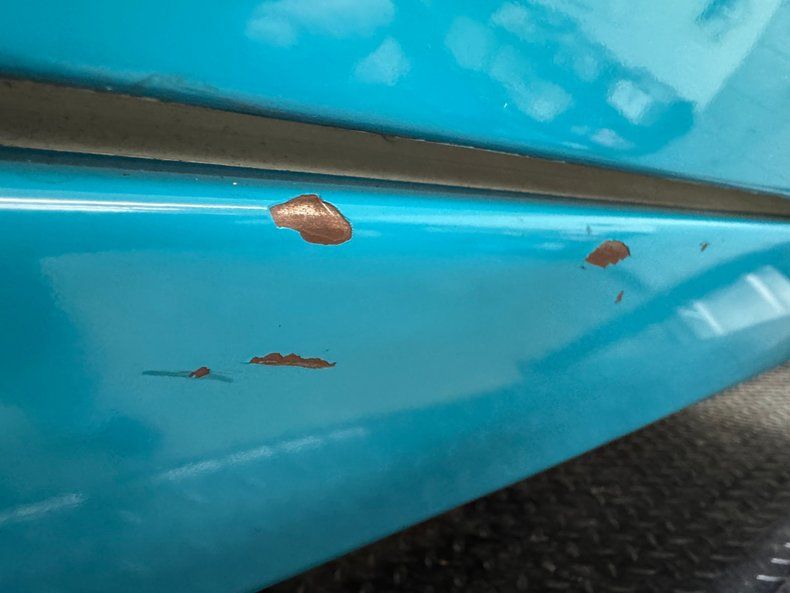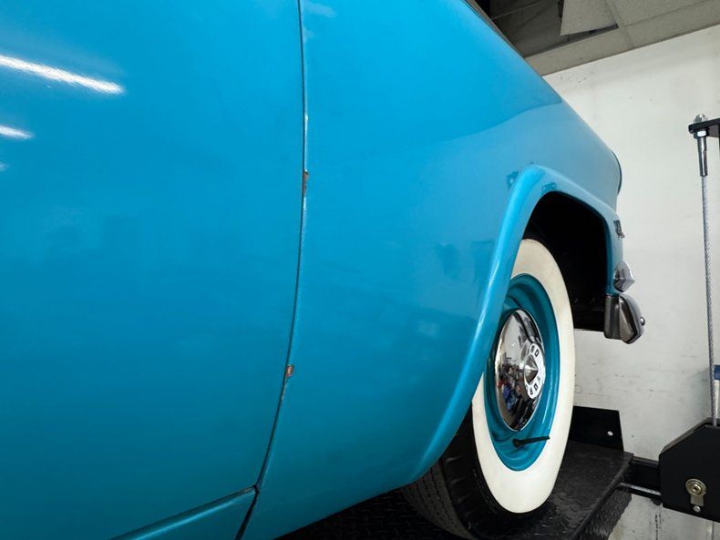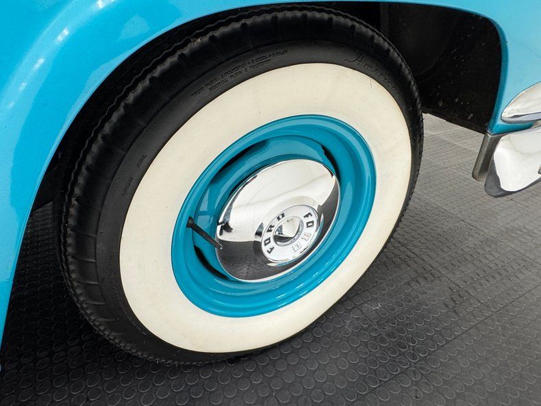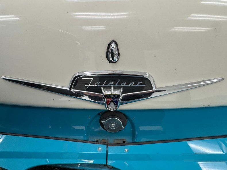 With a blending of Peacock Blue and Colonial White this car takes classic 50's configuration to a new level. The two tone layout is bordered by the use of a chrome side spear swoop, chrome window surrounds which culminate in the legendary picnic basket handle band of chrome that bridges the roofline. From the front of the hood cloisonn© shield, to the jet age hood ornament, and Fairlane scripted badging add to the artful design. On the back, the rear is graced with a Continental kit, nice and wide and housing a metal two tone white and blue tire case. Exhaust tips are through the bumper back here as well, an epic design element that never gets old! Wide whites with dish caps and more shields are sitting on all 4 corners, with a ring of body matched paint in the steel wheels. Imperfections include random paint chips throughout, an area of oxidation under the slightly pitted chrome of the bumper, blistering on the door and other areas, peeling and uneven paint on the fender skirt, and a number of edge chips.