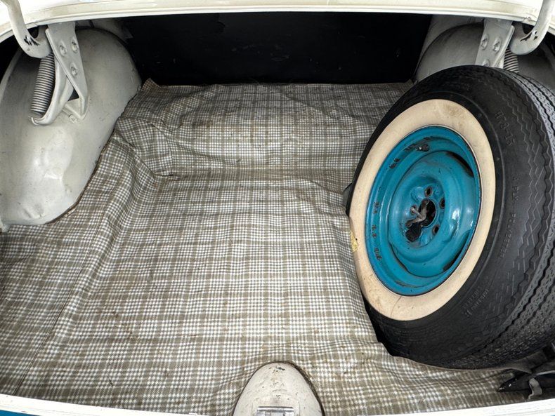 We open the doors to find a handsome layout of gray, white, silver, and Peacock Blue in wonderful shape and the driver's door adorned with an electric window switch panel. The split bench is a showy masterpiece of diamond stitched gray inserts in white framing and the matching armrest with cup holders is a nice touch. The seat shape, materials and condition is mirrored in the back and it's all over a clean mottled gray carpet. Up front, it's the Peacock Blue that dominates with hard, glossy surfaces and gauges tucked under an arching cove and within a white panel. In the center, there's an AM radio and A/C panel and the perforated headliner above is bisected by the bottom side of the picnic basic trim. Our trunk has a vinyl plaid mat over the steel floor with a cutout that is home to a spare wheel.