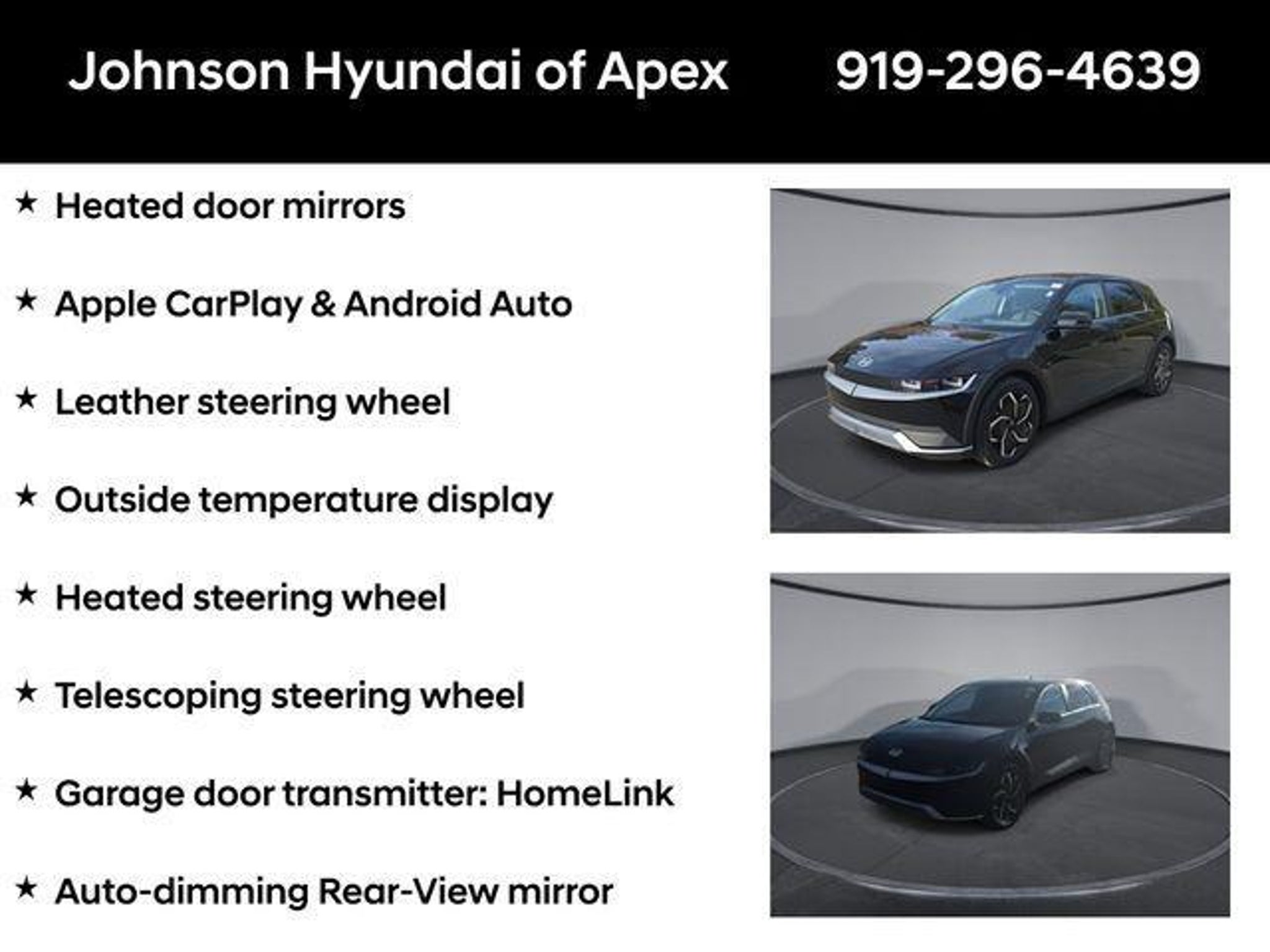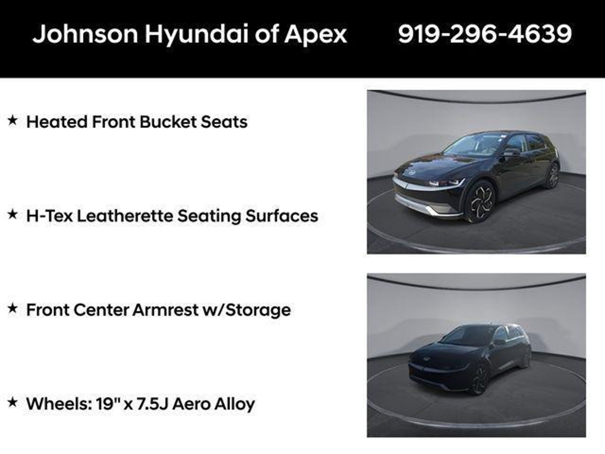 2022 Hyundai IONIQ 5 SEL Phantom Black RWD 1-Speed Automatic New Price! Certified. Apple CarPlay & Android Auto, Auto-dimming Rear-View mirror, Automatic temperature control, Front Center Armrest w/Storage, Front dual zone A/C, Fully automatic headlights, Garage door transmitter: HomeLink, H-Tex Leatherette Seating Surfaces, harman/kardon® Speakers, Heated door mirrors, Heated Front Bucket Seats, Heated steering wheel, Leather steering wheel, Navigation System, Option Group 01, Outside temperature display, Power driver seat, Power Liftgate, Telescoping steering wheel, Wheels: 19 x 7.5J Aero Alloy. BENEFITS OF HYUNDAI CERTIFIED PRE-OWNED VEHICLES: Hyundai Certified Pre-Owned (CPO) vehicles come with a manufacturer's warranty, are high quality, and in like-new condition! But not every Hyundai makes the Cut! All Hyundai Certified Pre-Owned vehicles must be five (5) model years or newer, with less than 80,000 miles. They must also pass a comprehensive 173-point quality assurance inspection and have a clean, non-branded title as verified by a CARFAX Vehicle History ReportTM. Every CPO Hyundai provides the Following Additional Value!: *10 Years / 100k Mile Limited Powertrain Warranty! *10 Year Unlimited Mileage Roadside Assistance and Travel Protection with Rental Car at No Charge! *Free Vehicle Carfax Report! *3 Month All Access No Cost Trial of Sirius XM Radio! **That is $2,000 of Additional Value! More than Ever Before!! ***ALL NEW HYUNDAIS COME WITH 3 YEARS / 36,000 MILE COMPLIMENTARY MAINTENANCE!!!*** Price Requires Manufacture Lender Standard Financing *Price plus dealer installed accessories.**Please see dealer for details. Price Requires Manufacture Lender Standard Financing *Price plus dealer installed accessories.**Please see dealer for details.