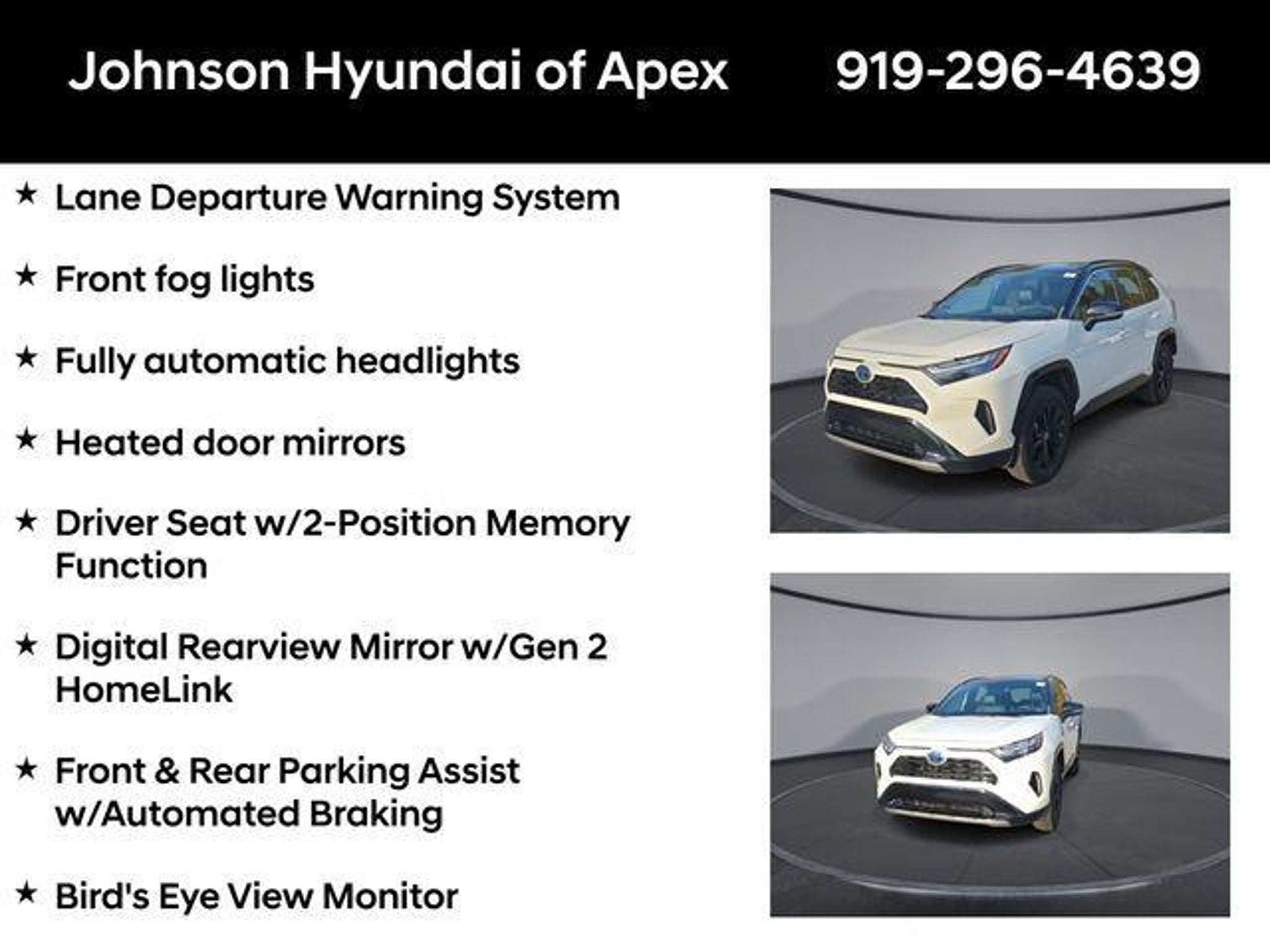 2022 Toyota RAV4 Hybrid XSE Blizzard Pearl/Midnight Black Metallic AWD eCVT Recent Arrival! **CERTIFIED BY CARFAX- NO ACCIDENTS AND ONE OWNER!**, Apple CarPlay/Android Auto, Auto-dimming Rear-View mirror, Automatic temperature control, Bird's Eye View Monitor, Blind Spot Monitor, Digital Rearview Mirror w/Gen 2 HomeLink, Driver Seat w/2-Position Memory Function, Front & Rear Parking Assist w/Automated Braking, Front dual zone A/C, Front fog lights, Fully automatic headlights, Garage door transmitter: HomeLink, Heated 3-Spoke Leather Steering Wheel, Heated door mirrors, Heated Front Seats, Intelligent Clearance Sonar (ICS), Lane Departure Warning System, Leather Shift Knob, Panoramic Glass Roof, Power driver seat, Power Liftgate, Qi-Compatible Wireless Smartphone Charging, Radio: Audio Plus w/JBL, Rain Sensing Front Wipers, Smart Key System w/Push Button Start, SofTex Seat Trim (EC), Telescoping steering wheel, Wheels: 18 x 7.0J Black-Painted Aluminum Alloy, Wiper Deicer, XSE Advanced Technology Package, XSE Grade Weather Package. BENEFITS OF HYUNDAI CERTIFIED PRE-OWNED VEHICLES: Hyundai Certified Pre-Owned (CPO) vehicles come with a manufacturer's warranty, are high quality, and in like-new condition! But not every Hyundai makes the Cut! All Hyundai Certified Pre-Owned vehicles must be five (5) model years or newer, with less than 80,000 miles. They must also pass a comprehensive 173-point quality assurance inspection and have a clean, non-branded title as verified by a CARFAX Vehicle History ReportTM. Every CPO Hyundai provides the Following Additional Value!: *10 Years / 100k Mile Limited Powertrain Warranty! *10 Year Unlimited Mileage Roadside Assistance and Travel Protection with Rental Car at No Charge! *Free Vehicle Carfax Report! *3 Month All Access No Cost Trial of Sirius XM Radio! **That is $2,000 of Additional Value! More than Ever Before!! ***ALL NEW HYUNDAIS COME WITH 3 YEARS / 36,000 MILE COMPLIMENTARY MAINTENANCE!!!*** Price Requires Manufacture Lender Standard Financing *Price plus dealer installed accessories.**Please see dealer for details. Price Requires Manufacture Lender Standard Financing *Price plus dealer installed accessories.**Please see dealer for details.