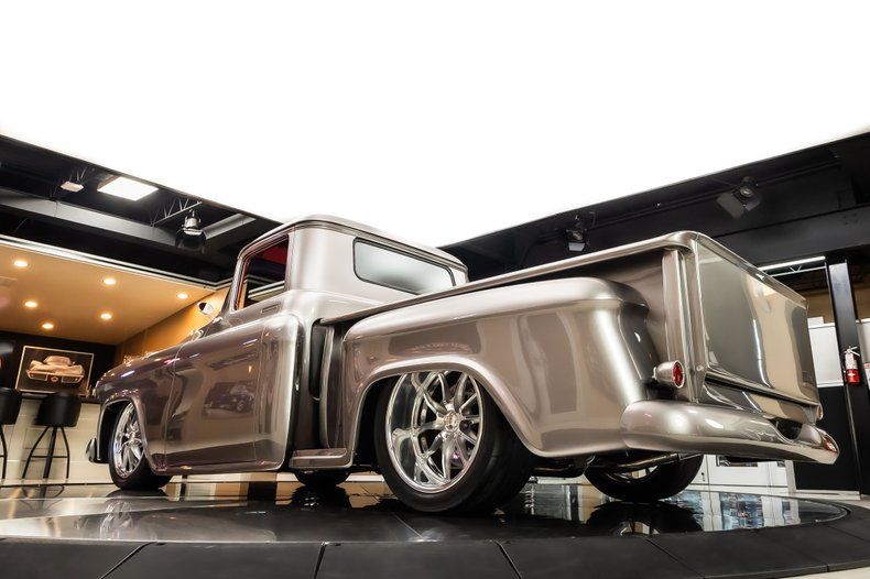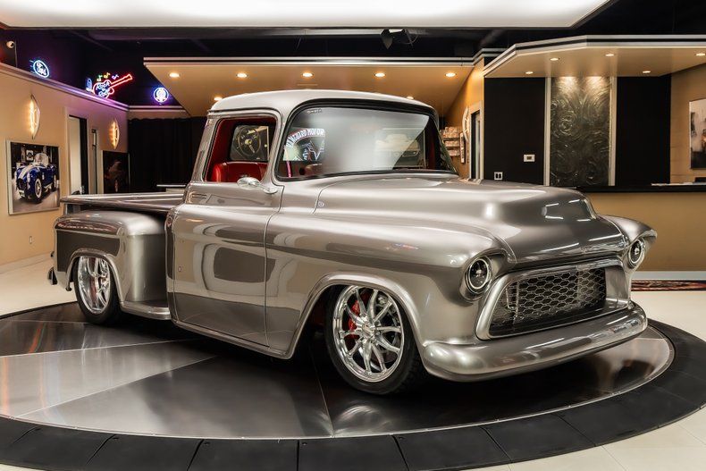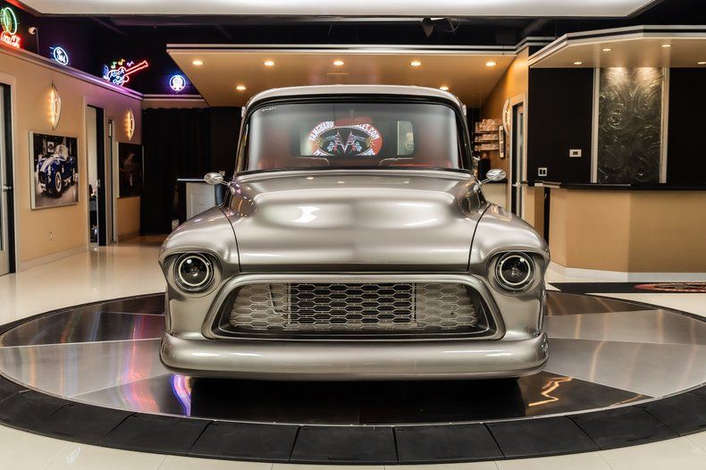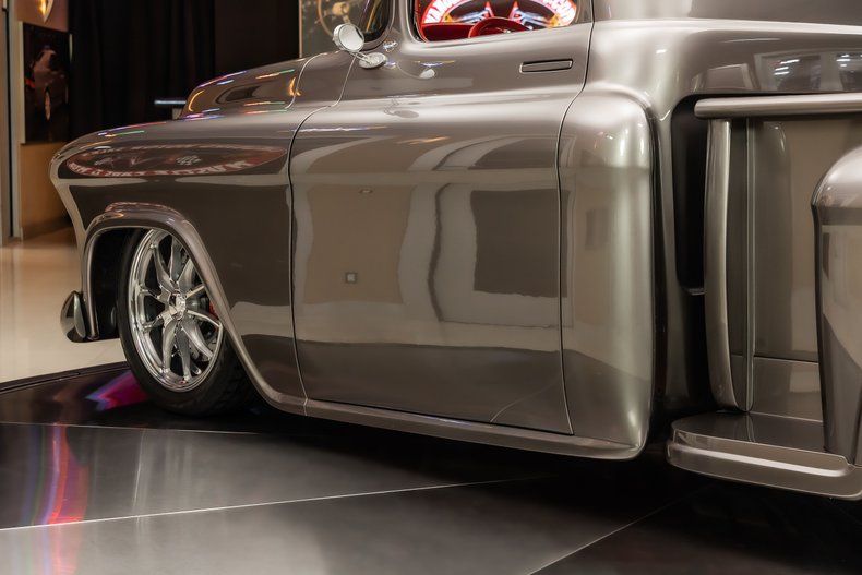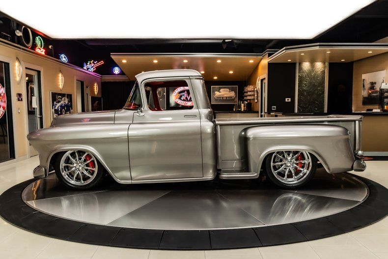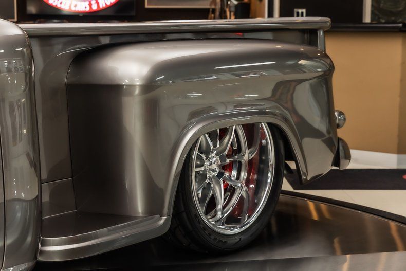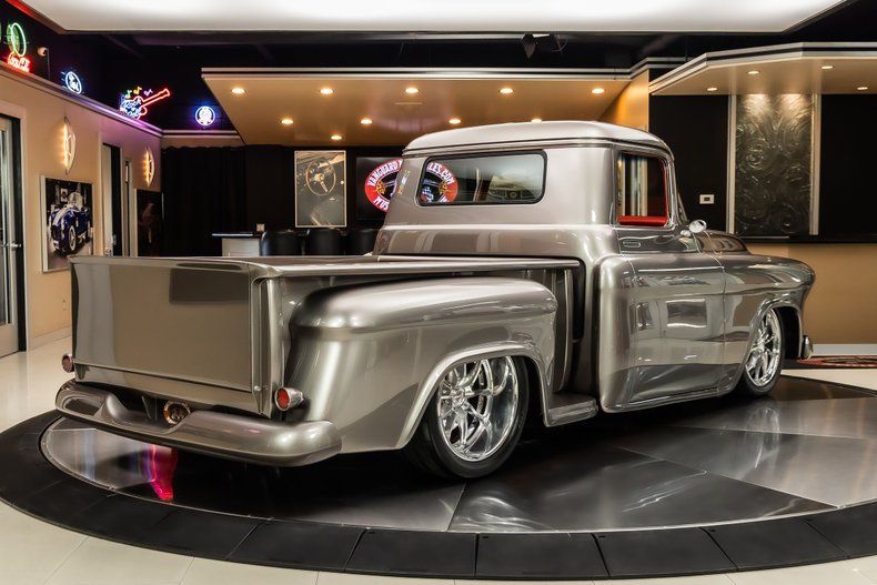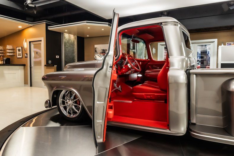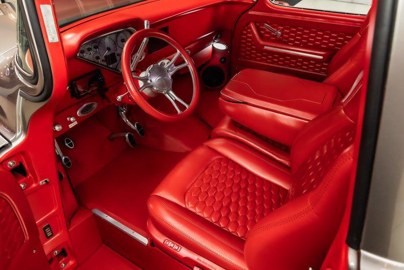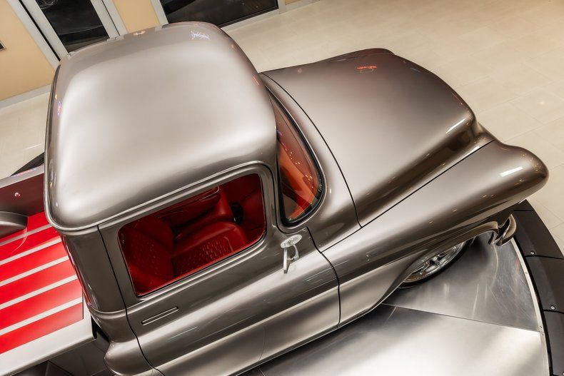 Check out this stunning 1956 Chevrolet 3100 Pickup Restomod! This 3100 has undergone a complete, frame-off restoration with no expense spared! This Truck has been finished in a beautiful Silver Metallic Exterior Paint along with The Red Wood Lined Bed, Custom Bumpers & Budnik Spyder Billet Wheels! Under the hood sits a Chevrolet 383ci V8 Engine with Multiport Fuel Injection! Power is sent to the rear wheels through a TH350 3-speed Automatic Transmission and the Upgraded Four Link Rear End with a 3.55:1 Gear Ratio. Additional Features include, Power Steering, Power Brakes and Vintage Air Conditioning!
