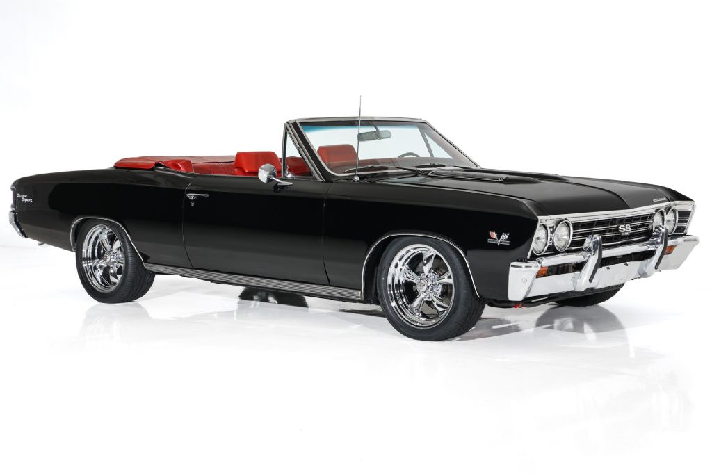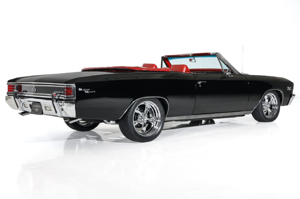 Beautiful Tuxedo Black 1967 Chevelle convertible with very nice newer red bucket seat interior with console topped off with a newer black powered soft top. This stunning black Chevelle convertible is loaded with performance upgrades and SS options. Powered by performance built 396/360 big block engine and launched by a TH400 heavy duty 3-speed automatic transmission and backed by a 12 bolt rear end with posi-traction and a highway gear. Nicely equipped with power steering and power front disc brakes for safety and driving pleasure. Structurally beautiful western body that is finished in beautiful Tuxedo Black paint, Super Sport hood, SS tail panel, SS emblems and very nice chrome and stainless trim. The interior features newer red factory bucket seats with rare headrests, center console, tach and gauges, power windows, SS steering wheel, and rare factory air conditioning that is complete but will need to be serviced to blow cold. The undercarriage is excellent with crisp metal. New dual exhaust with stainless mufflers and chrome tips has a great rumble. This American Dream Machine is rolling on new 18" chrome Torque Thrust wheels and performance rated radials and has great curb appeal. Stock rally rims are available for exchange,