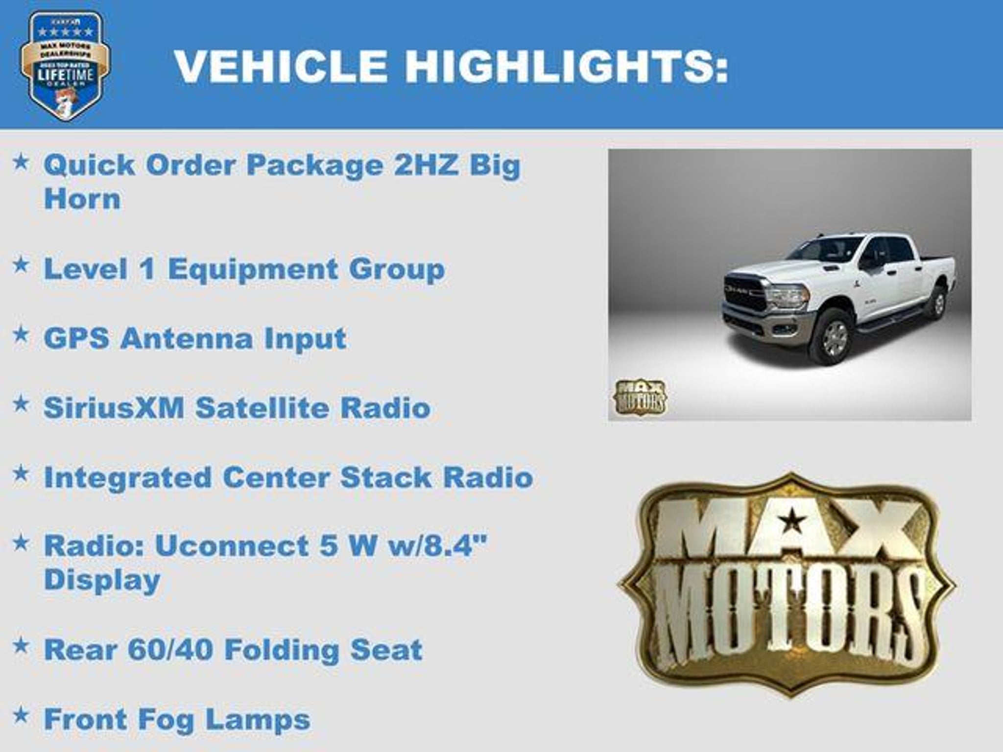 CARFAX One-Owner. Bright White Clearcoat 2023 Ram 2500 Big Horn 4D Crew Cab Big Horn 4WD Cummins 6.7L I6 Turbodiesel 2 Way Rear Headrest Seat, 2nd Row In Floor Storage Bins, 4 Way Front Headrests, 40/20/40 Split Bench Seat, 4G LTE Wi-Fi Hot Spot, 8.4 Touchscreen Display, Apple CarPlay, Auto Power-Folding Mirrors, Big Horn IP Badge, Black Exterior Mirrors, Bluetooth Handsfree Phone & Audio, Connectivity - US/Canada, Dual Glove Boxes, Exterior Mirrors Courtesy Lamps, Exterior Mirrors w/Heating Element, Exterior Mirrors w/Supplemental Signals, Foam Bottle Insert (Door Trim Panel), Footwell Courtesy Lamp, For Details, Visit DriveUconnect.com, For More Info, Call 800-643-2112, Forward & Reverse Utility Lights, Front Armrest w/Cupholders, Front Center Seat Cushion Storage, Front Fog Lamps, Front Seat Back Map Pockets, Global Telematics Box Module (TBM), Glove Box Lamp, Google Android Auto, GPS Antenna Input, Integrated Center Stack Radio, Integrated Voice Command w/Bluetooth, Leather Wrapped Steering Wheel, Level 1 Equipment Group, Locking Lower Glove Box, Manual Adjust 4-Way Front Passenger Seat, Mirror Running Lights, Power 2-Way Driver Lumbar Adjust, Power Adjust 8-Way Driver Seat, Power Adjust Mirrors, Power Adjustable Convex Aux Mirrors, Power Heated Fold Telescope Mirrors, Power Telescoping Mirrors, Premium Cloth 40/20/40 Bench Seat, Quick Order Package 2HZ Big Horn, Radio: Uconnect 5 W w/8.4 Display, Rear 60/40 Folding Seat, Rear Dome w/On/Off Switch Lamp, Selectable Tire Fill Alert, SiriusXM Radio Service, SiriusXM Satellite Radio, Steering Wheel Mounted Audio Controls, Storage Tray. At Max Motors, our mission is simple: to provide every customer with a honest, transparent, and rewarding automotive experience. For 19 years as a family-owned business, we build strong customer relationships that go beyond a sale. Buying a vehicle is significant, and we ensure the process is smooth and straightforward.