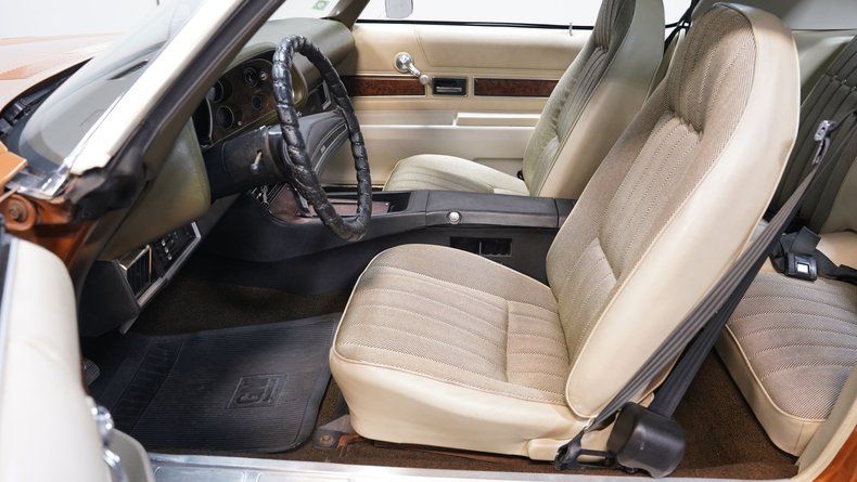 The Mohave Gold paint is more of a distinctive color shade from the early '70s era, which helps this 1972 Chevrolet Camaro RS Tribute stand out from the crowd of more commonly seen shades from this era. The car wears an RS-style front clip with the correct horizontal parking lights, giving it the aggressive look enthusiasts love. Paired with the crisp white vinyl top, 15-inch rally wheels with center caps and beauty rings, and chrome front and rear bumpers, this Camaro carries a strong dose of classic sports car attitude. The headlights, taillights, trim, and moldings all appear correct, and the glass around the car shows no signs of major damage.