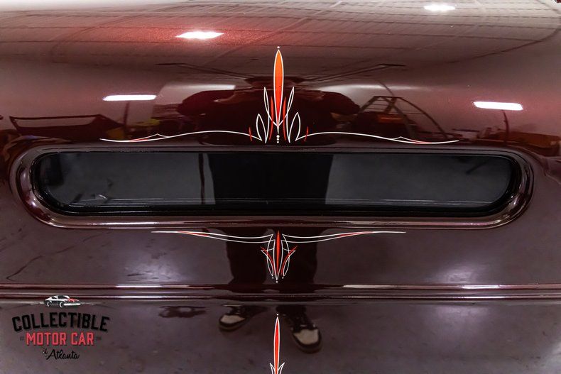 This Model A has the look every hot rod guy wants. The body is finished in a rich Black Cherry that shows beautifully under the lights and is accented with tasteful traditional-style pinstriping on the grille shell, cowl, and rear body. The combination of deep paint, blacked-out chassis components, and polished engine hardware gives the car a sinister but classy appearance. From every angle, it looks like a properly built traditional rod.