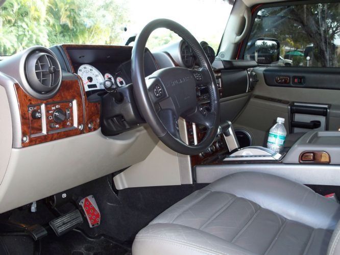 This 2003 Hummer H2 is located in Worcester, Massachusetts and is described as a 1 owner Florida truck. It is powered by a 6.0L engine paired with an 4-Speed Automatic Transmission and is finished in orange over a gray interior. According to the provided information, it is equipped with all luxury options except for a sunroof and navigation. The vehicle is also said to retain its original paint, to have always been stored inside, and to present like new. Recent maintenance includes replacement of all four tires with original equipment BF Goodrich tires. It is described as very clean and currently located in a Worcester showroom.