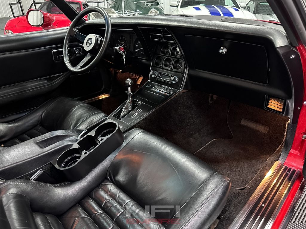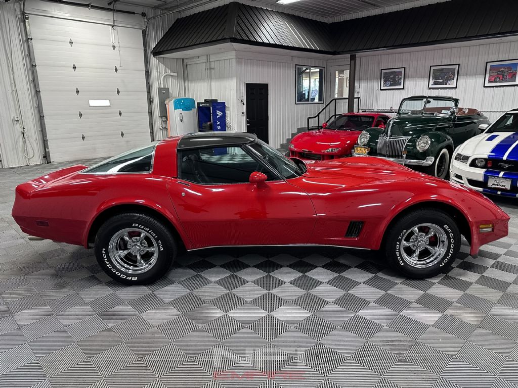 This 1980 Chevrolet Corvette is a late C3 coupe finished in red over black and powered by a 5.7L 350 V8 paired with a 4-speed manual transmission. Chevrolet gave the 1980 Corvette a revised look with integrated front and rear spoiler treatment and a number of weight-saving updates, helping distinguish these later C3 cars from earlier examples while still retaining the classic long-hood, short-deck Corvette shape.