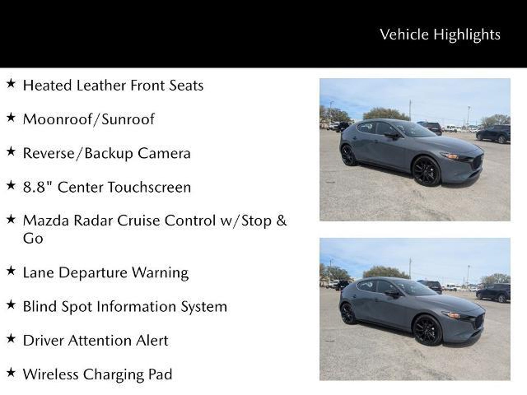 Sporty styling and premium touches come together in this 2026 Mazda3 2.5 S Carbon Edition, VIN JM1BPBLL0T1857262, with just 600 miles. Known for its driver-focused performance and upscale design, the Mazda3 delivers a refined compact sedan experience with distinctive Carbon Edition styling. Inside, the cabin features heated unique red leather front seats that create a bold, upscale look while providing added comfort during cooler weather. Driver seat memory allows you to quickly return to your preferred seating position, while a power moonroof brings natural light into the interior for a more open feel. The 8.8-inch touchscreen keeps essential controls easily accessible, and a wireless charging pad offers convenient cable-free charging for compatible devices. Driver-assist technology helps add confidence on the road. Adaptive cruise control helps maintain a consistent following distance on the highway, while lane departure warning and the blind spot information system provide added awareness in traffic. A backup camera assists when reversing or maneuvering in tight spaces. The Carbon Edition?s distinctive appearance is highlighted by 18-inch black metallic wheels, giving the sedan a sleek, athletic stance. A black rear bumper guard adds protection when loading cargo. With extremely low mileage, premium interior accents, and advanced safety technology, this Mazda3 Carbon Edition delivers standout style and an engaging driving experience in a well-equipped compact sedan. Clean CARFAX. Heated Leather Front Seats, Moonroof/Sunroof, Reverse/Backup Camera, 8.8 Center Touchscreen, Mazda Radar Cruise Control w/Stop & Go, Lane Departure Warning, Blind Spot Information System, Driver Attention Alert, Wireless Charging Pad, 172 Point Inspection completed by our Factory Certified & ASC Trained Technicians, CLEAN HISTORY/NO ACCIDENTS, Recent Oil Change, Vehicle Detailed, 18 x 7J Black Metallic Aluminum Alloy Wheels, 8 Speakers, Front Dual Zone A/C, High Wall All-Weather Floor Mats, Leather Shift Knob, Leather Steering Wheel, MAZDA CONNECT Infotainment System, Memory Seat, Rain Sensing Wipers. Savannah, GA ? J.C. Lewis Mazda Smart Choices Start Here At J.C. Lewis Mazda, we know today?s drivers are informed, connected, and always looking for smart value. That?s why we include over 20 high-resolution photos and a full walkaround video with every vehicle ? so you can evaluate the details before ever stepping on the lot. Whether you?re a tech-forward professional, a college student, or simply som