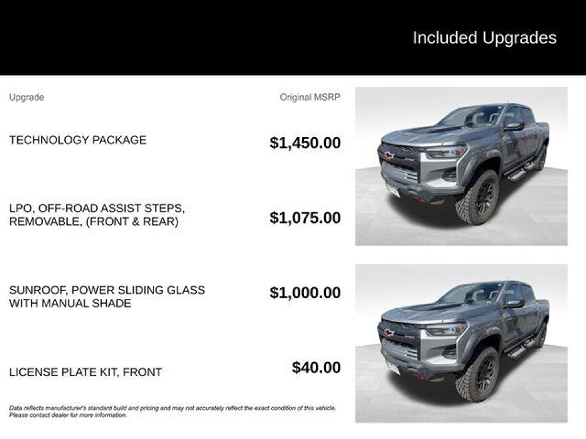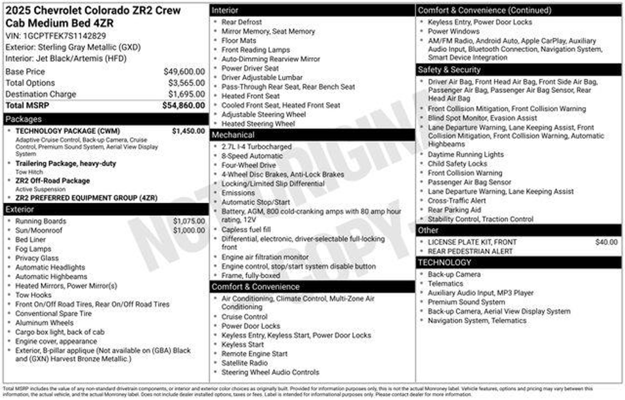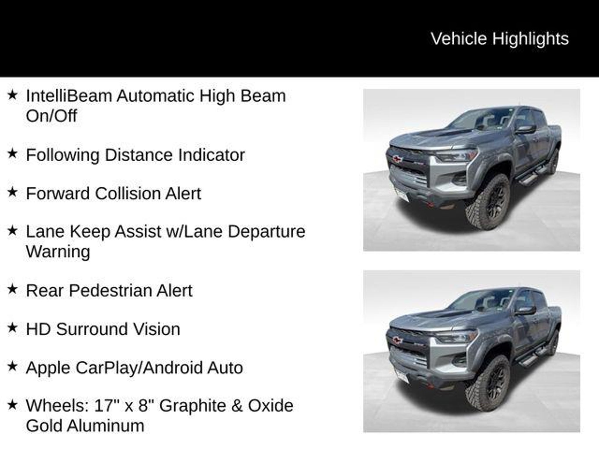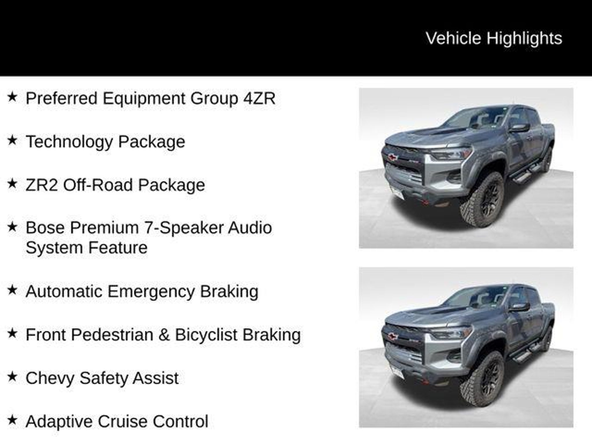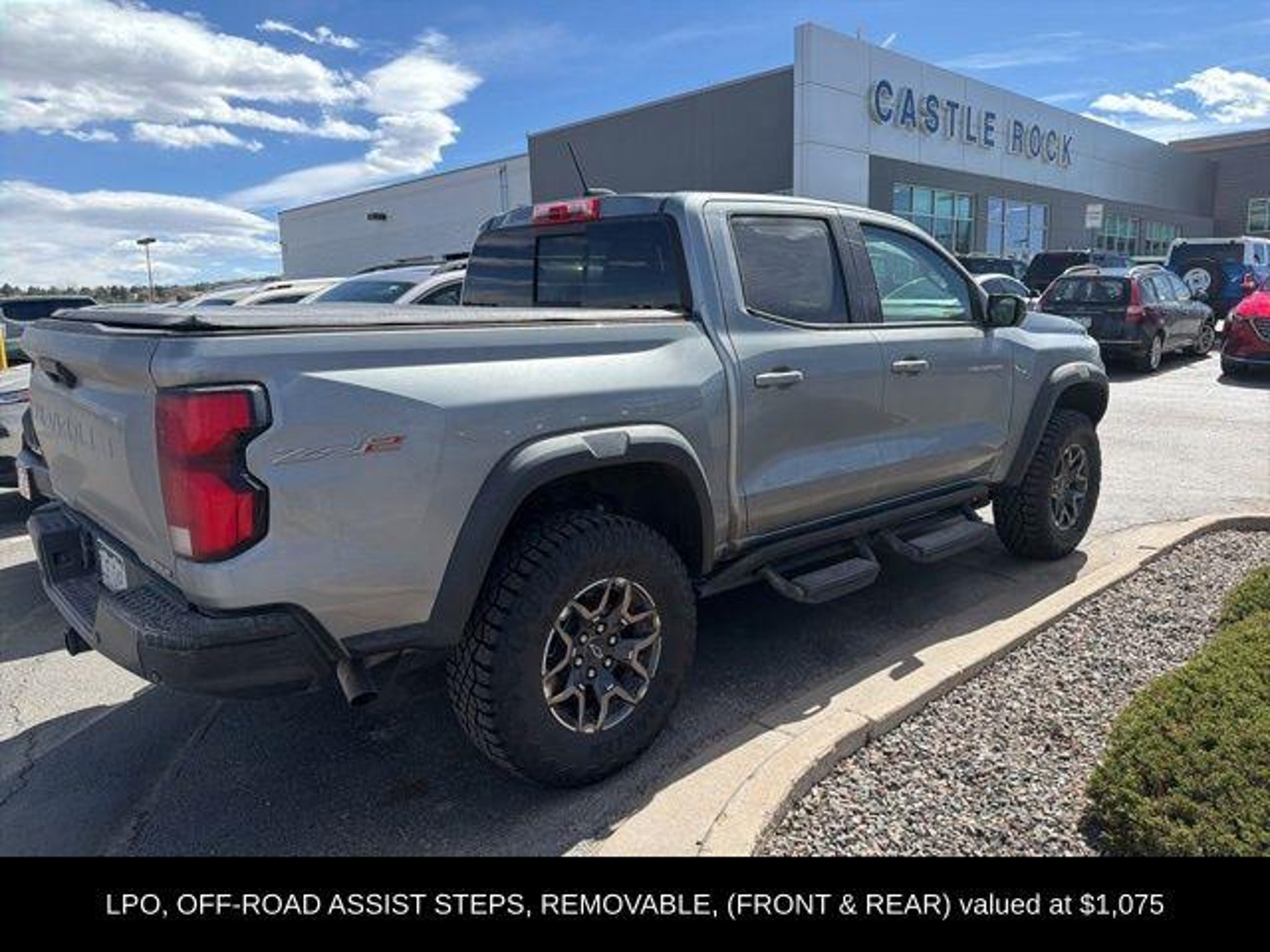 Elevate your off-road adventures with the 2025 Chevrolet Colorado ZR2, a rugged and capable pickup that's ready to tackle any terrain. Boasting a powerful 2.7L turbocharged engine, advanced 4-wheel drive system, and a host of premium features, this Colorado is the perfect companion for your next outdoor excursion. - Removable Front & Rear Off-Road Assist Steps (LPO) - Technology Package, including Adaptive Cruise Control, Rear Pedestrian Alert, and HD Surround Vision - ZR2 Off-Road Package - Bose Premium 7-Speaker Audio System - Automatic Emergency Braking, Front Pedestrian & Bicyclist Braking, and Chevy Safety Assist - Apple CarPlay/Android Auto and Navigation System The Colorado ZR2's impressive capabilities are matched by its refined interior, featuring premium leather-appointed seating, heated and ventilated front seats, and a power sliding glass sunroof. The advanced technology suite, including a large 11.3 diagonal display, keeps you connected and in control on the go. Whether you're tackling rugged trails or navigating the daily commute, the 2025 Chevrolet Colorado ZR2 is the ultimate blend of off-road prowess and on-road comfort. Its bold styling and rugged good looks are sure to turn heads wherever you go. Experience the confidence and capability of the 2025 Colorado ZR2 for yourself. Visit CASTLE ROCK FORD or call for your V.I.P. appointment at 720-733-7057. Price does not include Tax, Title and Fees.