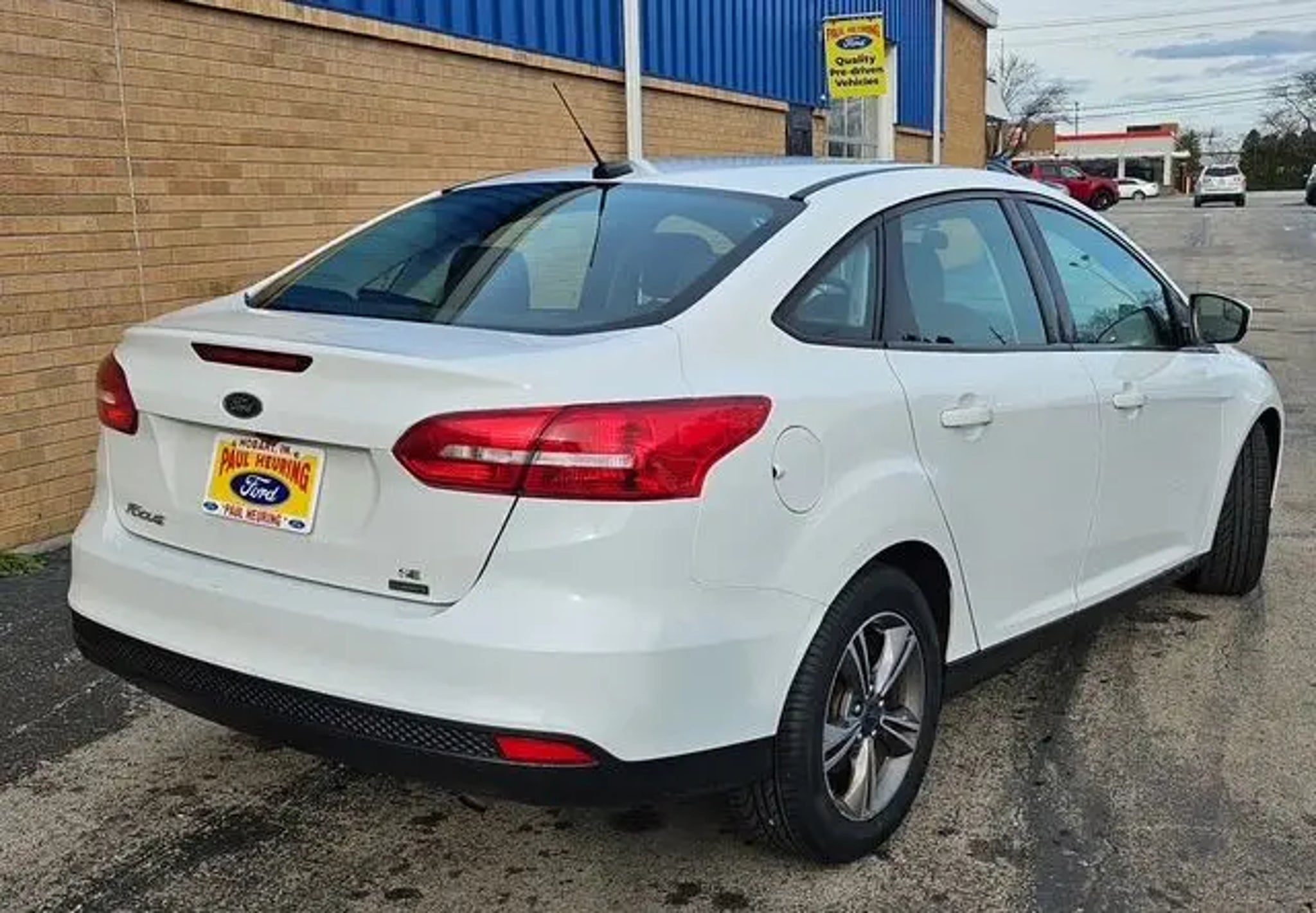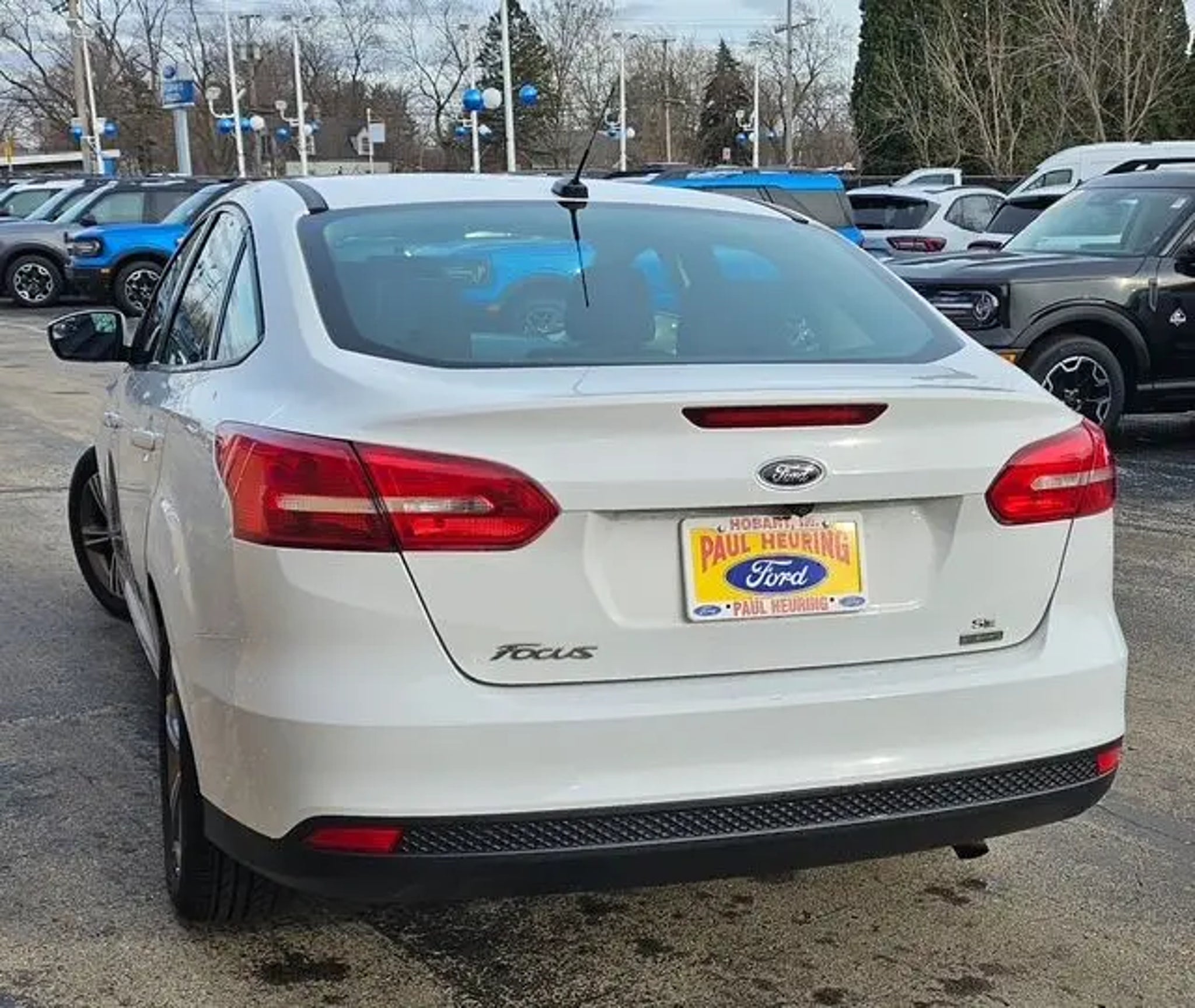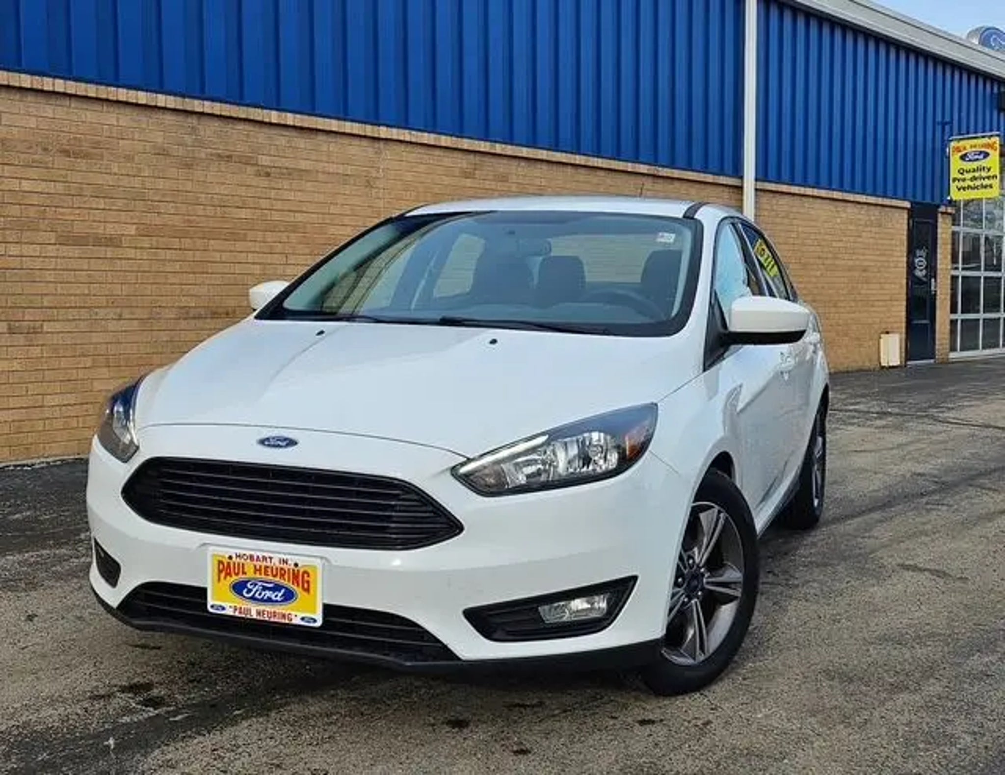 SERVICE RECORDS AVAILABLE, 16 Machined Aluminum Wheels, 6 Speakers, ABS brakes, Air Conditioning, Alloy wheels, AM/FM radio: SiriusXM, Black Gloss Upper Grille, Black Headlamp Bezels, Brake assist, Bumpers: body-color, Cloth Front Bucket Seats, Compass, Dedicated Daytime Running Headlamps, Delay-off headlights, Driver door bin, Driver vanity mirror, Dual front impact airbags, Dual front side impact airbags, Electronic Stability Control, Emergency communication system, Equipment Group 200A, Exterior Parking Camera Rear, Fog Lamps, Four wheel independent suspension, Front anti-roll bar, Front Bucket Seats, Front Center Armrest, Front reading lights, Fully automatic headlights, Illuminated entry, Knee airbag, Low tire pressure warning, Occupant sensing airbag, Outside temperature display, Overhead airbag, Overhead console, Panic alarm, Passenger door bin, Passenger vanity mirror, Power door mirrors, Power steering, Power windows, Radio data system, Radio: AM/FM/MP3-Capable, Rear anti-roll bar, Rear window defroster, Remote keyless entry, SE Appearance Package, Speed control, Split folding rear seat, Steering wheel mounted audio controls, SYNC Communications & Entertainment System, Tachometer, Telescoping steering wheel, Tilt steering wheel, Traction control, Trip computer, Variably intermittent wipers, Wheels: 16 Sparkle Silver Painted Aluminum. CARFAX One-Owner. Oxford White 2018 Ford Focus SE 4D Sedan EcoBoost 1.0L I3 GTDi DOHC Turbocharged VCT 27/38 City/Highway MPG 6-Speed Automatic FWD Awards: * 2018 KBB.com Brand Image Awards * 2018 KBB.com 10 Most Awarded Brands Proudly serving: Highland Indiana, Munster, Hammond, Chicago Illinois, Gary, Hobart, Portage, Valparaiso, South Holland, Harvey, Orland Park, Oak Lawn, LaGrange, Oakbrook, Naperville, Homewood, Joliet, Mokena, Thornton, Chesterton, Lowell, Schererville, Dyer, Merellville, Michigan City, and all of greater Chicago, Illinois, and Indiana for their Ford needs.