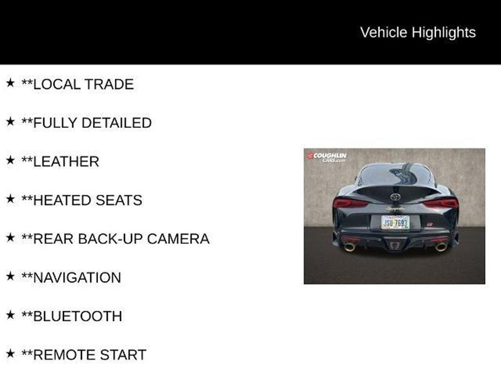 LOWEST PRICES IN COLUMBUS, MARYSVILLE, AND CENTRAL OHIO!! Please call 937-642-0015 for availability. This stunning 2021 Toyota Supra A91 Edition is a true driver's delight, packed with an impressive array of features that will elevate your driving experience. Boasting a sleek black exterior and a meticulously crafted interior, this Supra is sure to turn heads wherever you go. - Apple CarPlay/Android Auto - Bluetooth - Fully Detailed - Heated Seats - Leather - Local Trade - Navigation - New Tires - Rear Back-Up Camera - Remote Start - Driver Assist Package with Blind Spot Monitor, Rear Cross Traffic Alert, Adaptive Cruise Control, and Clearance & Back Up Sonar Vehicle Detailed This Supra is more than just a head-turner ? it's a true performance machine. Powered by a potent 3.0L I6 Turbocharged engine and equipped with an 8-speed automatic transmission, this vehicle delivers an exhilarating driving experience with exceptional fuel efficiency, achieving an impressive 22 MPG in the city and 30 MPG on the highway. Beyond its impressive powertrain, this Supra is packed with a wealth of premium features that will elevate your driving experience. The heated front sport seats, wrapped in a stunning Alcantara and leather combination with blue stitching, provide unparalleled comfort and support. The 500-watt JBL audio system with 12 speakers will immerse you in your favorite tunes, while the intuitive navigation system ensures you'll always reach your destination with ease. Safety is also a top priority, with the Supra's comprehensive suite of driver-assist technologies, including a Blind Spot Monitor, Rear Cross Traffic Alert, and Adaptive Cruise Control. You can drive with confidence, knowing that this vehicle has your back. Whether you're seeking a thrilling daily driver or a weekend sports car, this 2021 Toyota Supra A91 Edition is the perfect choice. With its exceptional performance, premium features, and head-turning style, it's sure to exceed your expectations. Don't miss your chance to experience the power and sophistication of this remarkable vehicle. Schedule a test drive today and discover the true joy of driving. Free Car Fax available. Pricing excludes tax, title fee ($35), documentary fee ($387), Thanks for visiting www.coughlincars.com.