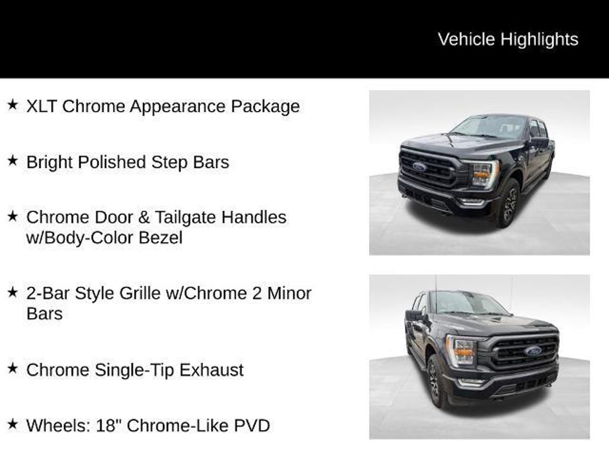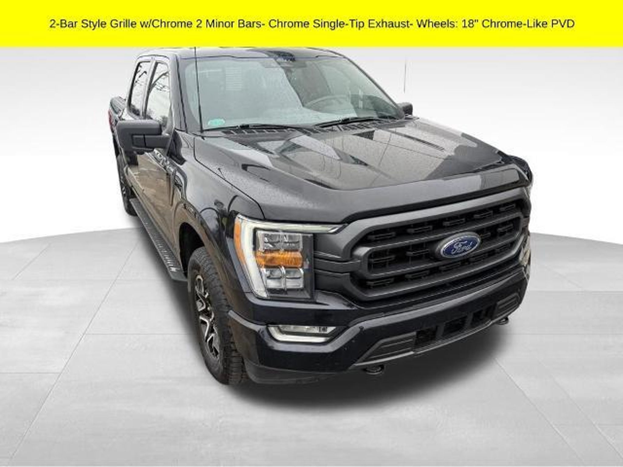 Certified. Agate Black Metallic 2022 Ford F-150 XLT 4WD 10-Speed Automatic 2.7L V6 EcoBoost Ford Blue Certified Details: * Limited Warranty: 3 Month/4,000 Mile (whichever comes first) after new car warranty expires or from certified purchase date * and 11,000 FordPass Rewards Points to use toward first maintenance visit * Warranty Deductible: $100 * 139 Point Inspection * Roadside Assistance * Vehicle History * Transferable Warranty Ford Blue Certified Certified, 4WD, 2-Bar Style Grille w/Chrome 2 Minor Bars, Bright Polished Step Bars, Chrome Door & Tailgate Handles w/Body-Color Bezel, Chrome Single-Tip Exhaust, Wheels: 18 Chrome-Like PVD, XLT Chrome Appearance Package, 10-Way Power Driver & Passenger Seats, 4-Wheel Disc Brakes, 6 Speakers, 8 Productivity Screen in Instrument Cluster, ABS brakes, Accent-Color Step Bars, Air Conditioning, Alloy wheels, AM/FM radio, Auto High-beam Headlights, Auto Start-Stop Removal, Auto-Dimming Rear-View Mirror, Black 2-Bar Style Grille w/Black Surround/Accents, Body-Color Door & Tailgate Handles, Body-Color Front & Rear Bumpers, Box Side Decals, Brake assist, Bumpers: chrome, Class IV Trailer Hitch Receiver, Cloth 40/20/40 Front Seat, Compass, Connected Navigation & SiriusXM w/360L Removal, Delay-off headlights, Driver door bin, Driver vanity mirror, Dual front impact airbags, Dual front side impact airbags, Dual Zone Electronic Automatic Temperature Control, Electronic Stability Control, Emergency communication system: SYNC 4 911 Assist, Equipment Group 302A High, Exterior Parking Camera Rear, Front anti-roll bar, Front Center Armrest w/Storage, Front fog lights, Front reading lights, Front wheel independent suspension, Fully automatic headlights, GVWR: 6,470 lbs Payload Package, Heated door mirrors, Heated Front Seats, Illuminated entry, Integrated Trailer Brake Controller, Intelligent Access w/Push Button Start, Interior Work Surface, Leather-Wrapped Steering Wheel, LED Reflector Headlamps, LED Sideview Mirror Spotlights, Low tire pressure warning, Occupant sensing airbag, Onboard 400W Outlet, Outside temperature display, Overhead airbag, Overhead console, Panic alarm, Passenger door bin, Passenger vanity mirror, Power door mirrors, Power Glass Heated Sideview Mirrors, Power steering, Power windows, Power-Sliding Rear Window, Pro Trailer Backup Assist, Radio data system, Radio: AM/FM SiriusXM w/360L, Radio: AM/FM Stereo w/6 Speakers, Rear reading lights, Rear step bumper, Rear Under-Seat Storage, Rear window defroster, Remote keyless entry, Remote S