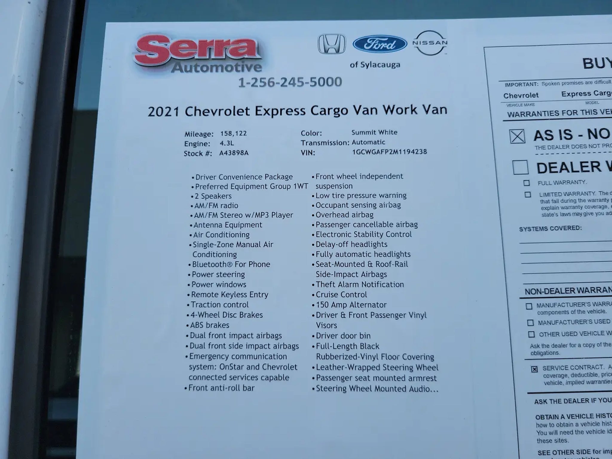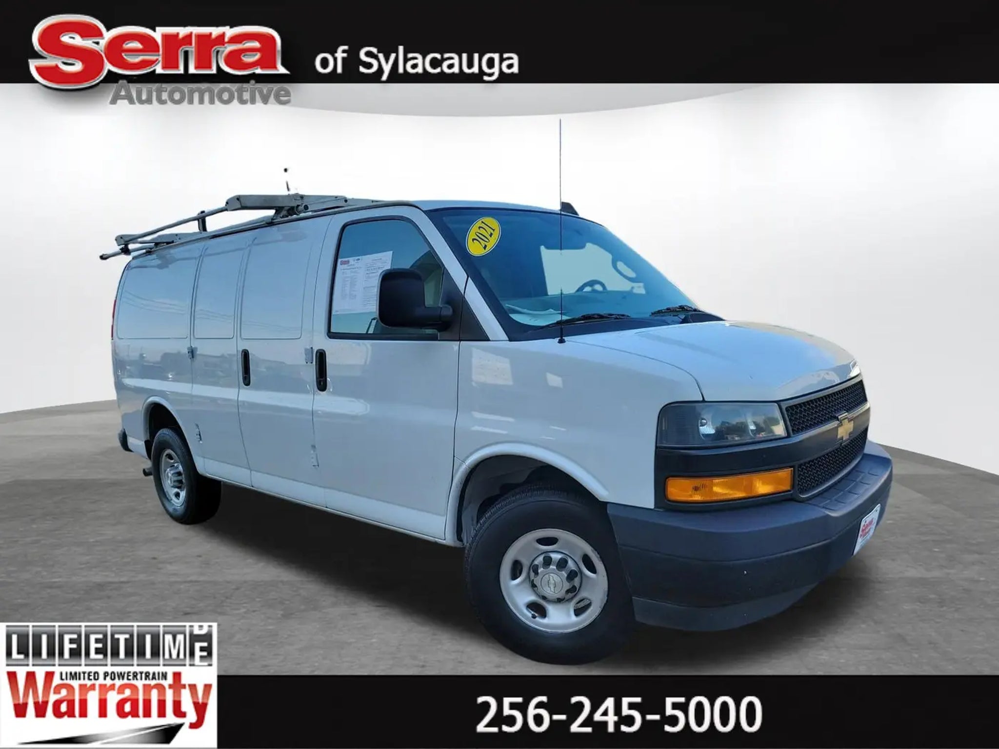 Tony Serra Ford in Sylacauga, AL - serving Chelsea, Alexander City and the Greater Birmingham Area! We can take care of all your automotive needs under one roof, from finding your next car to securing financing to keeping it maintained. Our commitment to your 100% satisfaction will help you experience the Tony Serra Ford Difference with features like our free warranty protection on every new Ford for unlimited time and miles, a 30-day low price protection guarantee, a 3-day Love It or Leave It exchange policy, and more. Tony Serra Ford 40905 Highway 280, Sylacauga, AL 35150 Sales: 256-245-5000 All new vehicles include a $1000 trade-in assistance dealer discount and a $1000 financing discount. Requirements to qualify for pricing: vehicle trade year model of 2018 or newer and less than 125,000 miles. Must use dealer provided lenders to qualify for financing assistance. Price does not include tax, tag, title, license, fees and dealer installed options. All factory rebates and incentives are applied to price; not all customers will qualify for all incentives. May require approved credit. Some restrictions may apply. Pricing and details are believed to be accurate, but we do not warrant or guarantee such accuracy. Image, prices, specifications and availability are subject to change without notice and may not apply to this specific vehicle. Specifications and availability are subject to change without notice and may not apply to this specific vehicle.Summit White 2021 Chevrolet Express 2500 Work Van Cargo RWD 8-Speed Automatic with Overdrive 4.3L V6 Recent Arrival!