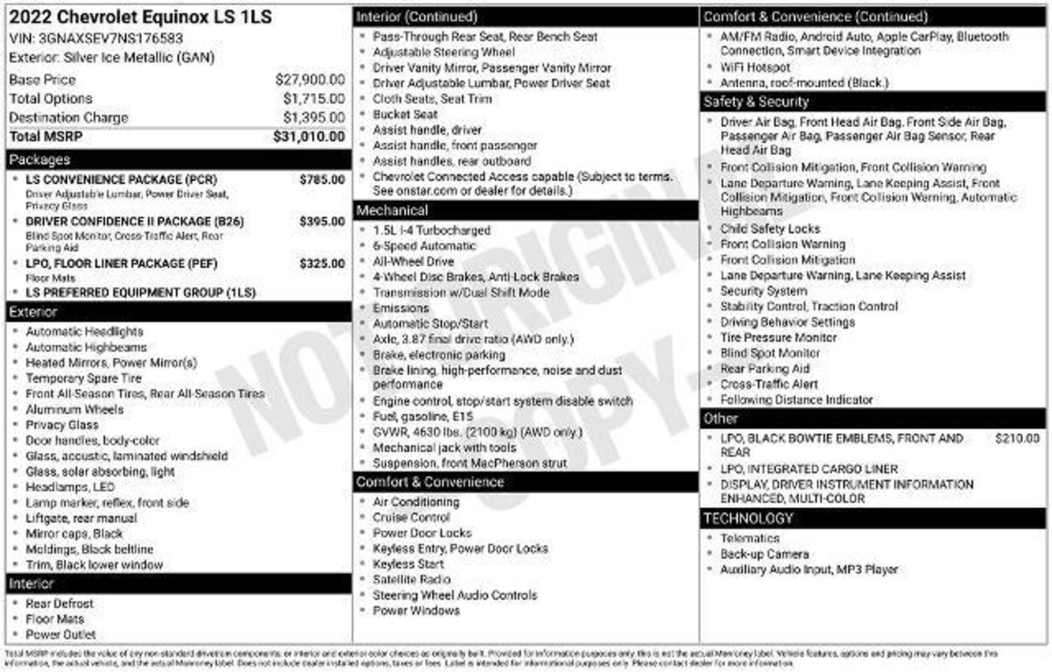 At Lamarque Ford, our customers come first?Every Deal, Every Day, All the Time. That's why we're honored as Best of New Orleans and celebrated for Customer Satisfaction by J.D. Power and Ford Motor Company. All Vehicles are subject to an $895 Prep and Conditioning Fee at time of Purchase. This 2022 Chevrolet Equinox LS offers an impressive array of features, including: - LS Convenience Package - Driver Confidence II Package - Floor Liner Package (LPO) - Black Bowtie Emblems (LPO) - 8-Way Power Driver Seat Adjuster - All-Weather Floor Liners (LPO) - Integrated Cargo Liner (LPO) - Lane Change Alert with Side Blind Zone Alert - Multi-Color Enhanced Driver Instrument Info Display - Rear Cross Traffic Alert - Rear Park Assist with Audible Warning - Deep-Tinted Rear Glass With its sleek silver exterior, the Equinox LS is a stylish and practical SUV that's perfect for your daily commute or weekend adventures. The 1.5L DOHC engine and 6-speed automatic transmission provide a smooth and efficient ride, while the available all-wheel drive ensures confident handling in all weather conditions. Inside, the Equinox LS offers a spacious and well-appointed interior, with premium cloth seating, a multi-color driver information display, and a host of advanced technology features. The LS Convenience Package adds even more convenience with an 8-way power driver's seat, 2-way power lumbar support, and a rear park assist system. The Driver Confidence II Package takes safety to the next level, with features like Lane Change Alert with Side Blind Zone Alert and Rear Cross Traffic Alert, helping you stay aware of your surroundings and avoid potential hazards. With an impressive EPA-estimated 25 city/30 highway MPG, the Equinox LS is both practical and economical, making it an excellent choice for a wide range of drivers. We look forward to you being part of the family and remember always feel free to visit our full-service dealership at 3101 Williams Blvd, Kenner, LA 70065 or Call Lamarque Ford at (504) 443-2500 to schedule a test drive today!
