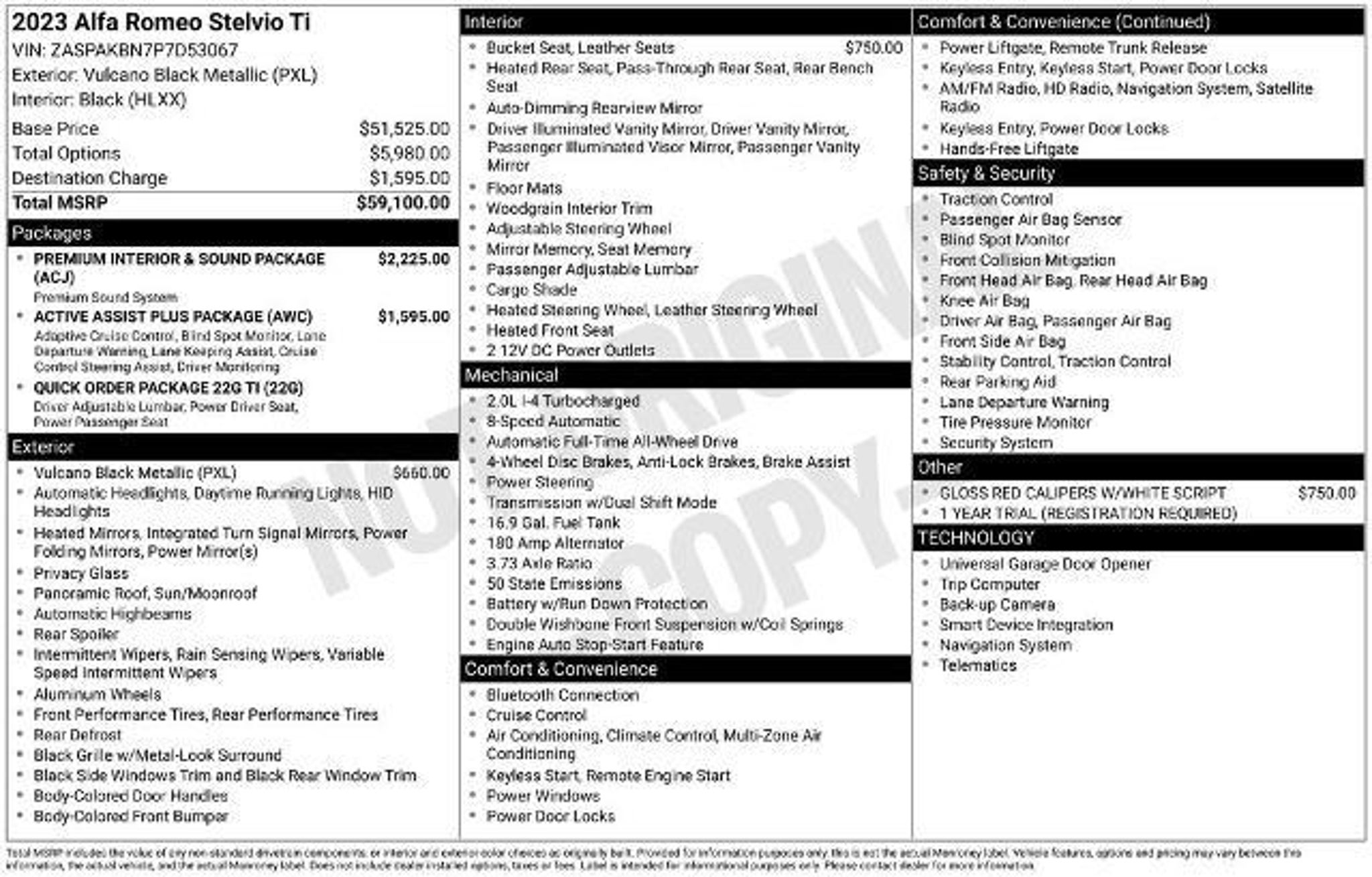 At Lamarque Ford, our customers come first?Every Deal, Every Day, All the Time. That's why we're honored as Best of New Orleans and celebrated for Customer Satisfaction by J.D. Power and Ford Motor Company. All Vehicles are subject to an $895 Prep and Conditioning Fee at time of Purchase. This stunning 2023 Alfa Romeo Stelvio Ti boasts an impressive array of premium features, including: - PREMIUM INTERIOR & SOUND PACKAGE - ACTIVE ASSIST PLUS PACKAGE - GLOSS RED CALIPERS W/WHITE SCRIPT - BLACK, CHOCOLATE LEATHER SEATS - Vulcano Black Metallic Exterior Powered by a robust I4 engine and equipped with an 8-Speed Automatic transmission and All-Wheel Drive, this Stelvio Ti delivers an exceptional driving experience. With an EPA-estimated 22 MPG in the city and 28 MPG on the highway, this vehicle offers impressive fuel efficiency to complement its dynamic performance. The Stelvio Ti's premium features extend beyond the powertrain, with a wealth of cutting-edge technology and luxurious amenities. Enjoy the convenience of the Navigation System, the exceptional sound quality of the harman/kardon Premium Audio, and the added safety of features like Active Blind Spot Assist, Highway Assist System, and Traffic Jam Assist. Elevating the driving experience further, this Stelvio Ti boasts a stunning Vesuvio Gray Body Kit, a Silver Ti Badge, and a Power Moonroof, all of which contribute to its bold and refined aesthetic. This Alfa Romeo Stelvio Ti has been meticulously inspected and certified, ensuring that it meets the highest standards of quality and reliability. With low mileage of just 51,969, this vehicle is primed to provide you with years of exceptional performance and unparalleled driving pleasure. We look forward to you being part of the family and remember always feel free to visit our full-service dealership at 3101 Williams Blvd, Kenner, LA 70065 or Call Lamarque Ford at (504) 443-2500 to schedule a test drive today!
