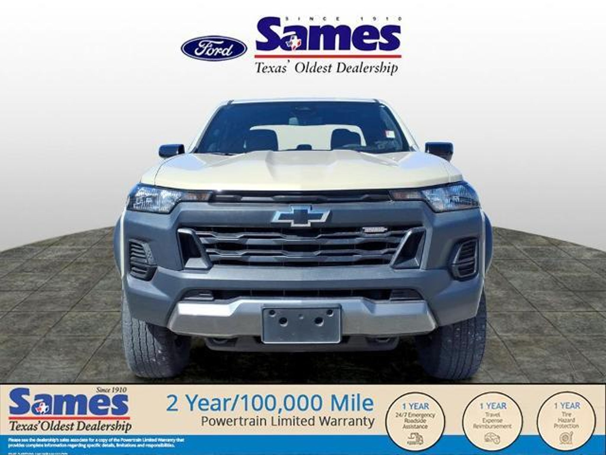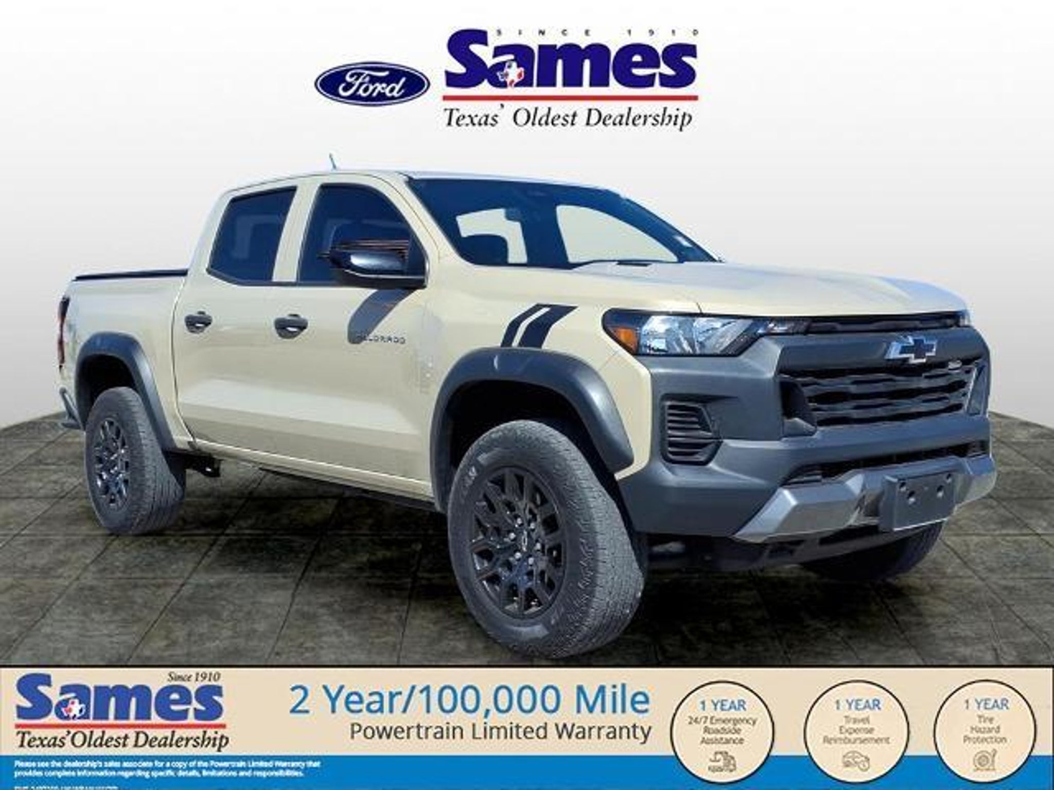 This 2023 Chevrolet Colorado Trail Boss in Sand Dune Metallic comes with the following features: 2.7L Turbo 8-Speed Automatic 4WD Advanced Trailering Package (Trailering App), Heavy-Duty Trailering Package (Integrated Trailer Brake Controller), Preferred Equipment Group 0TR (Automatic Emergency Braking, Chevy Safety Assist, Following Distance Indicator, Forward Collision Alert, Front Pedestrian & Bicyclist Braking, IntelliBeam Automatic High Beam On/Off, and Lane Keep Assist w/Lane Departure Warning), Safety Package (Black Painted Mirror Caps, Blind Zone Steering Assist, Heated Power-Adjustable Outside Mirrors, Rear Cross Traffic Braking, and Rear Park Assist), Trail Boss Convenience Package (Electronic Automatic Cruise Control, Manual Rear-Sliding Window, and Rear-Window Electric Defogger), 220 Amp Generator, 3.42 Rear Axle Ratio, 4-Way Manual Passenger Seat Adjuster, 4-Wheel Disc Brakes, 6 Speakers, 6-Speaker Audio System Feature, 6-Way Manual Driver Seat Adjuster, ABS brakes, Air Conditioning, Alloy wheels, AM/FM radio: SiriusXM, Apple CarPlay/Android Auto, Auto High-beam Headlights, Brake assist, Cloth Seat Trim, Compass, Delay-off headlights, Driver door bin, Driver vanity mirror, Dual front impact airbags, Dual front side impact airbags, Electronic Stability Control, Front anti-roll bar, Front Bucket Seats, Front Center Armrest, Front License Plate Kit, Front wheel independent suspension, Illuminated entry, Low tire pressure warning, Navigation System, Occupant sensing airbag, Outside temperature display, Overhead airbag, Overhead console, Panic alarm, Passenger door bin, Passenger vanity mirror, Power door mirrors, Power steering, Power windows, Radio data system, Radio: 11.3 Diagonal Advanced Color LCD Display, Rear reading lights, Rear step bumper, Remote keyless entry, Security system, SiriusXM Radio, Speed-sensing steering, Split folding rear seat, Steering Wheel Mounted Audio Controls, Steering wheel mounted audio controls, Tachometer, Tilt steering wheel, Traction control, Trip computer, Variably intermittent wipers, Wheels: 18 x 8.5 Black High Gloss Aluminum, and Wireless Phone Projection. Certification Program Details: 2 Year/100,000 Mile Limited Powertrain Warranty, Rental Reimbursement, Road Side Assist, Emergency Travel Expense Reimbursement, Tire Hazard Protection. See dealer for details. Sames Auto Group stores have been in business for over 115 years, as part of the Oldest Auto Group in Texas we're committed to providing exceptional service before, during, and after your purchase. O