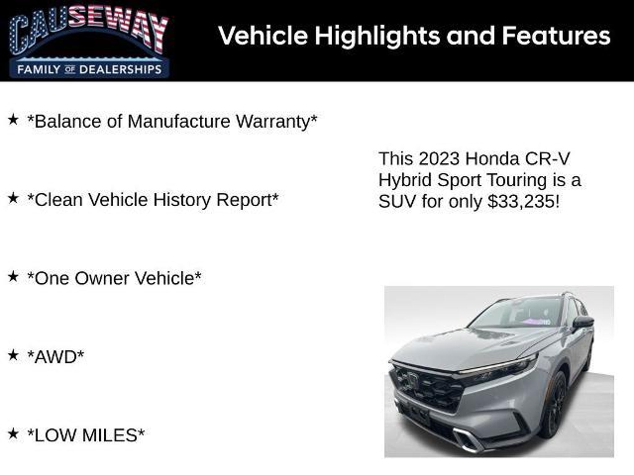 2023 Honda CR-V Hybrid Sport Touring AWD eCVT 2.0L I4 DOHC 16V *Balance of Manufacture Warranty*, *Clean Vehicle History Report*, *One Owner Vehicle*, *AWD*, *LOW MILES*, 2.0L I4 DOHC 16V. Recent Arrival! 40/34 City/Highway MPG Ask us how you can make money using our Causeway Referral Rewards Program!