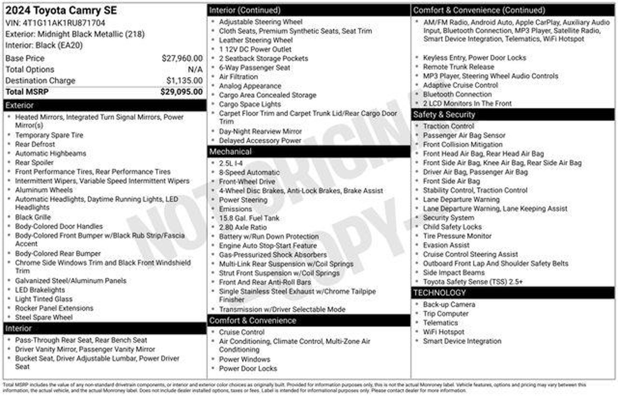 Welcome to Chuck Stevens Ford, located at 1304 HWY 31 South, Bay Minette, Alabama. We are proud to celebrate 25 Years of serving our community as one of the fastest-growing Ford dealers in the Southeast. Our goal is to make your shopping experience transparent, easy, and enjoyable. Every Pre-Owned and Certified vehicle at Chuck Stevens Ford has been fully inspected and reconditioned by a certified technician, giving you confidence in your purchase. Take advantage of our low-price guarantee on this 2024 Toyota Camry. This Camry comes finished in Midnight Black Metallic with a Black interior, making it a great choice for your next vehicle. At Chuck Stevens Ford, we also include our exclusive Lifetime Powertrain Warranty at no additional cost. No gimmicks, no fine print, and serviceable at any certified repair facility nationwide. The online price includes a $2,500 Cash Down or trade equity. To qualify, customers must trade in a vehicle with a minimum appraised value of $2,500 or Cash Down. All prices reflect dealership financing and include a $1,000 finance coupon. See dealer for full details. . New Price! CARFAX One-Owner. Priced below KBB Fair Purchase Price! 28/39 City/Highway MPG 2024 Toyota Camry SE 4D Sedan SE Midnight Black Metallic FWD 2.5L I4 DOHC 16V 8-Speed Automatic 18 x 8J Alloy Wheels, Alloy wheels. LIFETIME POWERTRAIN PROGRAM included at no additional charge for all vehicles that have less than 80,000 miles. It is one of the most comprehensive powertrain warranty programs in the market. See dealer for details. Please don't buy anywhere until you have us show you our deal.