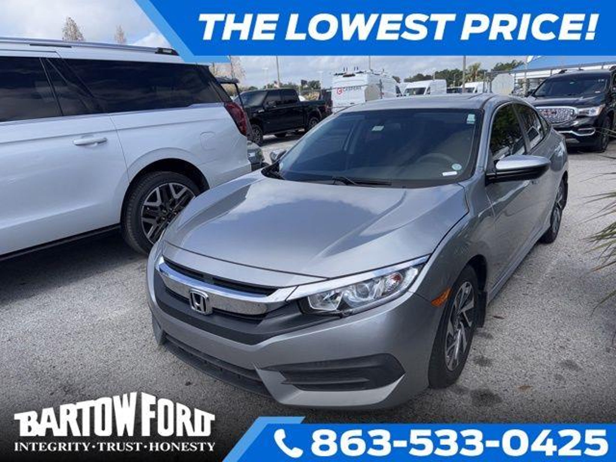 THIS IS A LOCAL FOUR DOOR SEDAN TRADE IN, IT HAS THE EX PACKAGE, THE POWER EQUIPMENT GROUP, THE EX WHEELS AND UP TO 40 MILES PER GALLON. CALL 863-533-0425 TO SCHEDULE A TEST DRIVE TODAY. Recent Arrival! 4D Sedan 2018 Honda Civic EX 2.0L I4 DOHC 16V i-VTEC Honda Civic EX CVT 31/40 City/Highway MPG 2018 Awards: * 2018 KBB.com Brand Image Awards * 2018 KBB.com 10 Most Awarded Brands Kelley Blue Book Brand Image Awards are based on the Brand Watch(tm) study from Kelley Blue Book Market Intelligence. Award calculated among non-luxury shoppers. For more information, visit www.kbb.com. Kelley Blue Book is a registered trademark of Kelley Blue Book Co., Inc. We're Different and We Prove IT! Get an immediate response with Detailed Information by calling us right now. We are also happy to Email or TEXT information back to you per your request. Our vehicles are Fully Serviced and most come with a Warranty..... They are the cleanest, mechanically sound vehicles you will find. Don't hesitate and let this one get away! EMAIL us today to schedule your test drive..... Ask us how WE CAN HELP WITH FINANCING even if your credit is less than average. We specialize in Credit Approvals not only on Ford products but on many other brands we carry as well such as Toyota, Chevrolet, BMW, Chrysler, Dodge, Jeep, GMC, Cadillac, Lincoln, Nissan, Hyundai, Kia, Mercury, Lexus, Honda, Volkswagen and more...... Serving Lakeland, Tampa, Haines City, Lake Wales, Avon Park, Davenport, Plant City, Winter Haven, Sebring, Brandon and all over Florida...... Call or Email us today! We're Different and We Prove IT!