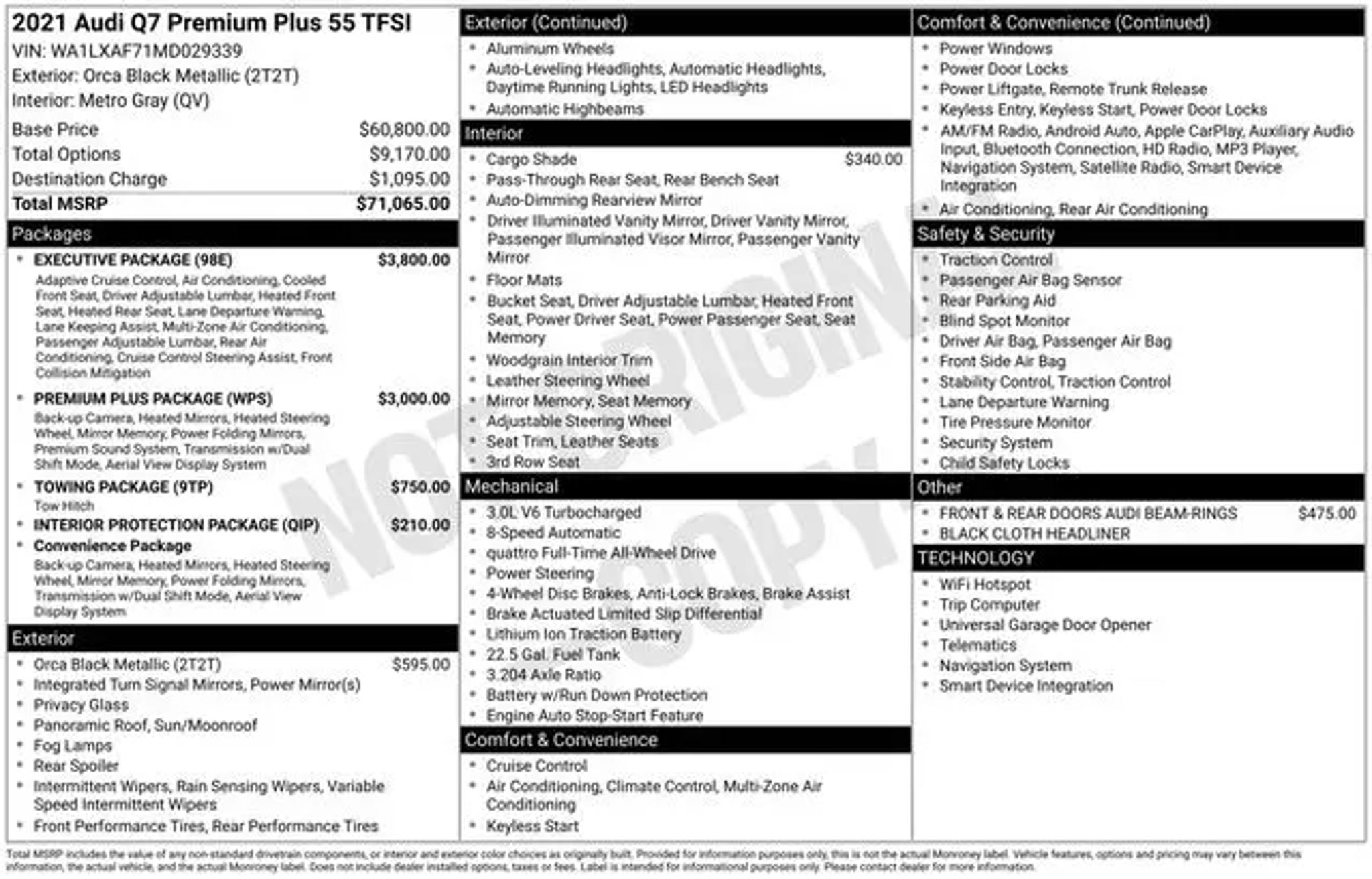 10 Speakers, 3-Spoke Multifunction Steering Wheel w/Paddles, 3.204 Axle Ratio, 3rd row seats: bench, 4-Wheel Disc Brakes, 4-Zone Automatic Climate Control, ABS brakes, Air Conditioning, Alloy wheels, AM/FM radio: SiriusXM, Ambient Interior Lighting Package, Audi Active Lane Assist w/Emergency Assist, Audi Adaptive Cruise Assist w/Traffic Jam Assist, Audi Phone Box w/Wireless Charging, Audi smartphone interface (Apple CarPlay/Android Auto), Auto High-beam Headlights, Auto-dimming Rear-View mirror, Automatic temperature control, Bang & Olufsen 3D Premium Sound System, Black Cloth Headliner, Brake assist, Bumpers: body-color, Compass, Convenience Package, Delay-off headlights, Driver & Passenger Front Seats w/Ventilation, Driver door bin, Driver vanity mirror, Dual front impact airbags, Dual front side impact airbags, Electronic Stability Control, Emergency communication system: Audi connect CARE, PRIME & PLUS, Executive Package, Exterior Parking Camera Rear, Four wheel independent suspension, Front & Rear Doors Audi Beam-Rings, Front anti-roll bar, Front Bucket Seats, Front Center Armrest, Front dual zone A/C, Front fog lights, Front reading lights, Fully automatic headlights, Garage door transmitter: HomeLink, Genuine wood door panel insert, Heated Auto-Dimming Power Folding Exterior Mirrors, Heated door mirrors, Heated Front Bucket Seats, Heated front seats, Heated Rear Seats, Illuminated Door Sills, Illuminated entry, Interior Protection Package, Leather Seating Surfaces, Leather Shift Knob, Leather steering wheel, Low tire pressure warning, Memory seat, Navigation system: Audi MMI Navigation plus with Touch Response, Occupant sensing airbag, Outside temperature display, Overhead airbag, Overhead console, Panic alarm, Passenger door bin, Passenger vanity mirror, Power door mirrors, Power driver seat, Power Liftgate, Power moonroof, Power passenger seat, Power steering, Power windows, Premium Plus Package, Privacy Trunk Cover, Radio data system, Radio: Audi Sound System, Rain sensing wipers, Rear air conditioning, Rear anti-roll bar, Rear Door/Side Windows & Tailgate Sunshades, Rear fog lights, Rear reading lights, Rear seat center armrest, Rear window defroster, Rear window wiper, Reclining 3rd row seat, Remote keyless entry, Roof rack: rails only, Security system, Speed control, Speed-sensing steering, Split folding rear seat, Spoiler, Steering wheel memory, Steering wheel mounted audio controls, Tachometer, Telescoping steering wheel, Tilt steering wheel, Topview Camera System, Tow Hitch Receiver, Towing Package, Traction control, Trip computer, Turn signal indicator mirrors, Variably intermittent wipers, Wheels: 19 5-Arm-Star Design, Wheels: 20 5-Spoke Turbine-Design. Recent Arrival!