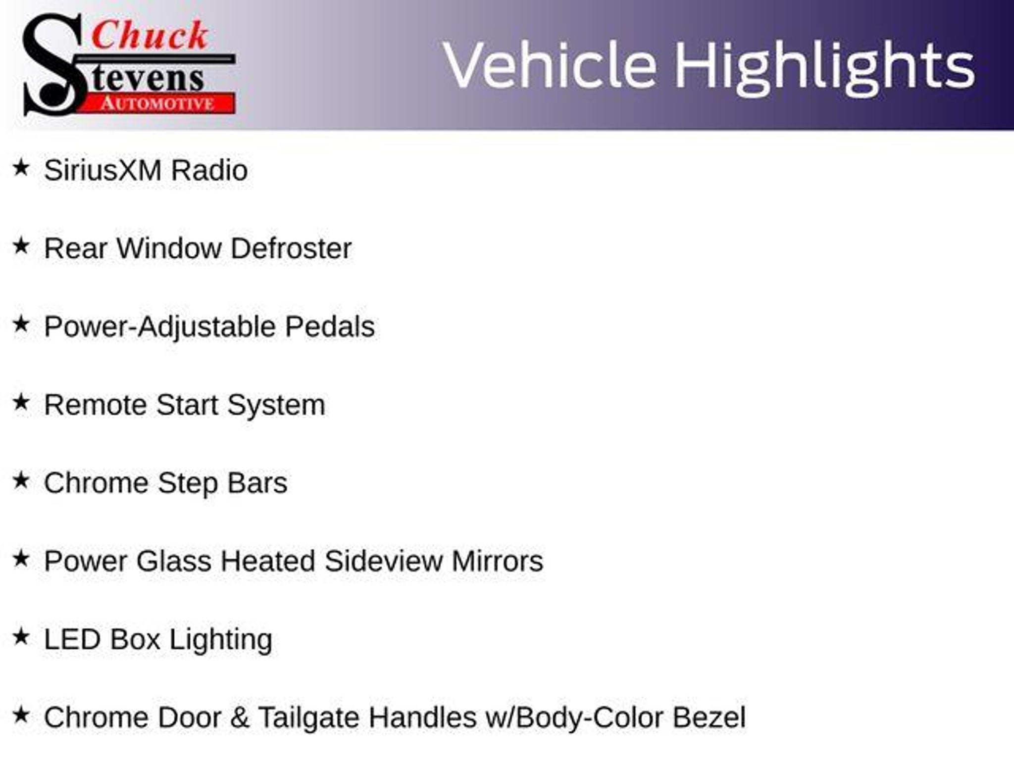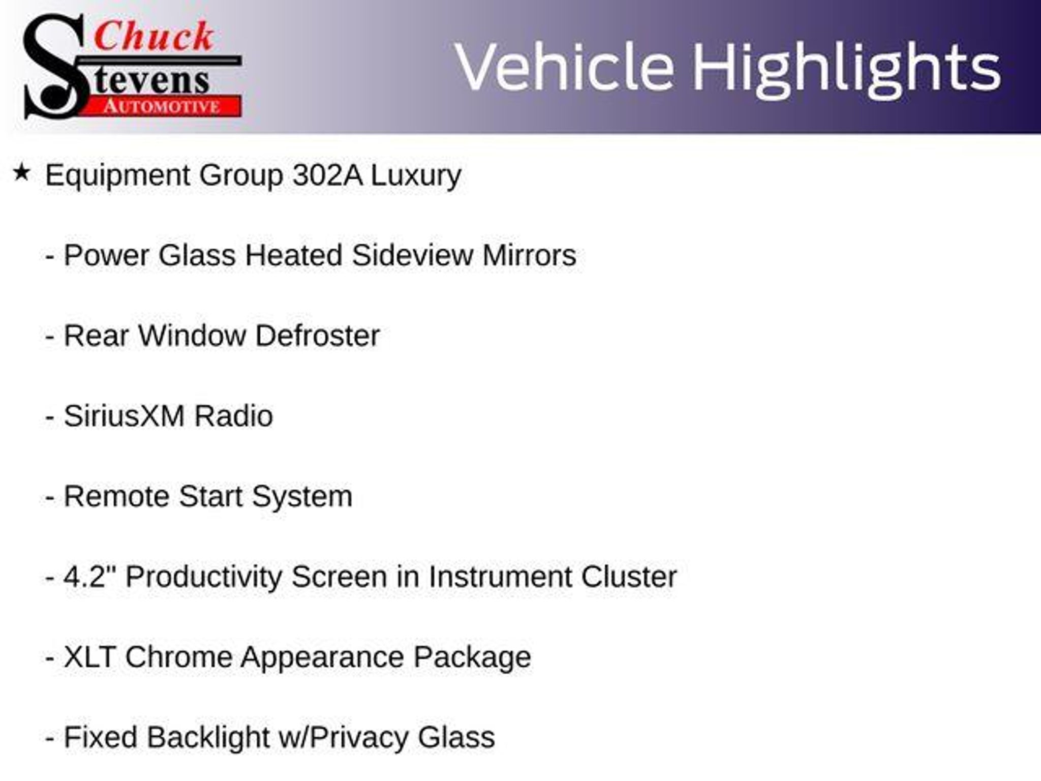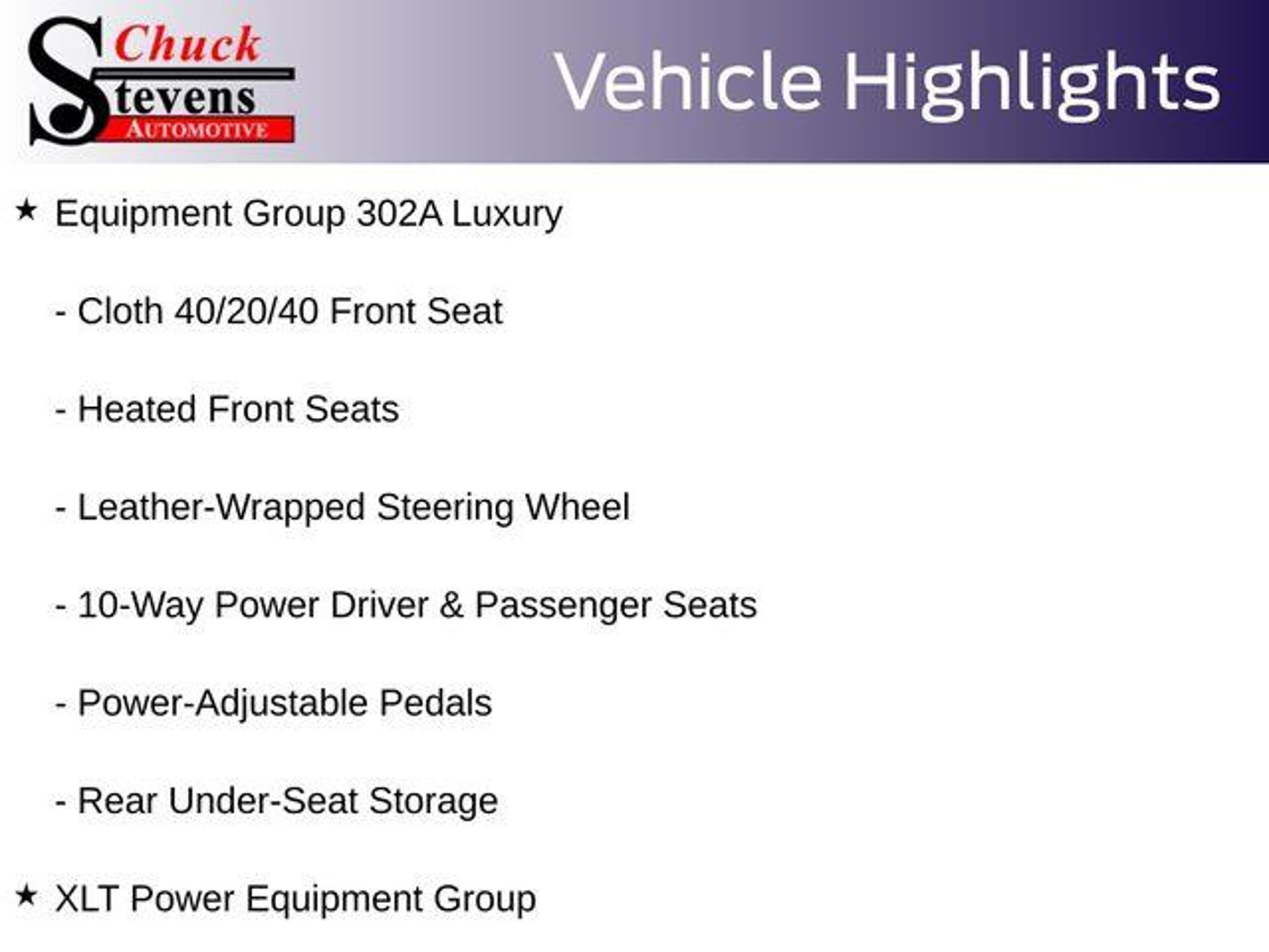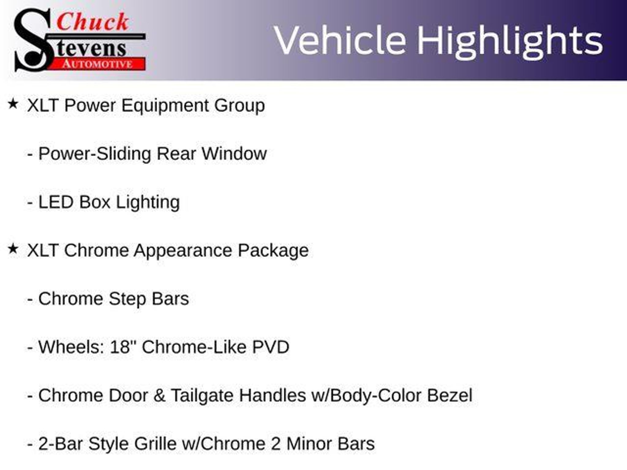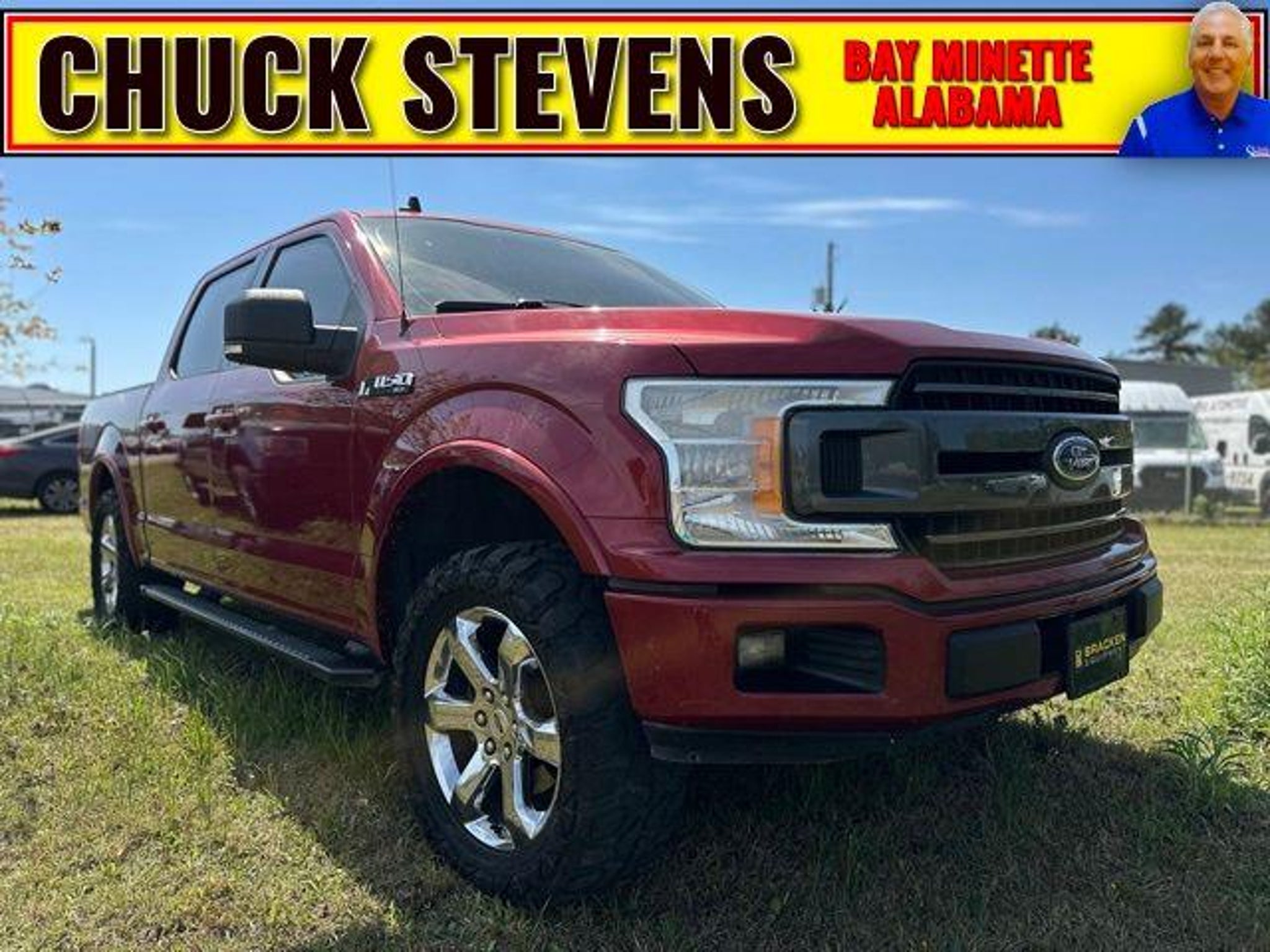 Welcome to Chuck Stevens Ford, located at 1304 HWY 31 South, Bay Minette, Alabama. We are proud to celebrate 25 Years of serving our community as one of the fastest-growing Ford dealers in the Southeast. Our goal is to make your shopping experience transparent, easy, and enjoyable. Every Pre-Owned and Certified vehicle at Chuck Stevens Ford has been fully inspected and reconditioned by a certified technician, giving you confidence in your purchase. Take advantage of our low-price guarantee on this 2019 Ford F-150. This F-150 comes finished in Ruby Red Metallic with a Black interior, making it a wonderful choice for your next vehicle. At Chuck Stevens Ford, we also include our exclusive Lifetime Powertrain Warranty at no additional cost. No gimmicks, no fine print, and serviceable at any certified repair facility nationwide. The online price includes a $2,500 Cash Down or trade equity. To qualify, customers must trade in a vehicle with a minimum appraised value of $2,500 or Cash Down. All prices reflect dealership financing and include a $1,000 finance coupon. See dealer for full details. . 20/26 City/Highway MPG 2019 Ford F-150 XLT 4D SuperCrew XLT Ruby Red Metallic RWD 2.7L V6 EcoBoost 10-Speed Automatic 10-Way Power Driver & Passenger Seats, 2-Bar Style Grille w/Chrome 2 Minor Bars, 4.2 Productivity Screen in Instrument Cluster, Alloy wheels, Auto-Dimming Rear-View Mirror, Chrome Door & Tailgate Handles w/Body-Color Bezel, Chrome Step Bars, Cloth 40/20/40 Front Seat, Equipment Group 302A Luxury, Fixed Backlight w/Privacy Glass, Heated Front Seats, Leather-Wrapped Steering Wheel, LED Box Lighting, Power Glass Heated Sideview Mirrors, Power-Adjustable Pedals, Power-Sliding Rear Window, Rear Under-Seat Storage, Rear Window Defroster, Remote Start System, Single-Tip Chrome Exhaust, SiriusXM Radio, Wheels: 18 Chrome-Like PVD, XLT Chrome Appearance Package, XLT Power Equipment Group. LIFETIME POWERTRAIN PROGRAM included at no additional charge for all vehicles that have less than 80,000 miles. It is one of the most comprehensive powertrain warranty programs in the market. See dealer for details. Please don't buy anywhere until you have us show you our deal.