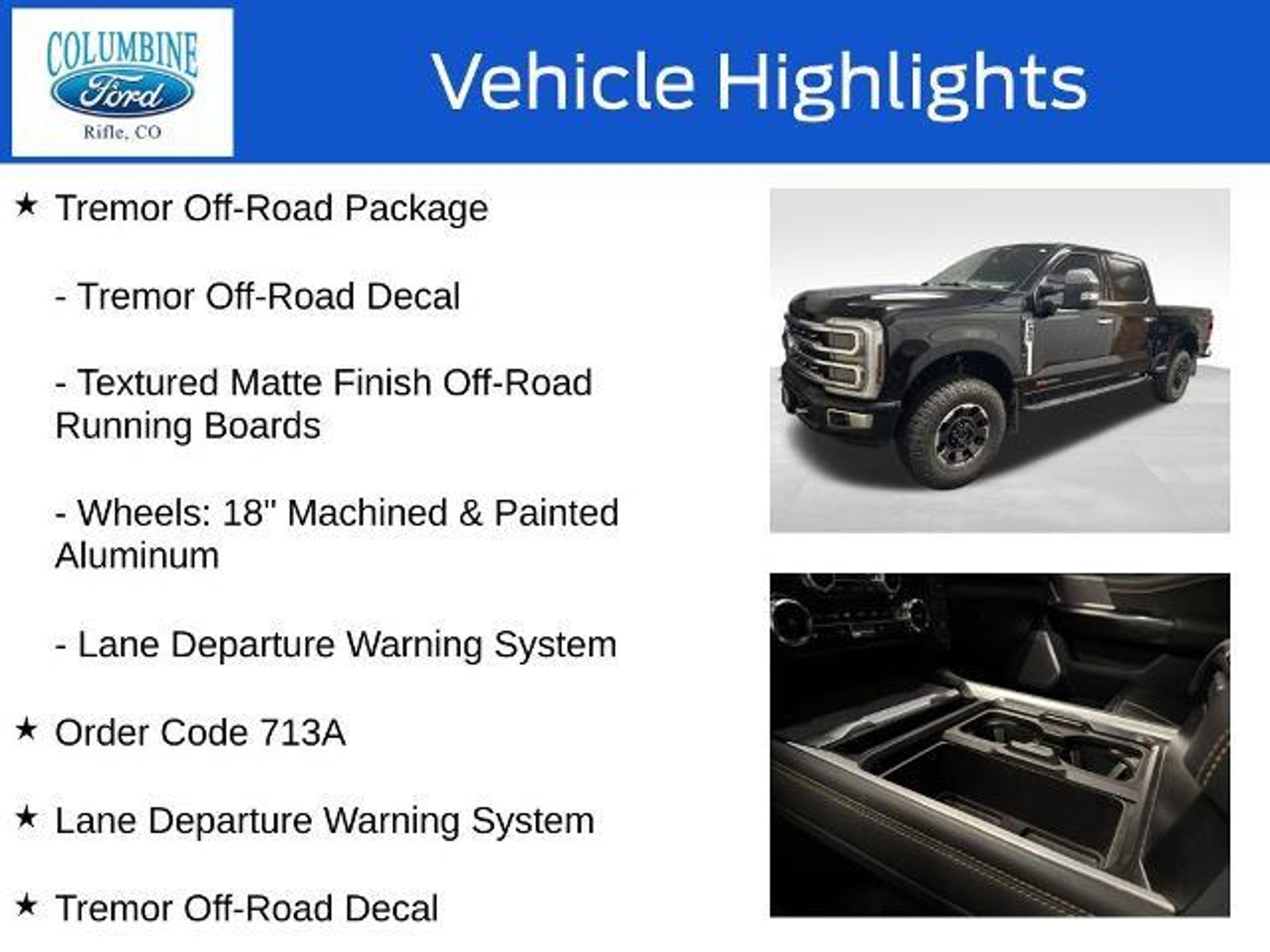 Elevate your off-road adventures with the 2024 Ford F-350SD Platinum. This rugged and capable truck is engineered to conquer any terrain, delivering unparalleled power, versatility, and comfort. Equipped with a robust 6.7L High Output Power Stroke V8 Diesel engine and a 10-Speed Automatic transmission, the F-350SD Platinum offers exceptional towing and hauling capabilities. Tailored to your needs, this vehicle boasts an impressive array of features: - TREMOR OFF-ROAD PACKAGE: Includes unique front springs, rear electronic locking differential, front limited slip differential, performance shock absorbers, and more for uncompromising off-road performance. - TWIN PANEL POWER MOONROOF: Lets you enjoy the great outdoors from the comfort of your cabin. - FRONT & REAR WHEEL WELL LINERS (PRE-INSTALLED): Protect your vehicle from the elements. - FRONT SPLASH GUARDS/MUD FLAPS (PRE-INSTALLED): Keep your ride looking its best, even in the toughest conditions. Elevate your driving experience with the 2024 Ford F-350SD Platinum's exceptional capabilities and premium amenities. This truck is built to handle any challenge, whether you're tackling rugged terrain or navigating the daily commute. Discover the perfect blend of power, comfort, and style in the 2024 Ford F-350SD Platinum. Visit Columbine Ford today and experience the difference for yourself. At Columbine Ford, we’re proud to be Western Colorado’s most trusted dealership and a multi-year recipient of Ford’s prestigious **President’s Award** for exceptional customer satisfaction. Our team is committed to honesty, transparency, and delivering a hassle-free buying experience on every visit. Whether you’re shopping new or pre-owned, you’ll find unbeatable service, western Colorado's largest selection of vehicles, competitive pricing, and a dealership that truly cares. Visit us at **2828 Railroad Ave., Rifle, CO 81650** or call **970-625-1680**. Experience the award-winning difference at **Columbine Ford—where Colorado comes to drive.**