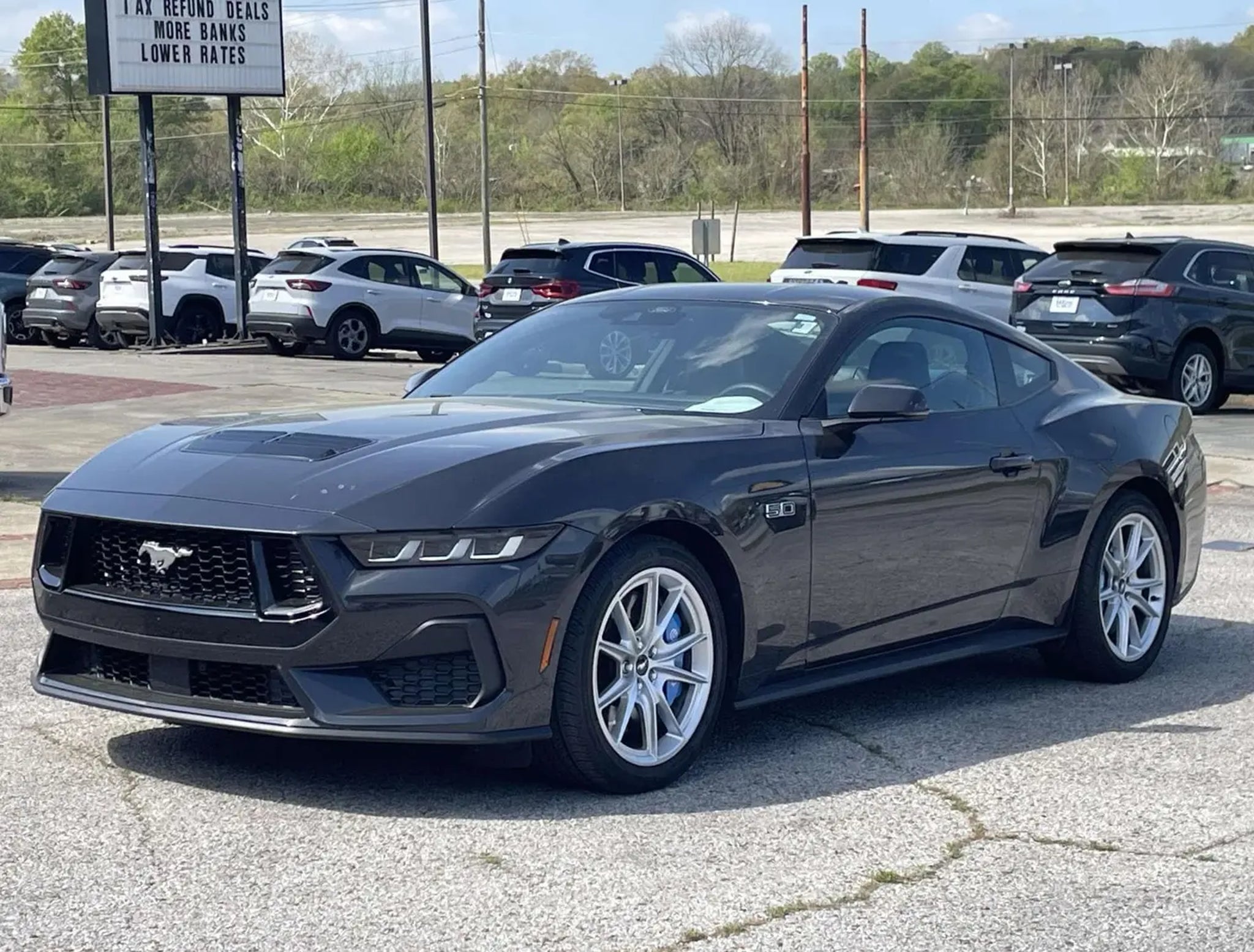 Recent Arrival! Odometer is 5090 miles below market average! CARFAX One-Owner. Clean CARFAX. Dark Matter Gray Metallic 2024 Ford Mustang GT Premium RWD 2D Coupe 5.0L V8 Ti-VCT 10-Speed Automatic As a premier Alabama Ford dealer, we have a huge selection of new and used vehicles from which to choose. C. A. Russell Ford online and offline customers enjoy vehicle specials every day. We offer Ford service & parts, an online inventory, and outstanding financing options, making C. A. Russell Ford a preferred dealer serving Anniston, Jacksonville, Gadsden, Heflin, Talladega, Oxford, Centre, Pell City, Piedmont, Lincoln, Ohatchee, Rainbow City, Lineville, Hoover, Villa Rica, Newnan, Bowdon, Tallapoosa, Harvest and Delta area Ford buyers. Ready to set up a test drive? Visit C. A. Russell Ford in Anniston, AL today! Whether you are looking for a new or used Ford car, truck, or SUV you will find it here. We have helped many customers from Anniston, Jacksonville, Gadsden, Heflin, Talladega, Oxford, Centre, Pell City, Piedmont, Lincoln, Ohatchee, Rainbow City, Lineville, Hoover, Villa Rica, Newnan, Bowdon, Tallapoosa, Harvest and Delta find the Ford of their dreams!