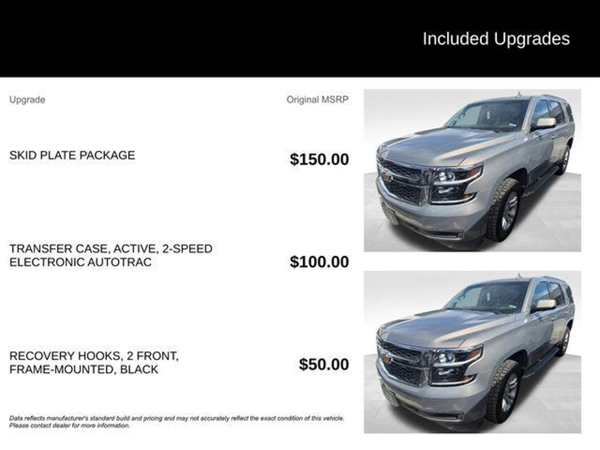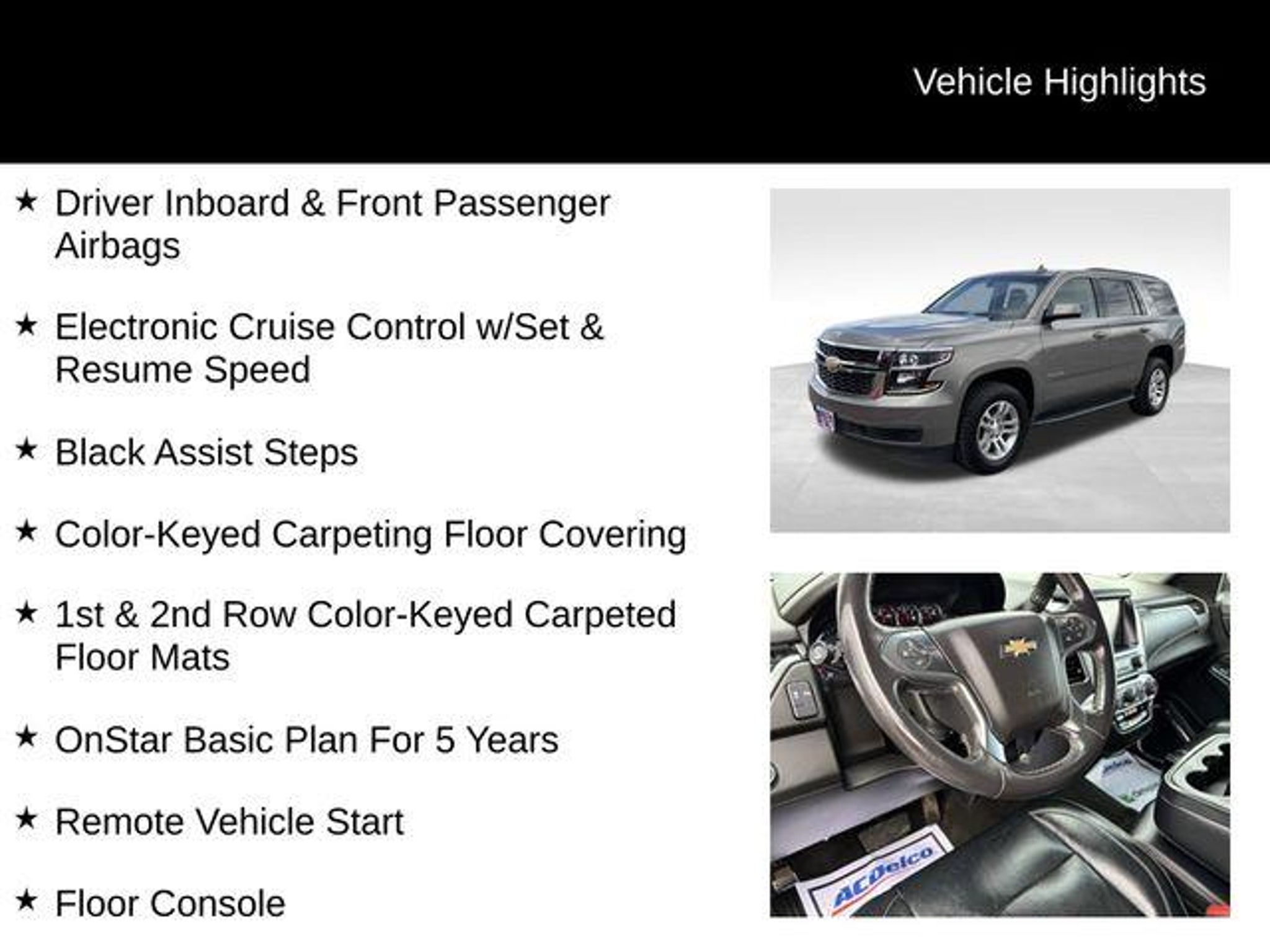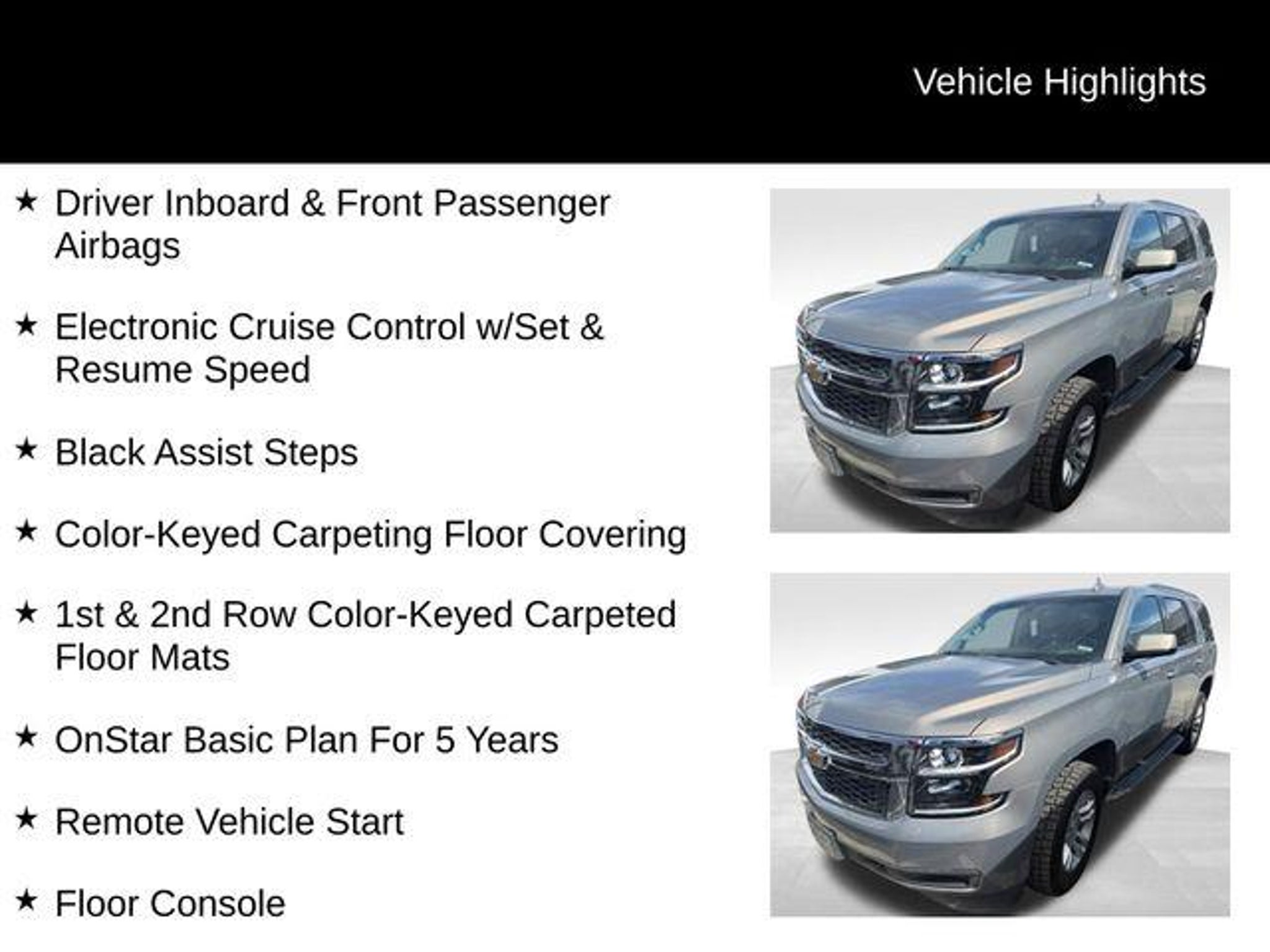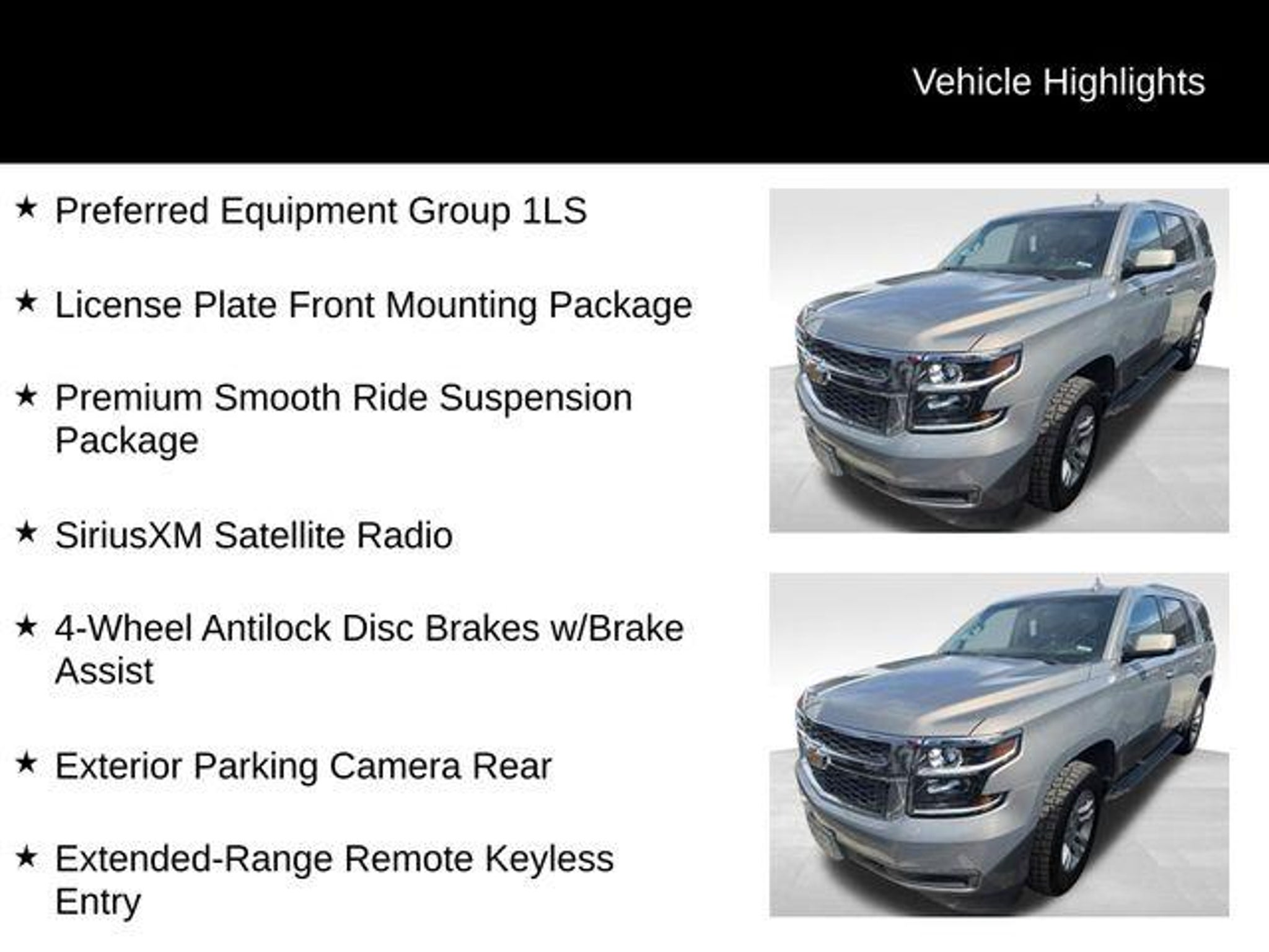Discover the remarkable 2017 Chevrolet Tahoe LS, a versatile and capable SUV that's ready to elevate your driving experience. With its powerful EcoTec3 5.3L V8 engine, 4-wheel drive, and impressive fuel efficiency, this Tahoe is the perfect companion for your adventures. - TRANSFER CASE, ACTIVE, 2-SPEED ELECTRONIC AUTOTRAC with rotary controls, includes neutral position for dinghy towing - SKID PLATE PACKAGE - RECOVERY HOOKS, 2 FRONT, FRAME-MOUNTED, BLACK - License Plate Front Mounting Package - Preferred Equipment Group 1LS - Premium Smooth Ride Suspension Package - SiriusXM Satellite Radio - Electronic Cruise Control w/Set & Resume Speed - Black Assist Steps - 1st & 2nd Row Color-Keyed Carpeted Floor Mats - Apple CarPlay/Android Auto This Tahoe LS is more than just a capable SUV ? it's a premium driving experience. The sleek gray exterior and spacious interior with seating for up to 8 passengers make it the perfect choice for your family's adventures. With a host of advanced features, including a premium audio system, rear park assist, and remote vehicle start, you'll enjoy every mile behind the wheel. Discover the perfect balance of power, efficiency, and versatility in the 2017 Chevrolet Tahoe LS. Visit CASTLE ROCK FORD or call for your V.I.P. appointment at 720-733-7057. Price does not include Tax, Title and Fees.