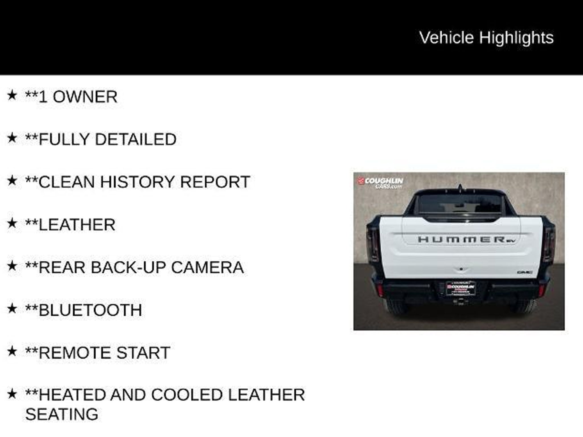 LOWEST PRICES IN COLUMBUS, MARYSVILLE, AND CENTRAL OHIO!! Please call 937-642-0015 for availability. This 2024 GMC Hummer EV Pickup 3X is a true standout in the electric vehicle market. With its impressive all-electric powertrain, advanced technology features, and exceptional off-road capabilities, this Hummer EV is the ultimate choice for those seeking a rugged and versatile pickup that doesn't compromise on performance or style. - 1 OWNER - APPLE CARPLAY/ANDROID AUTO - BLIND SPOT MONITORING - BLUETOOTH - CLEAN HISTORY REPORT - FULLY DETAILED - HEATED AND COOLED LEATHER SEATING - LEATHER - REAR BACK-UP CAMERA - REMOTE START - LPO, ILLUMINATION PACKAGE - LPO, WHEELS, 22 GRAZEN METALLIC WITH FAUX CTIS - LICENSE PLATE KIT, FRONT The Hummer EV's impressive electric motor delivers a thrilling 1-Speed Automatic driving experience with 4WD capability, providing exceptional power and control on and off the road. With an EPA-estimated 59 MPGe in the city and 48 MPGe on the highway, this electric pickup offers exceptional efficiency and range, making it a practical and environmentally-friendly choice. Step inside the Hummer EV and you'll be surrounded by premium features, including heated and cooled leather seating, a Bose Centerpoint Premium 14-Speaker Surround Sound system, and a host of advanced technology and safety features. The Illumination Package adds a touch of style with front off-road auxiliary lights, tailgate step lighting, and interior ambient lighting, ensuring you'll stand out on the road. Whether you're tackling tough terrain or cruising the city streets, this 2024 GMC Hummer EV Pickup 3X is the perfect blend of power, efficiency, and luxury. With its clean history report, one-owner status, and our commitment to providing the best customer service, this Hummer EV is an exceptional value that you won't want to miss. Free Car Fax available. Pricing excludes tax, title fee ($35), documentary fee ($387), Thanks for visiting www.coughlincars.com.