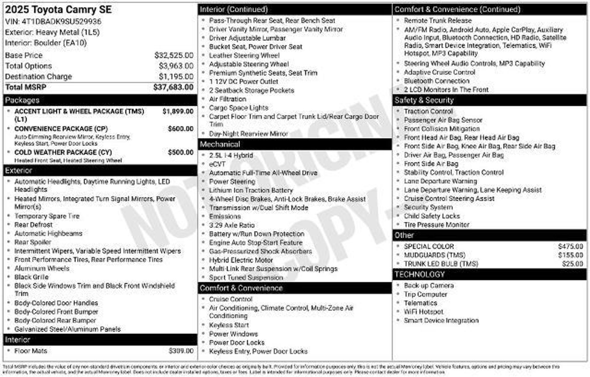 2025 Toyota Camry SE Heavy Metal ABS brakes, Active Cruise Control, Alloy Wheels, Electronic Stability Control, Front dual zone A/C, Heated door mirrors, Illuminated entry, Low tire pressure warning, Remote keyless entry, Traction control. *GRAPPONE PEACE OF MIND* 3 day money back guarantee and 30 day/1,000 mile exchange**Upfront pricing, all the time on every vehicle. 3 month/3000 mile warranty. Free Carfax and 129 point inspection.