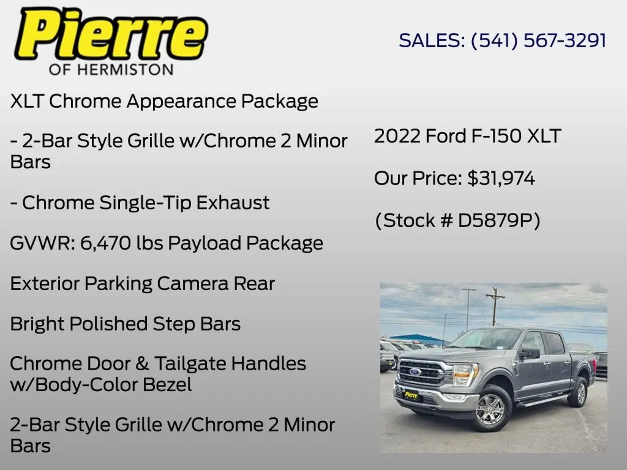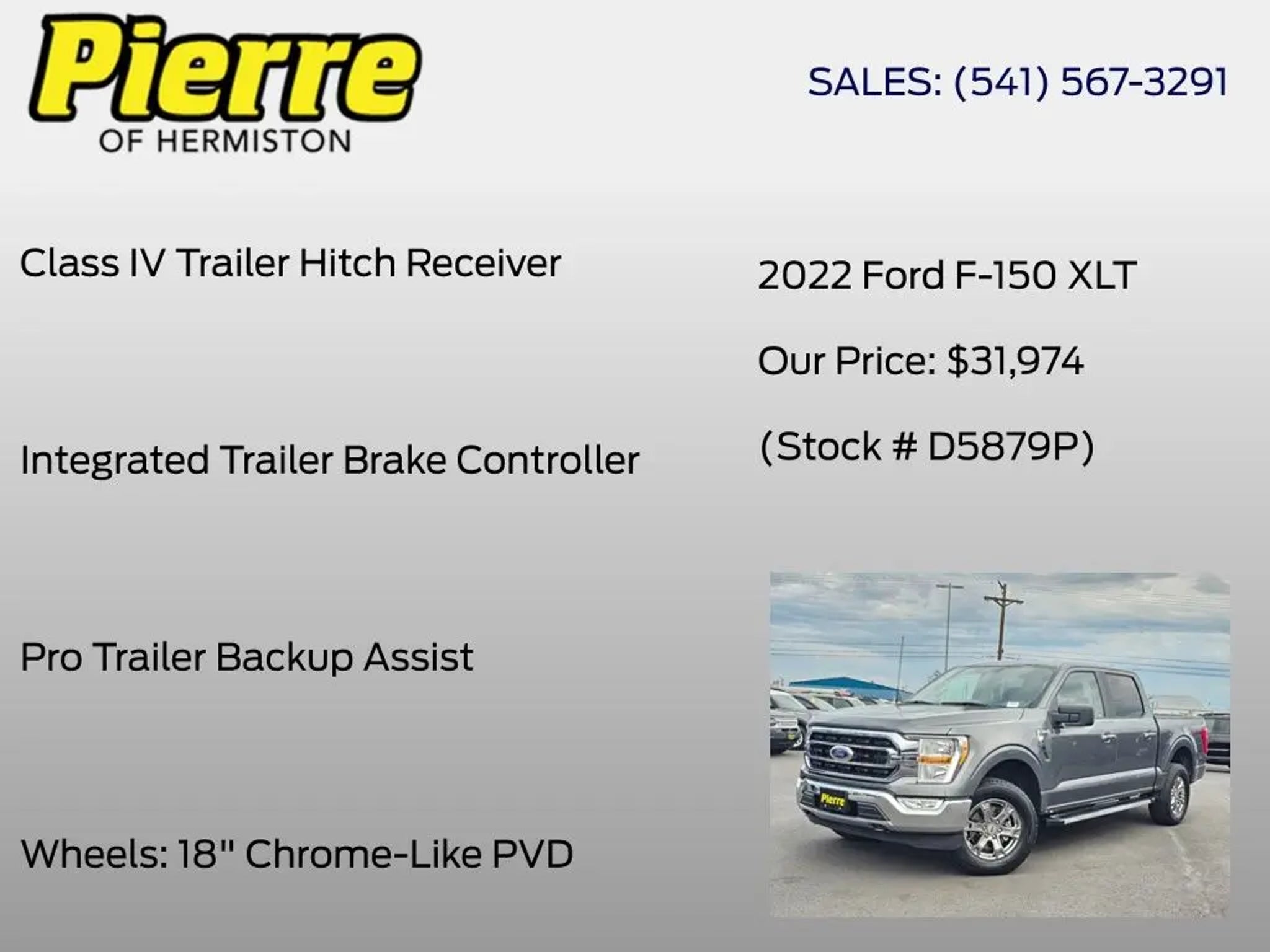 Discover the power and versatility of the 2022 Ford F-150 XLT. This rugged and capable truck is built to handle any task with ease, whether you're tackling a job site or embarking on an adventure. - Equipped with a 2.7L V6 EcoBoost engine and 10-speed automatic transmission, this F-150 delivers impressive performance and efficiency. - The XLT Chrome Appearance Package adds a touch of style with a chrome grille, chrome door and tailgate handles, and chrome single-tip exhaust. - Towing and hauling capabilities are enhanced with the Trailer Tow Package, including a Class IV trailer hitch receiver, integrated trailer brake controller, and Pro Trailer Backup Assist. - Stay connected and entertained with SYNC 4, while the Exterior Parking Camera Rear provides added confidence when maneuvering. - Enjoy the comfort of cloth 40/20/40 front seats and the convenience of power windows, remote keyless entry, and speed control. This 2022 Ford F-150 XLT is the perfect blend of capability, technology, and style. Experience the power and versatility that only a Ford truck can deliver. Pierre of Hermiston has a huge selection of new and used vehicles to choose from. We specialize in Trucks and have an excellent selection, including Certified Pre-owned. We provide great service, great prices, and a great experience, as proven by our excellent customer ratings! These ratings are a testament to our commitment to providing the best service. We are non-pushy, genuine, and honest. Pierre Auto of Hermiston is a family owned and operated dealership since 1947 serving Hermiston, Umatilla, Irrigon Mcnary Charlestown Stanfield Echo Hinkle Pendleton Boardman Heppner La Grande Pilot Rock Lexington Meacham Ione Arlington Bickleton Paterson Touchet Athena Milton-Freewater Prescott Waitsburg The Dalles Goldendale Walla Walla Tri-Cities Pasco Kennewick Richland West Richland and Benton City. Our friendly staff is funny, approachable, and very knowledgeable. We are trained to serve you, and we will bend over backwards to help you find the financing and a vehicle that meets your needs.