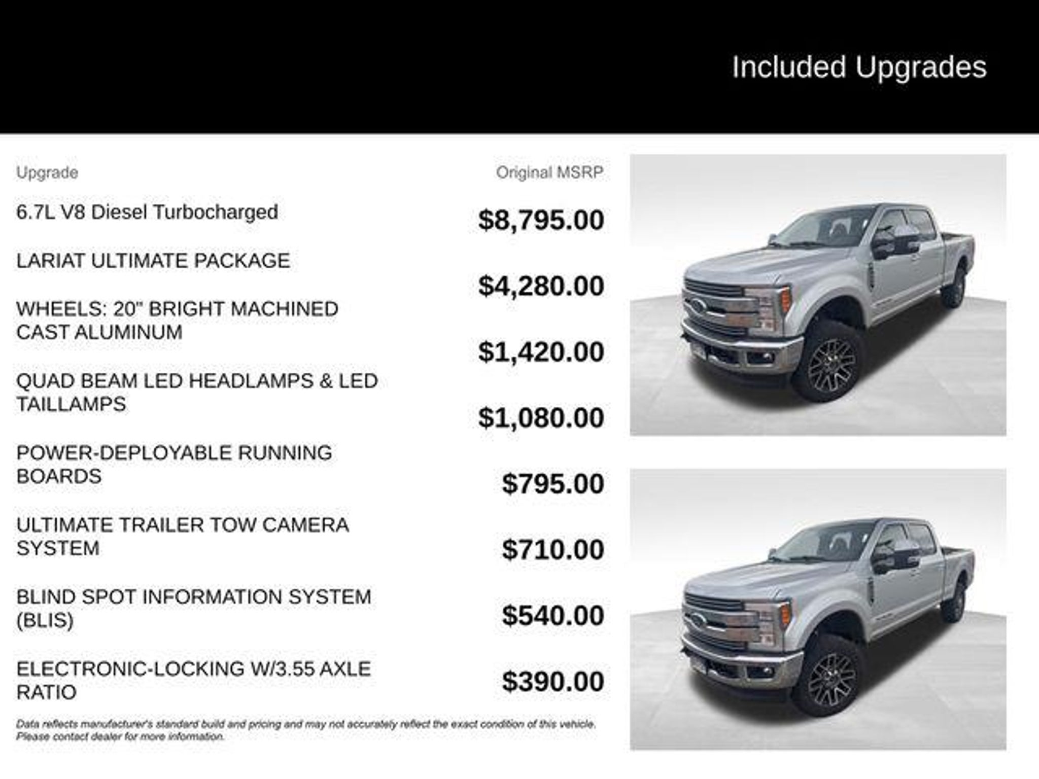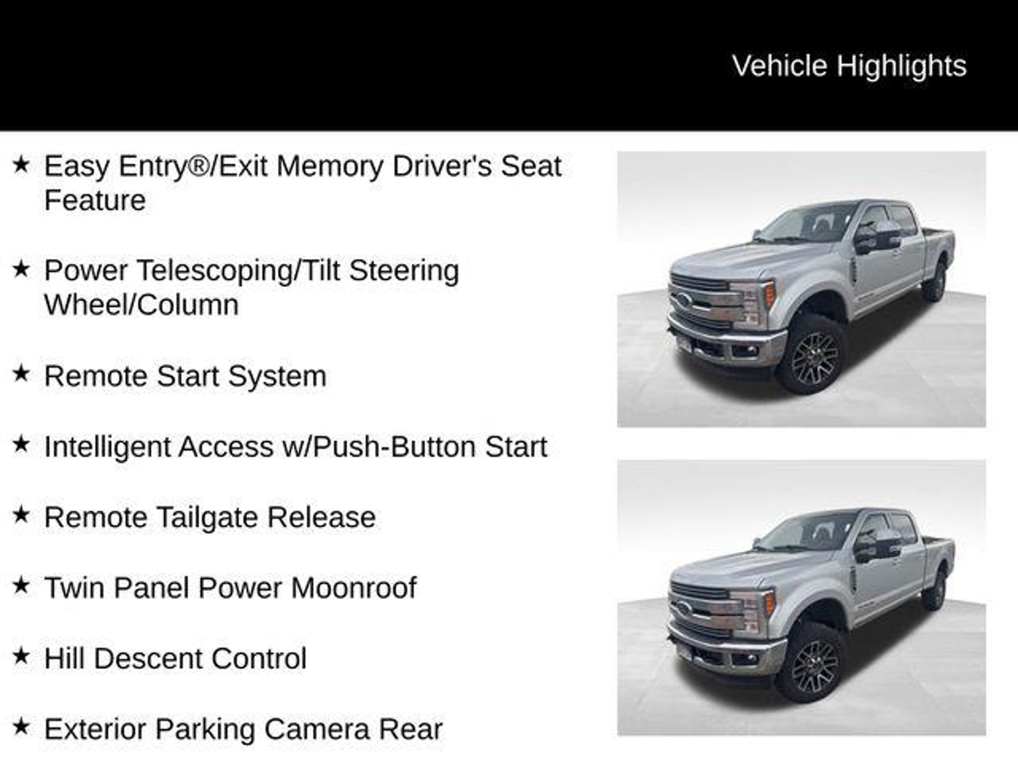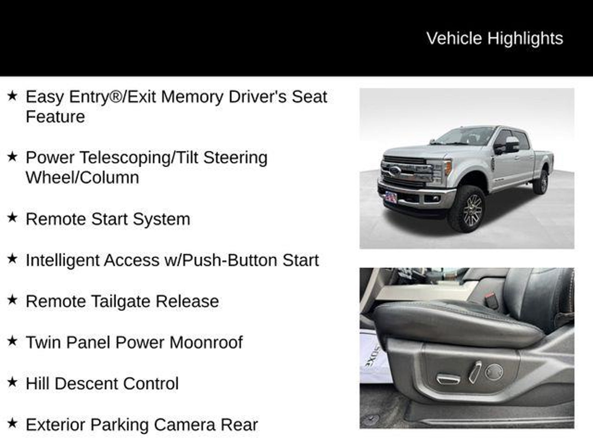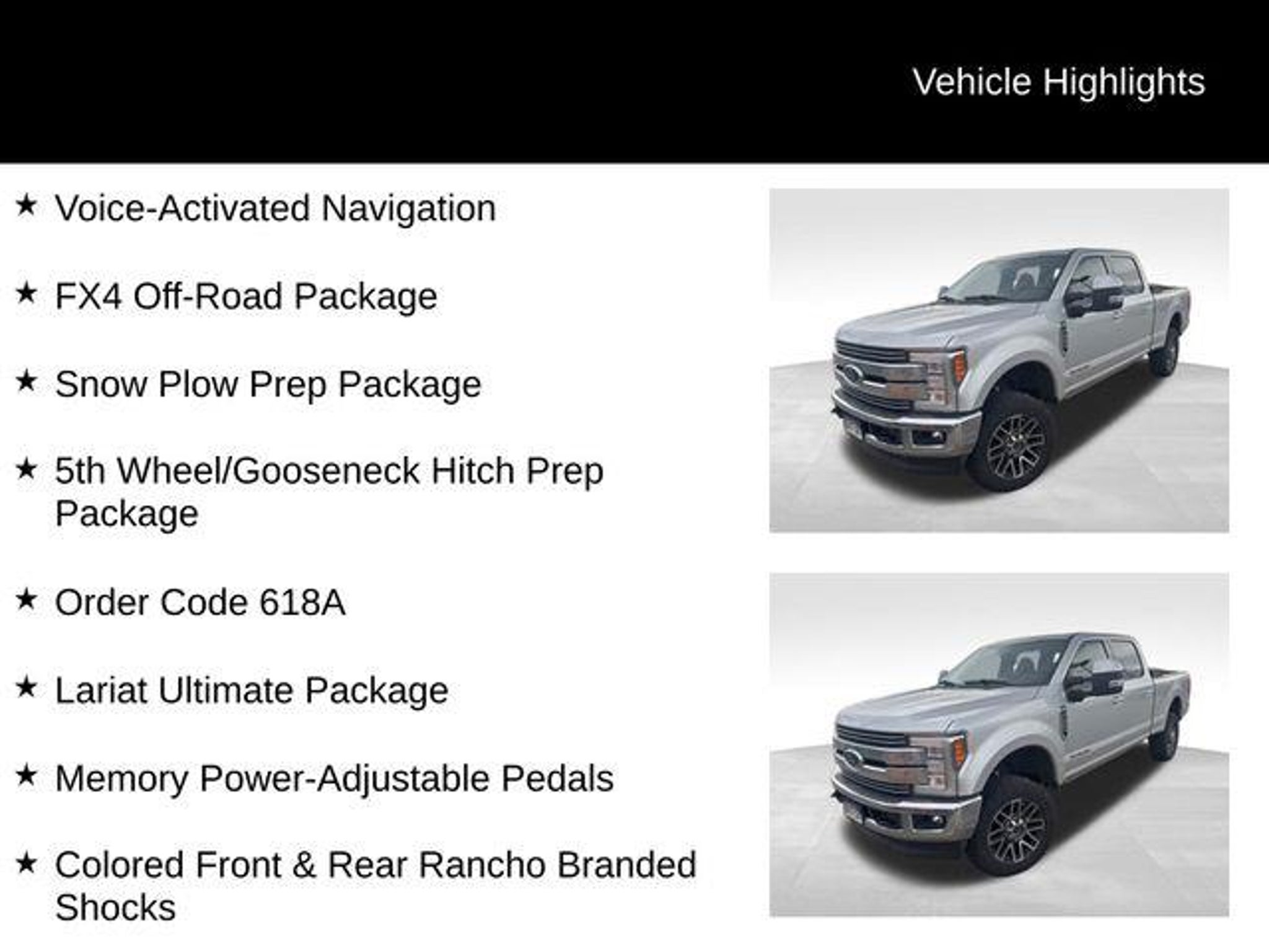 Discover the ultimate heavy-duty workhorse with this exceptional 2017 Ford F-350SD Lariat. Boasting a powerful 6.7L Power Stroke V8 Turbodiesel engine and a robust 4WD drivetrain, this truck is engineered to conquer any terrain or task with ease. - FX4 Off-Road Package with Hill Descent Control, Rancho Branded Shocks, and Skid Plates - Power-Deployable Running Boards for effortless entry and exit - Rapid-Heat Supplemental Cab Heater for cold-weather comfort - Snow Plow Prep Package for versatile winter use - 5th Wheel/Gooseneck Hitch Prep Package for unparalleled towing capabilities - Quad Beam LED Headlamps and LED Taillamps for superior visibility - Blind Spot Information System (BLIS) with Cross-Traffic Alert and Trailer Tow The Lariat Ultimate Package elevates this F-350SD to a new level of luxury and convenience. Enjoy the comfort of heated and cooled power-adjustable front seats with memory settings, the convenience of a power-telescoping and tilting steering wheel, and the peace of mind provided by the Ultimate Trailer Tow Camera System. Whether you're tackling tough jobs or embarking on adventurous road trips, this Ford F-350SD Lariat is the ultimate companion. Its impressive capabilities, advanced technology, and premium features make it the perfect choice for those who demand the very best in a heavy-duty pickup. Experience the power and versatility of this exceptional vehicle for yourself. Visit CASTLE ROCK FORD or call for your V.I.P. appointment at 720-733-7057. Price does not include Tax, Title and Fees.