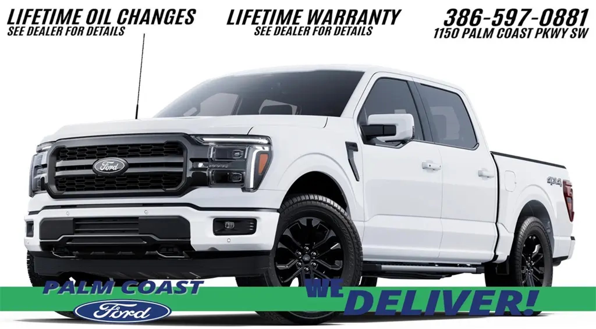 Recent Arrival! 2025 Ford F-150 Lariat 4WD 5.0L V8 10-Speed Automatic Oxford White 4WD. CARFAX One-Owner. Equipped with Equipment Group 501A Mid (6 Angular Bright Anodized Step Bar, Illuminated Driver & Passenger Visors, Power-Sliding Rear Window, and Wheels: 20 Chrome-Like PVD), FX4 Off-Road Package (4x4 FX4 Off-Road Bodyside Decal, Hill Descent Control, Monotube Rear Shocks, Off-Road Tuned Front Shock Absorbers, Rock Crawl Mode, and Tray Style Floor Liner w/o Carpet Mats), Tow/Haul Package, 4WD, 4-Wheel Disc Brakes, 8 Speakers, ABS brakes, ActiveX Trimmed Bucket Seats, Adjustable pedals, Air Conditioning, Alloy wheels, AM/FM radio: SiriusXM with 360L, Auto High-beam Headlights, Auto-dimming door mirrors, Auto-dimming Rear-View mirror, Automatic temperature control, Brake assist, Bumpers: chrome, Chrome wheels, Compass, Delay-off headlights, Driver door bin, Driver vanity mirror, Dual front impact airbags, Dual front side impact airbags, Electronic Stability Control, Emergency communication system: SYNC 4 911 Assist, Front anti-roll bar, Front Bucket Seats, Front Center Armrest, Front dual zone A/C, Front fog lights, Front License Plate Bracket, Front reading lights, Front wheel independent suspension, Fully automatic headlights, Garage door transmitter, Heated door mirrors, Heated front seats, Heated steering wheel, Illuminated entry, Internet access capable: FordPass Connect 5G, Low tire pressure warning, Memory seat, Navigation system: Connected Navigation, Occupant sensing airbag, Outside temperature display, Overhead airbag, Overhead console, Panic alarm, Passenger door bin, Passenger vanity mirror, Pedal memory, Power door mirrors, Power driver seat, Power passenger seat, Power steering, Power windows, Radio data system, Radio: B&O Sound System by Bang & Olufsen, Rain sensing wipers, Rear reading lights, Rear seat center armrest, Rear step bumper, Rear window defroster, Remote keyless entry, Security system, Speed control, Split folding rear seat, Steering wheel mounted audio controls, SYNC 4 w/Enhanced Voice Recognition, Tachometer, Telescoping steering wheel, Tilt steering wheel, Traction control, Trip computer, Turn signal indicator mirrors, Variably intermittent wipers, Ventilated front seats, Voltmeter, and Wheels: 18 Chrome-Like PVD. Palm Coast Ford, We're Not That Far! Free deliveries within 200 miles. Call us today to experience the difference, (386) 447-3380.