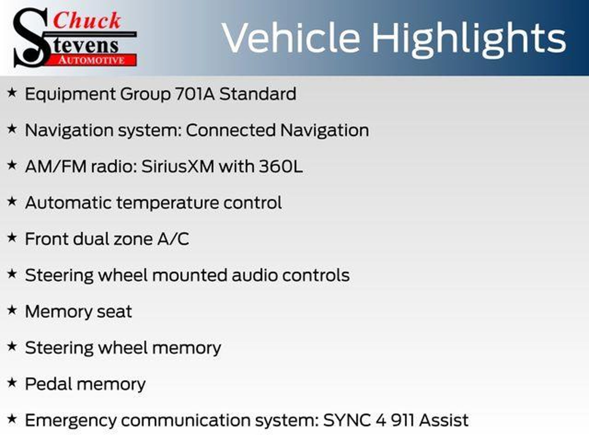 Welcome to Chuck Stevens Ford, located at 1304 HWY 31 South, Bay Minette, Alabama. We are proud to celebrate 25 Years of serving our community as one of the fastest-growing Ford dealers in the Southeast. Our goal is to make your shopping experience transparent, easy, and enjoyable. Every Pre-Owned and Certified vehicle at Chuck Stevens Ford has been fully inspected and reconditioned by a certified technician, giving you confidence in your purchase. Take advantage of our low-price guarantee on this 2024 Ford F-150. This F-150 comes finished in Antimatter Blue Metallic with a Black interior, making it a wonderful choice for your next vehicle. At Chuck Stevens Ford, we also include our exclusive Lifetime Powertrain Warranty at no additional cost. No gimmicks, no fine print, and serviceable at any certified repair facility nationwide. The online price includes a $2,500 Cash Down or trade equity. To qualify, customers must trade in a vehicle with a minimum appraised value of $2,500 or Cash Down. All prices reflect dealership financing and include a $1,000 finance coupon. See dealer for full details. . Certified. CARFAX One-Owner. Recent Arrival! Odometer is 18812 miles below market average! 2024 Ford F-150 Platinum 4D SuperCrew Platinum Antimatter Blue Metallic 4WD 3.5L PowerBoost Full-Hybrid V6 10-Speed Automatic Ford Gold Certified Details: * Vehicle History * Roadside Assistance * 172 Point Inspection * Limited Warranty: 12 Month/12,000 Mile (whichever comes first) after new car warranty expires or from certified purchase date * Powertrain Limited Warranty: 84 Month/100,000 Mile (whichever comes first) from original in-service date * and 22,000 FordPass Rewards Points to use toward first two maintenance visits * Transferable Warranty * Warranty Deductible: $100 Alloy wheels, AM/FM radio: SiriusXM with 360L, Auto High-beam Headlights, Automatic temperature control, Electronic Locking w/3.73 Axle Ratio, Emergency communication system: SYNC 4 911 Assist, Equipment Group 701A Standard, Front dual zone A/C, Front fog lights, Fully automatic headlights, Heated front seats, Heated rear seats, Memory seat, Navigation system: Connected Navigation, Pedal memory, Steering wheel memory, Steering wheel mounted audio controls, SYNC 4 w/Enhanced Voice Recognition, Telescoping steering wheel, Tilt steering wheel, Tough Bed Spray-In Bedliner, Variably intermittent wipers, Ventilated front seats, Wheels: 20 Painted Gloss Ebony Black. LIFETIME POWERTRAIN PROGRAM included at no additional charge f