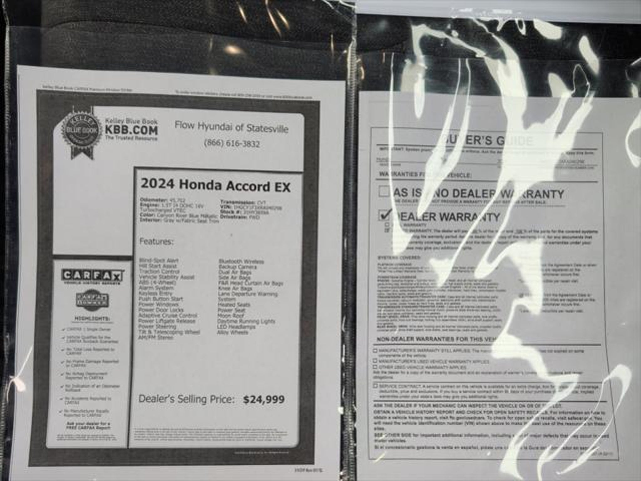Details > 2024 Honda Accord EX 4DR Sedan For Sale in Statesville, NC Private Party Sellers Click here to place your ad now! You auta tell them you saw the ad in AutaBuy when you call or email. 1/40 2/40 3/40 4/40 5/40 6/40 7/40 8/40 9/40 10/40 11/40 12/40 13/40 14/40 15/40 16/40 17/40 18/40 19/40 20/40 21/40 22/40 23/40 24/40 25/40 26/40 27/40 28/40 29/40 30/40 31/40 32/40 33/40 34/40 35/40 36/40 37/40 38/40 39/40 40/40 View 40 Photos View All Add to My Garage Parked in Your Garage! Flow Hyundai of Statesville Contact Seller: I would like to: Make Offer Check Availability Ask A Question Request More Photos Check Financing Options Send a copy of this message to me Add this listing to my garage Send to Mobile Mileage 45,703 Exterior Color Canyon River Blue Me Interior Color Unknown Doors 4 Engine 1.5L I4 Stock # 31HY3659A VIN 1HGCY1F3XRA040298 Estimated Monthly Payment $444 mo Apply Now J.J. Best Banc & Co. 2024 Honda Accord EX 4DR Sedan Description: Flow Hyundai of Statesville · Mileage: 45,703 · Color: Canyon River Blue Me Price: $25,499. Mileage 45,703 Exterior Color Canyon River Blue Me Interior Color Unknown Doors 4 Engine 1.5L I4 Stock # 31HY3659A VIN 1HGCY1F3XRA040298 Estimated Monthly Payment $444 mo Apply Now J.J. Best Banc & Co. Add to My Garage Parked in Your Garage! Message Seller Flow Hyundai of Statesville Contact Seller: I would like to: Make Offer Check Availability Ask A Question Request More Photos Check Financing Options Send a copy of this message to me Add this listing to my garage Offered for sale by Flow Hyundai of Statesville STATESVILLE, NC Price: $25,499. Offered for sale by Flow Hyundai of Statesville STATESVILLE, NC [entire inventory] Ask Auta Intelligence The first collector-car AI built directly into a classic car marketplace How many Accords were produced in Blue? What trim levels were available for this model? Where is this located? When was this model first introduced? What factory options were available on this model? How far is this from me? What transmission options did these offer? What does this VIN number tell me? What kind of mileage do these get? What engine options did these come with? Tell me more about this model How easy are parts to find for this model? What colors did these come in? How many of these were produced? Can you show me more cars for a similar price? Do you have a similar car to sell? List It Now! Questions about this car? Ask Auta Intelligence for production numbers, available options, etc. · Subscribe to AutaBuy! · Send a Gift Subscription Notice to a Friend