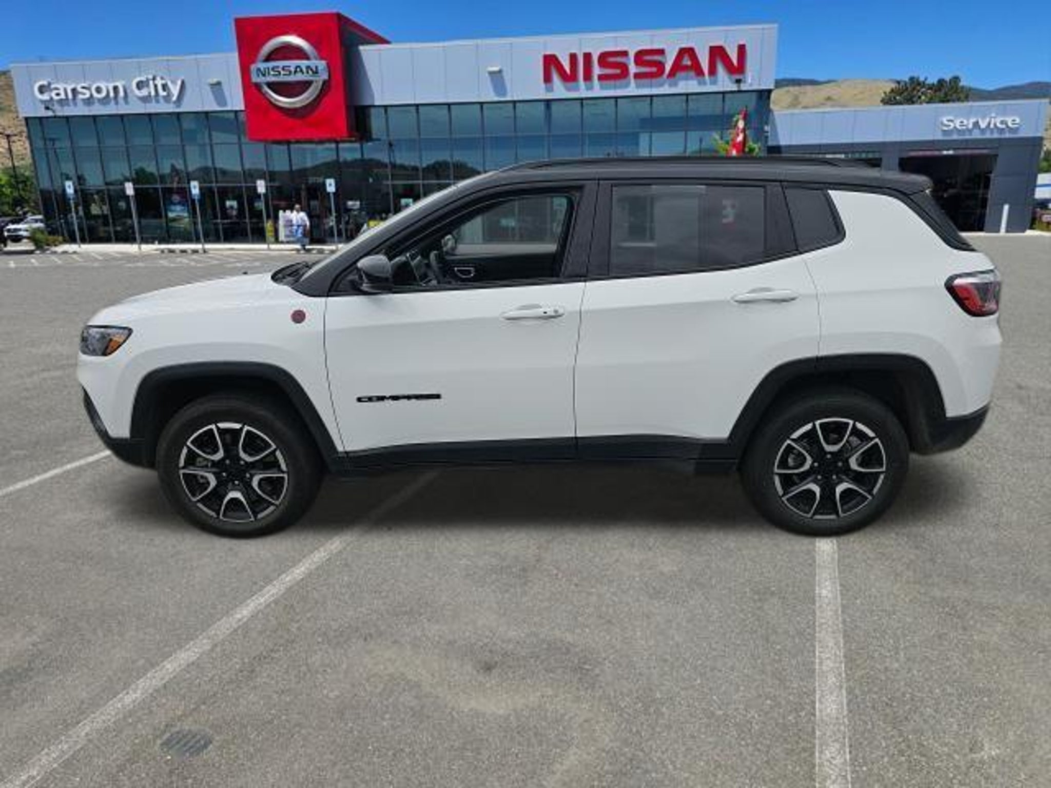 * Save money on sales tax over buying in Reno! * 3 Month/3,000 Mile Limited Powertrain Warranty on Every Pre-Owned Vehicle! (see dealer for details) This 2024 Jeep Compass Trailhawk is a true off-road adventurer, ready to take on any terrain with its impressive 4WD capabilities. Powered by a 2.0L I4 DOHC engine and an 8-speed automatic transmission, this Compass delivers an exceptional balance of power and efficiency, with an EPA-estimated 24 city/32 highway MPG. - Automatic temperature control - Front dual zone A/C - Remote keyless entry - Front fog lights - Fully automatic headlights - Spoiler - Turn signal indicator mirrors - Auto-dimming Rear-View mirror - ParkView Rear Back-Up Camera - Security system - Wheels: 17 x 6.5 Painted Black Aluminum - Rain sensing wipers This Compass Trailhawk is more than just a capable off-road machine "“ it's also packed with a wealth of premium features that will elevate your driving experience. From the 10.1 Uconnect 5 touchscreen display to the 4G LTE Wi-Fi hotspot, this vehicle is designed to keep you connected and entertained on every journey. The Trailhawk trim also boasts a host of advanced safety technologies, including Blind Spot Monitoring, Rear Cross-Path Detection, and ParkSense Rear Park Assist, ensuring you can navigate the road with confidence. And with the Jeep Connect emergency communication system, you'll have added peace of mind knowing help is just a button away. Whether you're tackling the rugged trails or cruising down the highway, this 2024 Jeep Compass Trailhawk is the perfect companion. With its striking white/off-white exterior and premium interior features, this Compass is sure to turn heads and make every drive an adventure. * Save on sales tax over buying in Reno! We may be the newest and fastest-growing franchise dealership in Nevada, but that hasn't stopped us from recruiting an automotive dream team. Our staff includes long-time Nissan product experts on both our sales and management teams. Our goal is to make buying your car a fun and easy experience. Se habla español en cada parte de la empresa: ventas, finanzas, reparación y en la oficina. Si prefiere visitar este sitio en español, seleccione En Español al pie de la página.