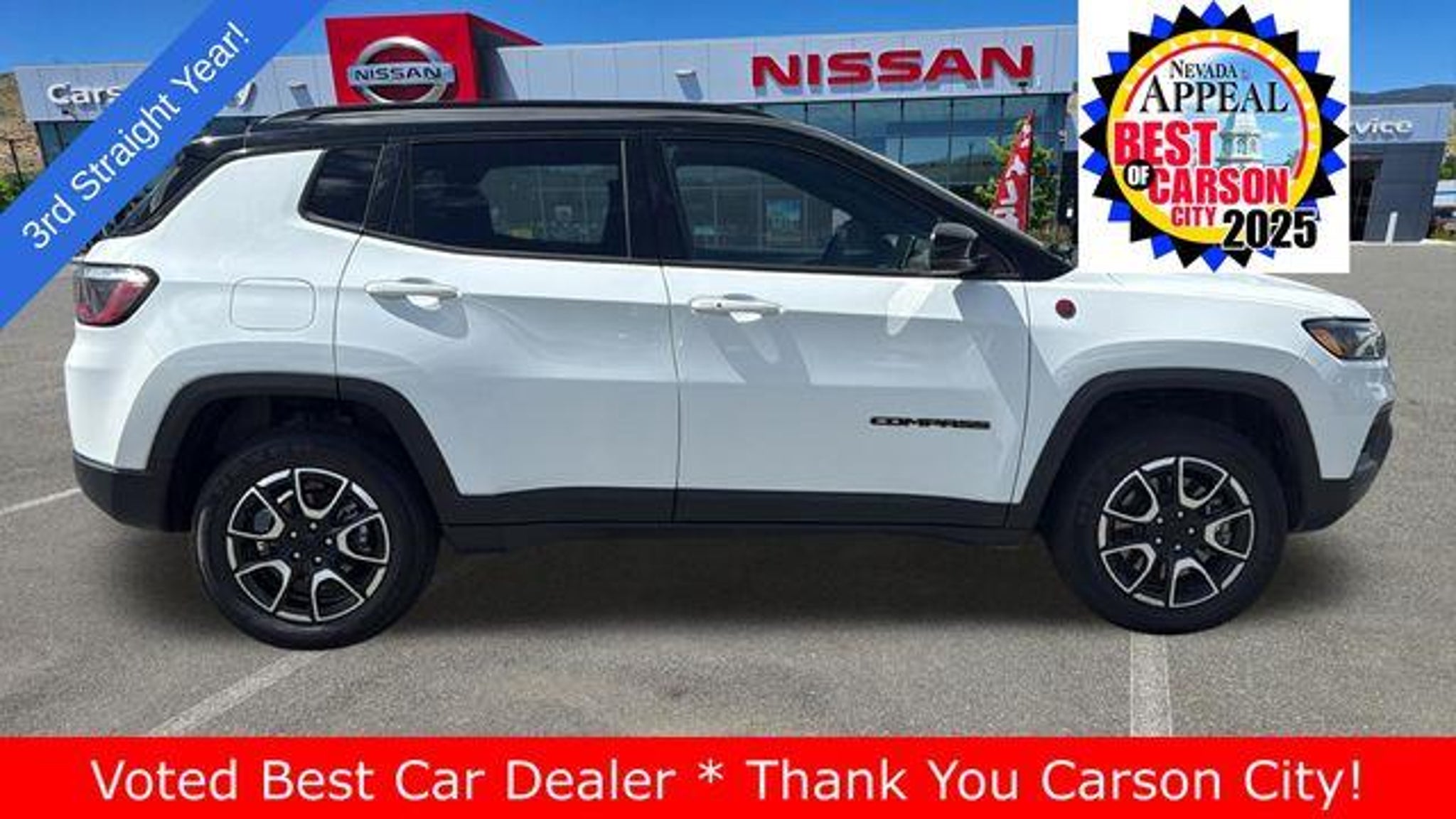 * Save money on sales tax over buying in Reno! * 3 Month/3,000 Mile Limited Powertrain Warranty on Every Pre-Owned Vehicle! (see dealer for details) This 2024 Jeep Compass Trailhawk is a true off-road adventurer, ready to take on any terrain with its impressive 4WD capabilities. Powered by a 2.0L I4 DOHC engine and an 8-speed automatic transmission, this Compass delivers an exceptional balance of power and efficiency, with an EPA-estimated 24 city/32 highway MPG. - Automatic temperature control - Front dual zone A/C - Remote keyless entry - Front fog lights - Fully automatic headlights - Spoiler - Turn signal indicator mirrors - Auto-dimming Rear-View mirror - ParkView Rear Back-Up Camera - Security system - Wheels: 17 x 6.5 Painted Black Aluminum - Rain sensing wipers This Compass Trailhawk is more than just a capable off-road machine "“ it's also packed with a wealth of premium features that will elevate your driving experience. From the 10.1 Uconnect 5 touchscreen display to the 4G LTE Wi-Fi hotspot, this vehicle is designed to keep you connected and entertained on every journey. The Trailhawk trim also boasts a host of advanced safety technologies, including Blind Spot Monitoring, Rear Cross-Path Detection, and ParkSense Rear Park Assist, ensuring you can navigate the road with confidence. And with the Jeep Connect emergency communication system, you'll have added peace of mind knowing help is just a button away. Whether you're tackling the rugged trails or cruising down the highway, this 2024 Jeep Compass Trailhawk is the perfect companion. With its striking white/off-white exterior and premium interior features, this Compass is sure to turn heads and make every drive an adventure. * Save on sales tax over buying in Reno! We may be the newest and fastest-growing franchise dealership in Nevada, but that hasn't stopped us from recruiting an automotive dream team. Our staff includes long-time Nissan product experts on both our sales and management teams. Our goal is to make buying your car a fun and easy experience. Se habla español en cada parte de la empresa: ventas, finanzas, reparación y en la oficina. Si prefiere visitar este sitio en español, seleccione En Español al pie de la página.