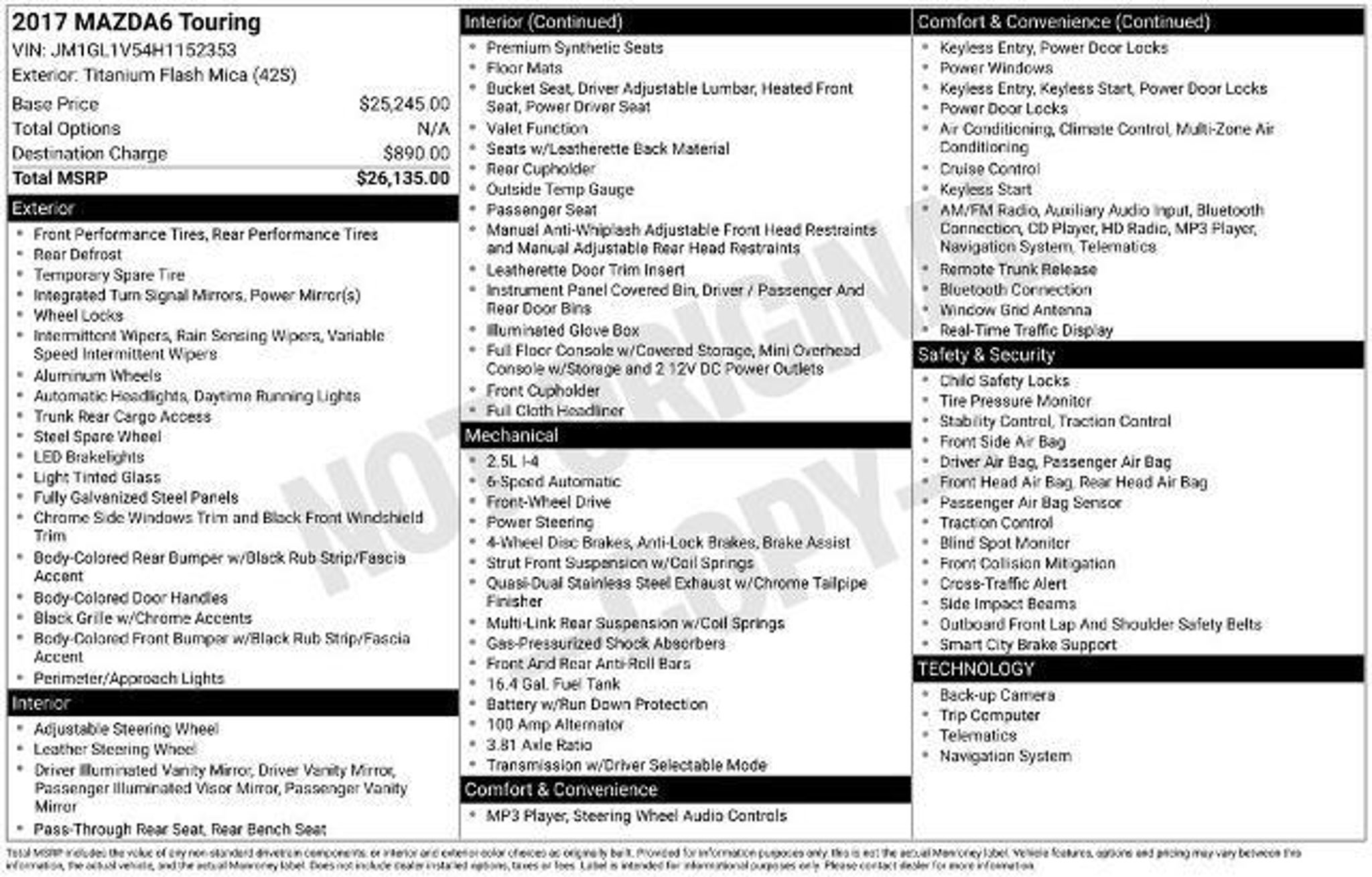 **FACTORY CERTIFIED WARRANTY**, **FREE DELIVERY WITHIN 200 MILES IN FLORIDA**, **NO DEALER FEES**, **4.6 STAR CUSTOMER RATED DEALERSHIP**, **BLIND SPOT MONITOR!**, **NAVIGATION!**, **LOCAL ORLANDO AREA TRADE**, **BLUETOOTH!**, **CRUISE CONTROL**, **CLEAN CARFAX**, **BACK-UP CAMERA W/ REVERSE SENSING SYSTEM**. THE FORD BLUE ADVANTAGE: BLUE CERTIFIED includes a 139 Point Inspection, Vehicle History Report, $100 Warranty Deductible, Roadside Assistance, 3 Month/4,000 Mile Limited Warranty (whichever comes first) from certified purchase date, and 11,000 FordPass Rewards Points to use toward first maintenance visit. Certification Program Details: Ford Blue Advantage: Blue Certified * 139 Point Inspection * Transferable Warranty * Vehicle History * Warranty Deductible: $100 * Roadside Assistance * Limited Warranty: 3 Month/4,000 Mile (whichever comes first) after new car warranty expires or from certified purchase date * and 11,000 FordPass Rewards Points to use toward first maintenance visit FWD SKYACTIV?-G 2.5L I4 DOHC 16V Clean CARFAX. Odometer is 18963 miles below market average! At Mullinax, there are NO DEALER FEES! JUST ADD TAX AND TAG! We save you over $900 vs. Our largest competitors every day! 2,500 vehicles to choose from! Awards: * 2017 IIHS Top Safety Pick * 2017 KBB.com 10 Best Used Cars Under $20,000 * 2017 KBB.com Brand Image Awards Reviews: * Very responsive engine and transmission make it feel faster than most family sedans; fuel economy is competitive with any car in the class; reassuring handling that makes it entertaining to drive; one of the best technology interfaces in the class; graceful styling inside and out. Source: Edmunds