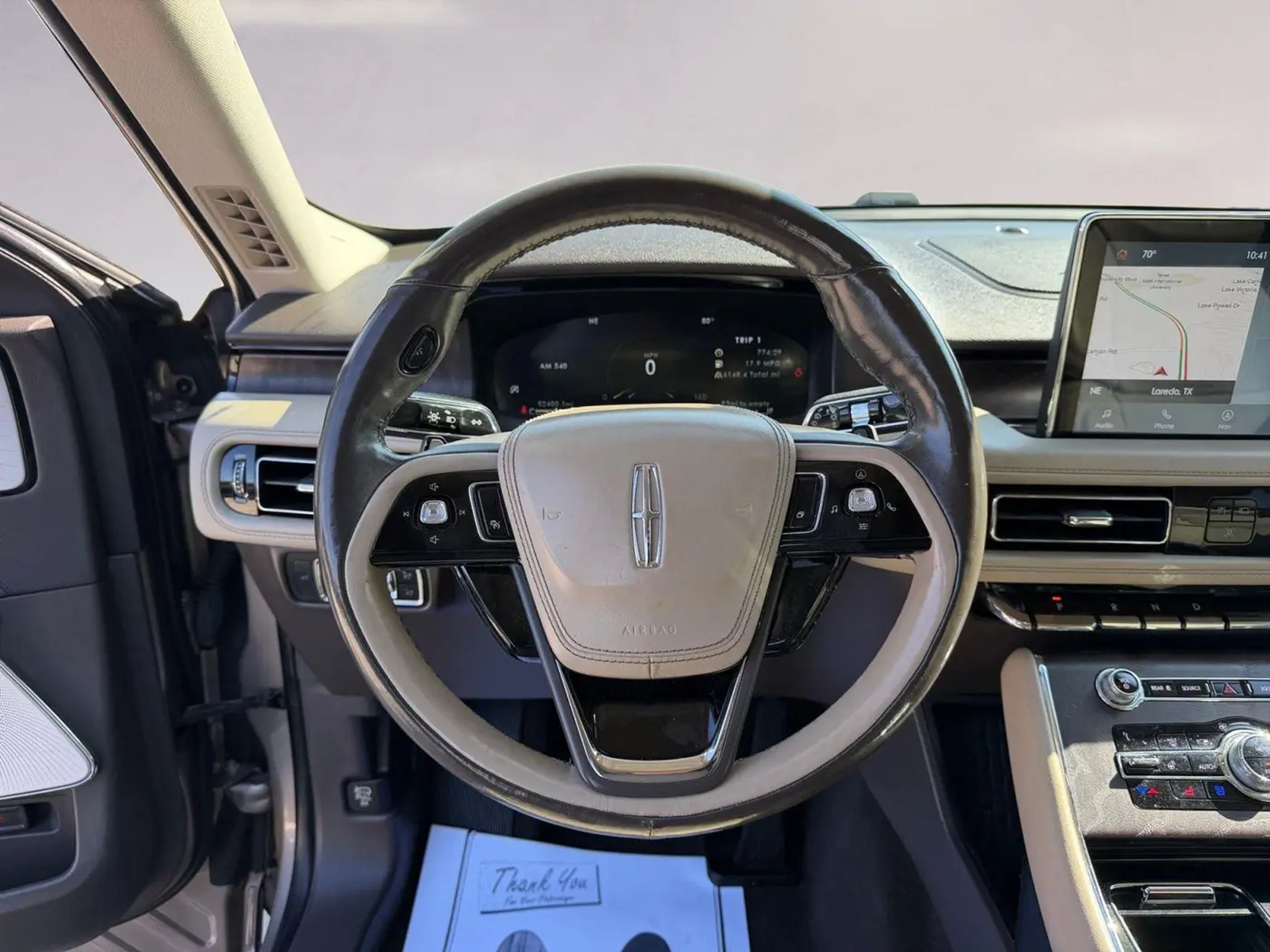 This 2020 Lincoln Aviator Reserve|has a Iced Mocha Metallic Premium Colorant exterior and Sandstone interior color with only 52,363 miles. Stock Number M26187A. You can connect with us by calling .\n \n\n\n One Owner! \n \n OTHER NOTABLE FEATURES AND OPTIONS YOU SHOULD KNOW ABOUT: \n\n Lincoln Co-Pilot360 Plus Evasive Steering Assist Reverse Brake Assist Adaptive Cruise Control with Traffic Jam Assist Active Park Assist Plus Elements Package Plus Heated/ventilated Driver & Passenger Seats Heated/ventilated 2nd Row Outboard Seats Heated Steering Wheel Heated VisioBlade Wipers Luxury Package ($3,300 value) Revel Ultima 3D Audio System with 28 Speakers Rear Door Sunshades 30-Way Perfect Position Seats with Active Motion Equipment Group 201A ($4,430 value) Panoramic Vista Roof with Power Shade 10-Speed Automatic Transmission with SelectShift Twin-Turbocharged 3.0L V6 Engine Premium Leather Enhanced Micro-Perforated Seats 3.58 Axle Ratio 6,360 lbs GVWR 255/55R20 All-Season Tires 20 Bright Machined Aluminum Wheels \n\n\n\n Safety and Security Forward collision mitigation - Forward thinking. You look away for just a second and suddenly the vehicle in front of you has stopped. That's when the forward collision mitigation system comes to life. When it senses an impending impact, it will activate a combination of features to help prevent or reduce the severity of an accident. Forward collision mitigation is always looking ahead. Pedestrian impact prevention - An extra step toward safety. Pedestrians don't always stop, look, and listen, but with Pedestrian Impact Prevention, your vehicle is equipped to better see them and avoid them. This system constantly monitors the road ahead to identify and track pedestrians. It projects that image to an interior display screen, AND should an impact become likely, Pedestrian impact prevention takes steps to avoid a collision. Hands-on cruise control. Set it and forget it. Road trips used to be stressful. Cruise control only managed speed, but not distance or safety. Now, with hands-on cruise control, simply set your desired speed and let sensor technology maintain a safe distance between you and surrounding vehicles. It slows you down; speeds you up and even keeps you in your own lane. Meet your ultimate co-pilot with hands-on cruise control. Technology and Telematics Smart device mirroring - Smartphone, meet smart car. You can control your device through your vehicle's infotainment system. Smart device mirroring brings together safety and convenience by making it easier to find what you're looking for while keeping your eyes on the road. Smart device mirroring - Smartphone, meet smart car. You can control your device through your vehicle's infotainment system. Smart device mirroring brings together safety and convenience by making it easier to find what you're looking for while keeping your eyes on the road. \n\nENGINE: TWIN-TURBOCHARGED 3.0L V6 \n At Mercedes-Benz of Laredo, we're here to Serve you! Our staff is 100% dedicated to customer satisfaction and we understand that you need clear, transparent information throughout the car buying process. With our live market pricing philosophy, we offer the right cars at the right price, and the transparency to back it up!\n